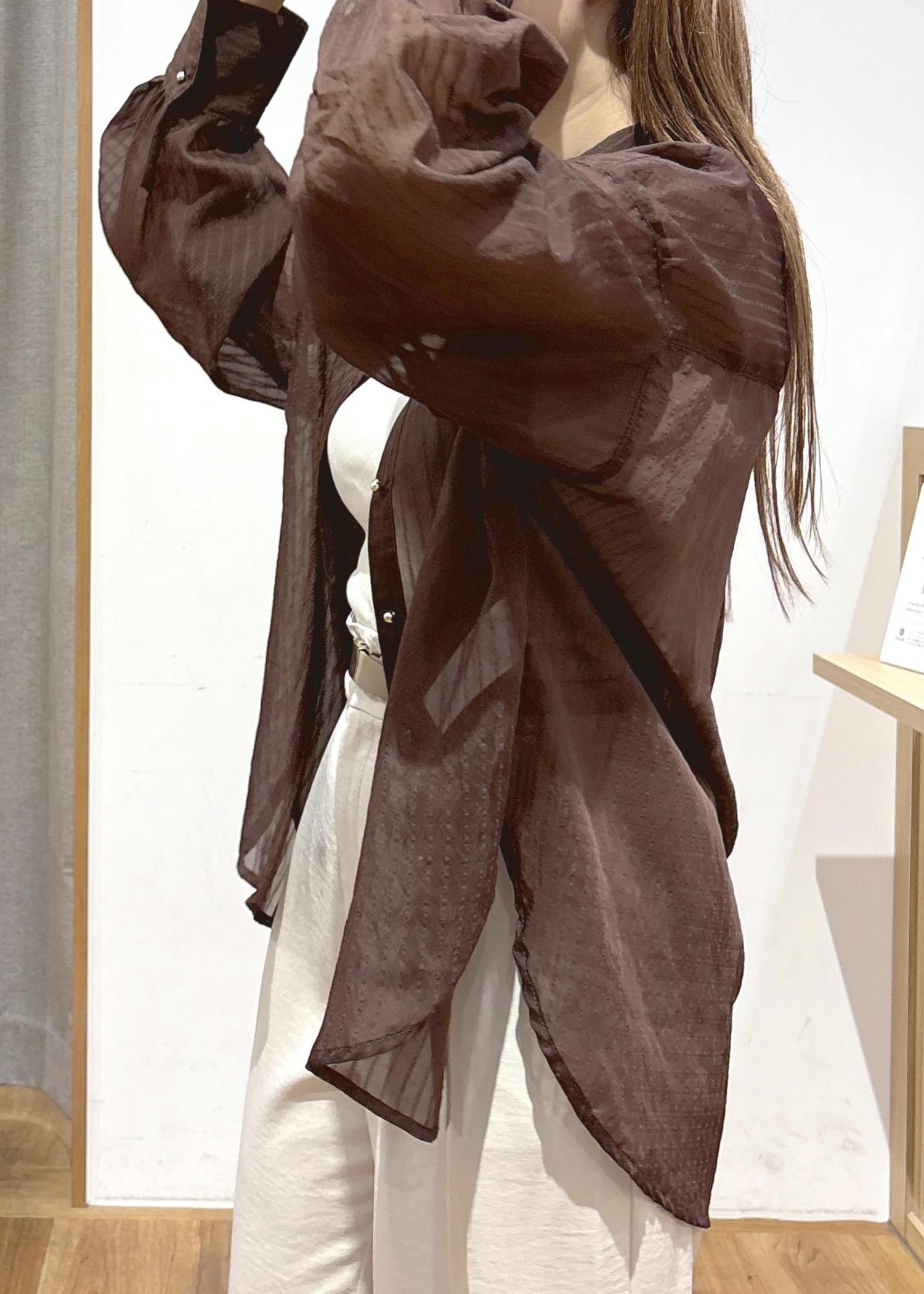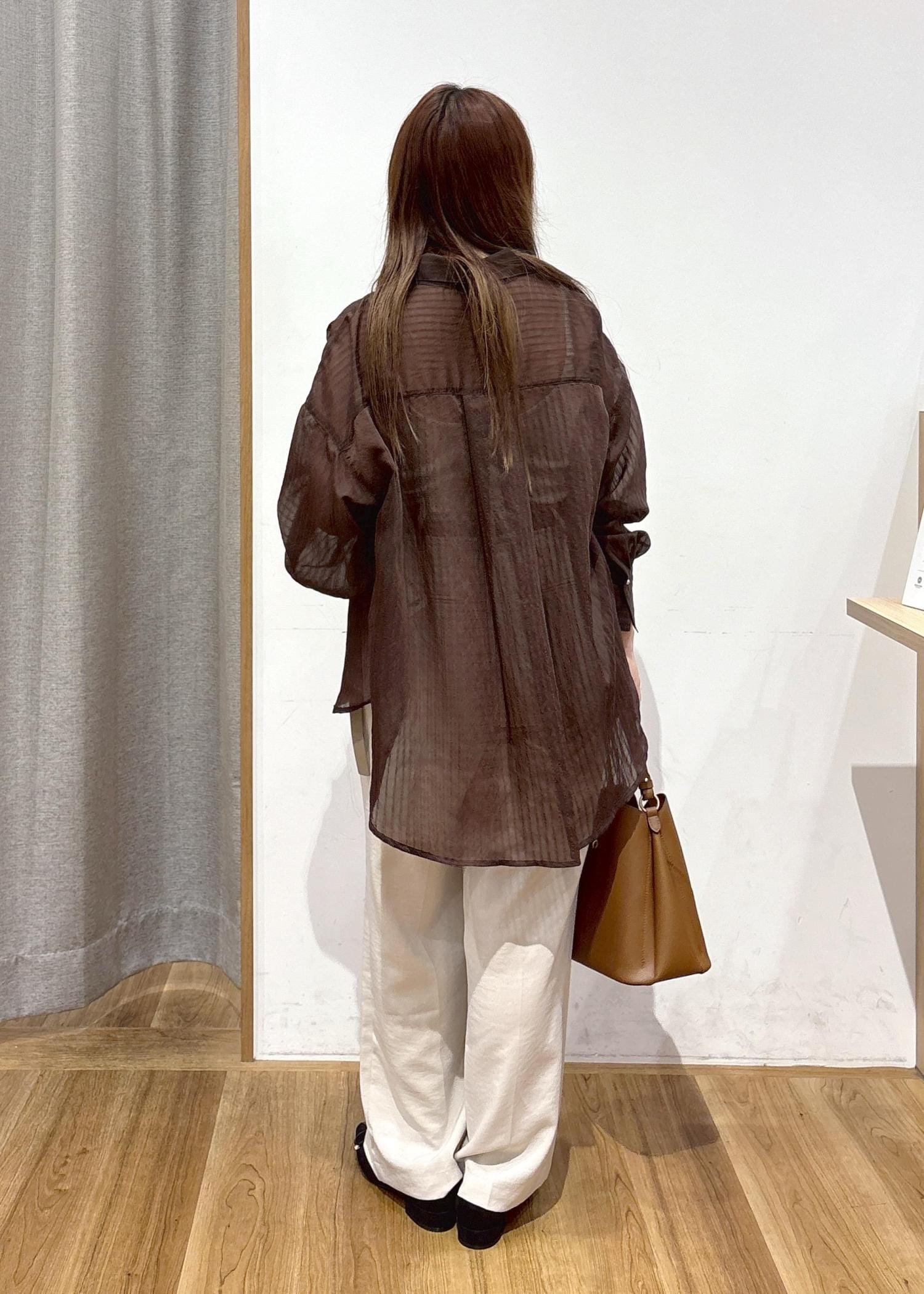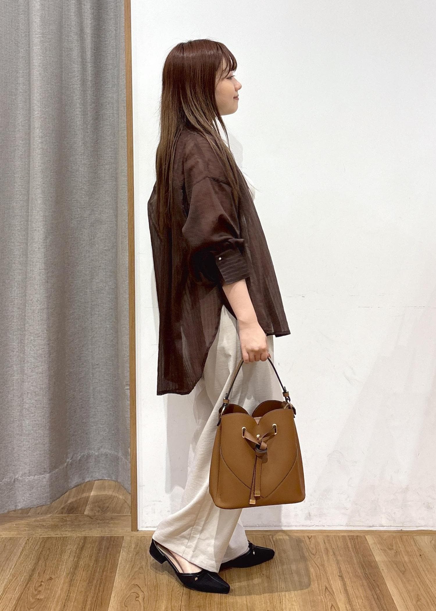 羽織るだけで一気に秋らしくなるブラウンのシアーシャツと、第2のポイントになっているブラウンのハートカットバッグの組み合わせが◎