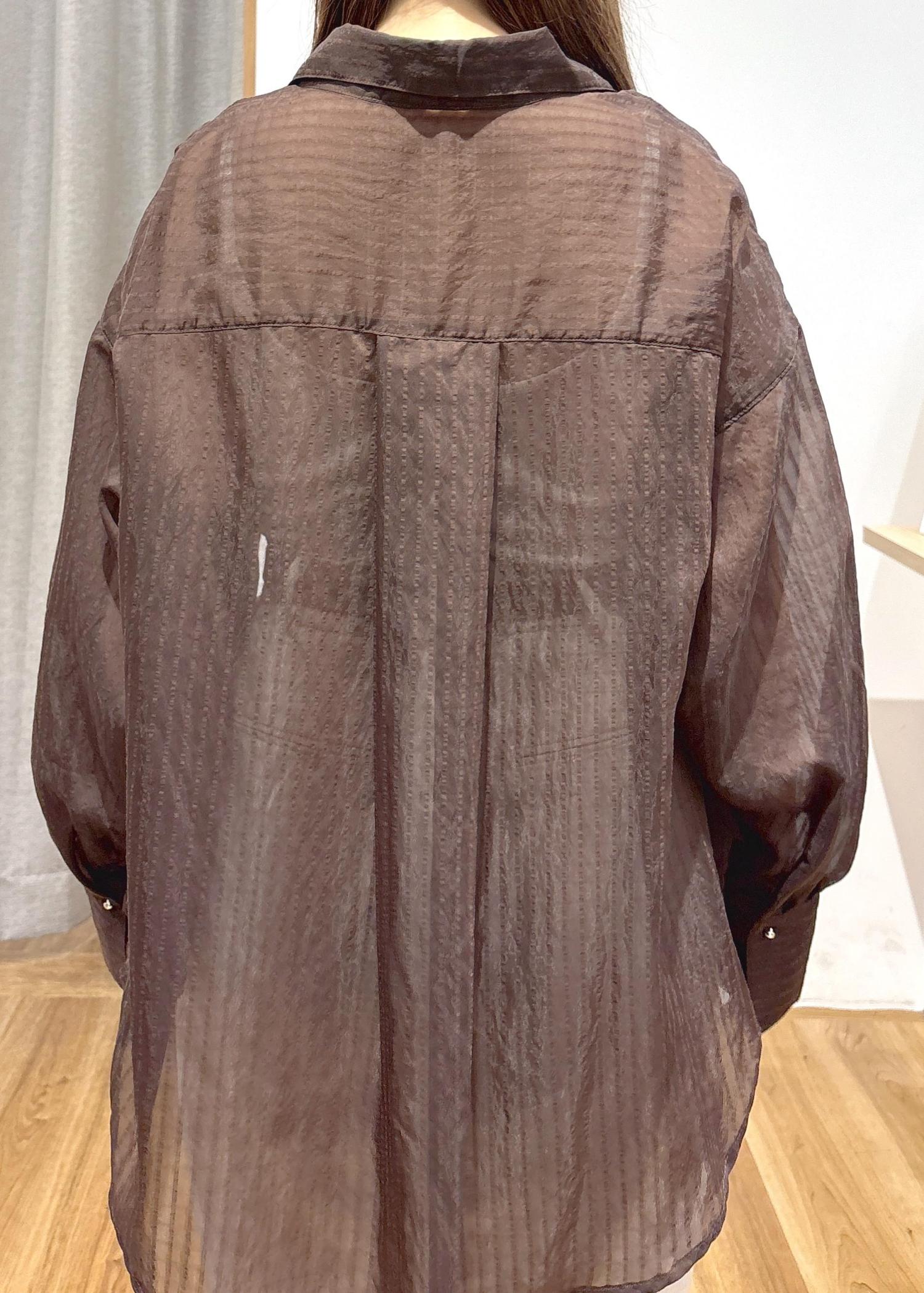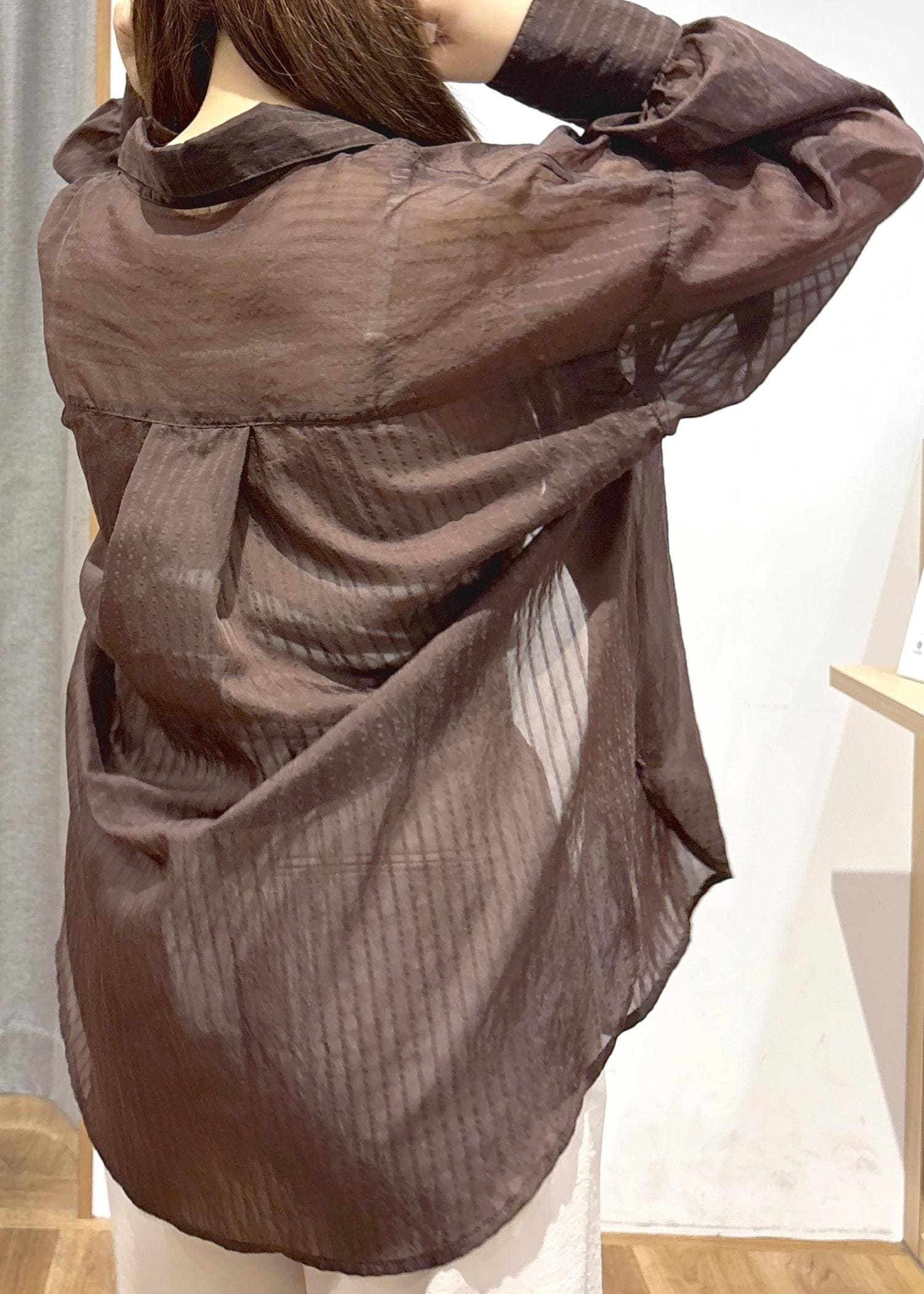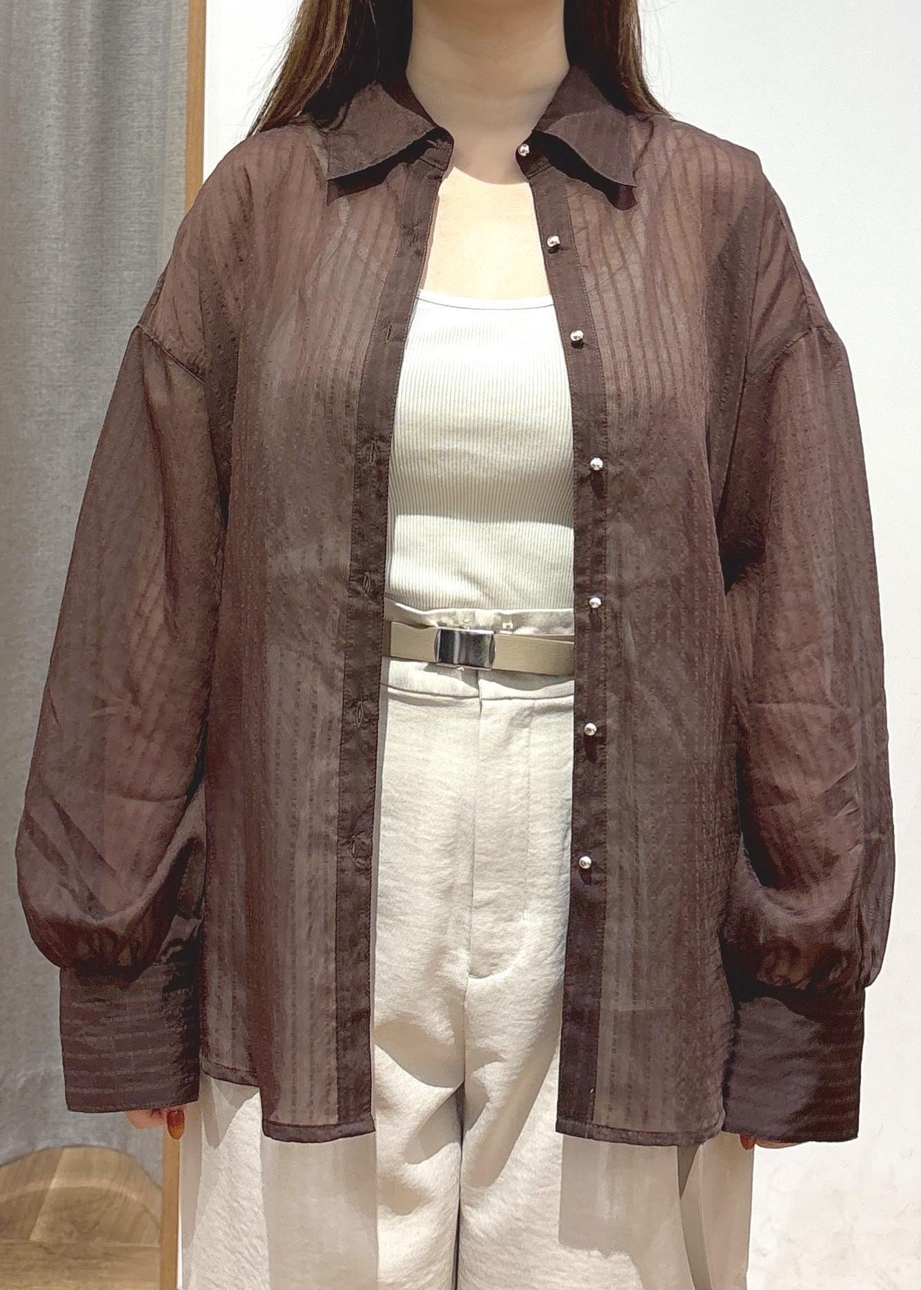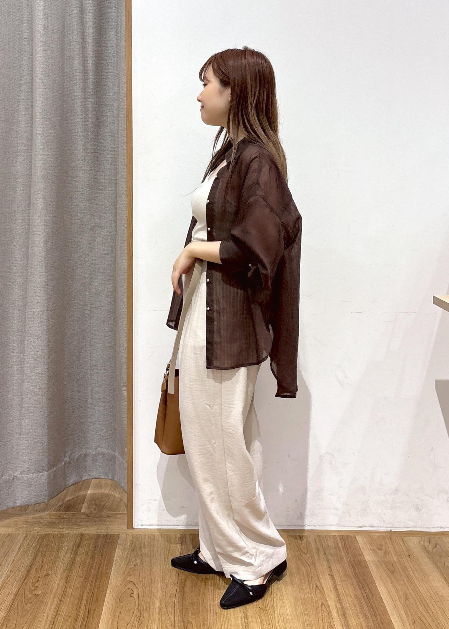 羽織るだけで一気に秋らしくなるブラウンのシアーシャツと、第2のポイントになっているブラウンのハートカットバッグの組み合わせが◎