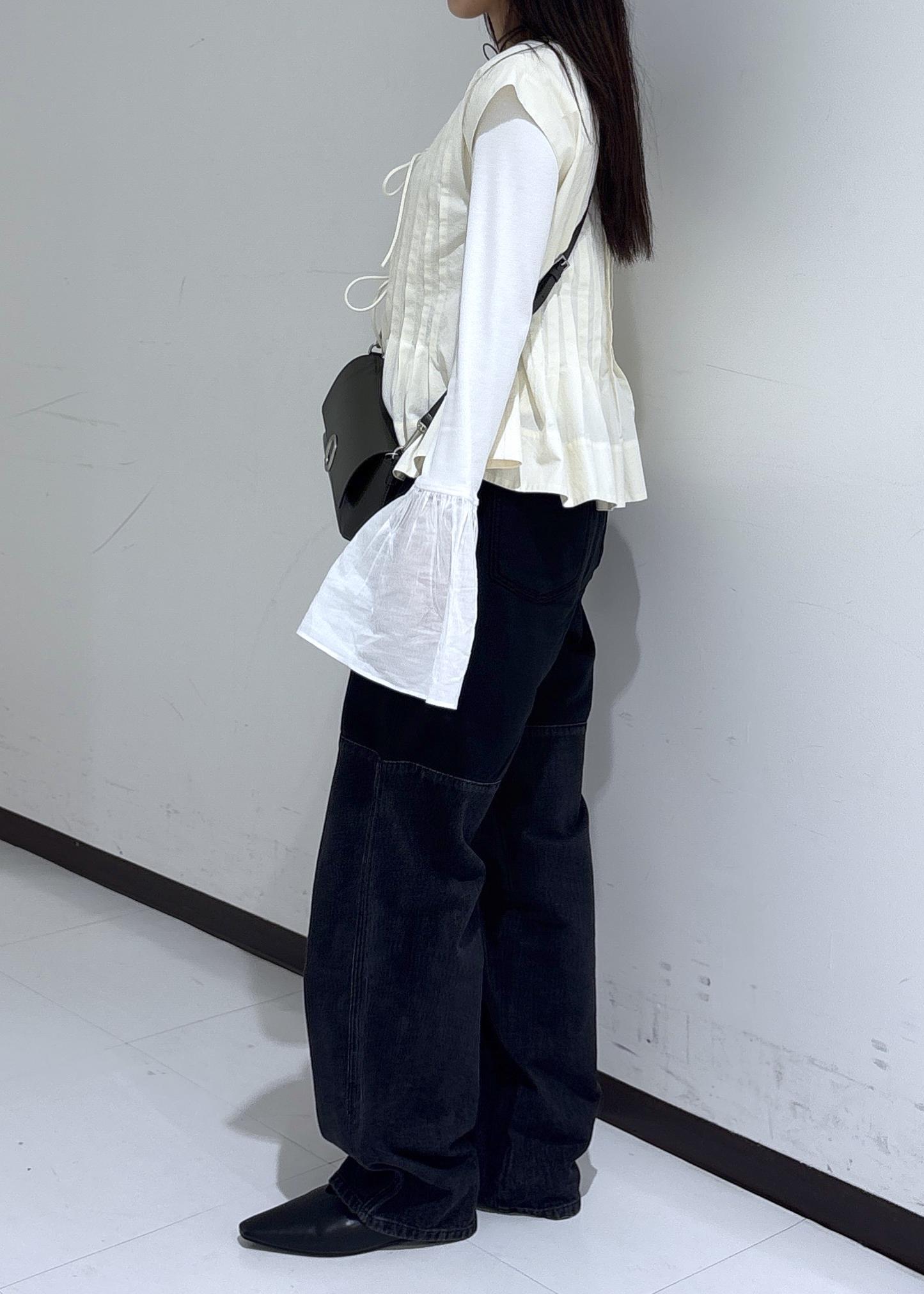 トップスにブラウスを合わせると、女性らしく可愛らしいフェミニンな雰囲気になります。