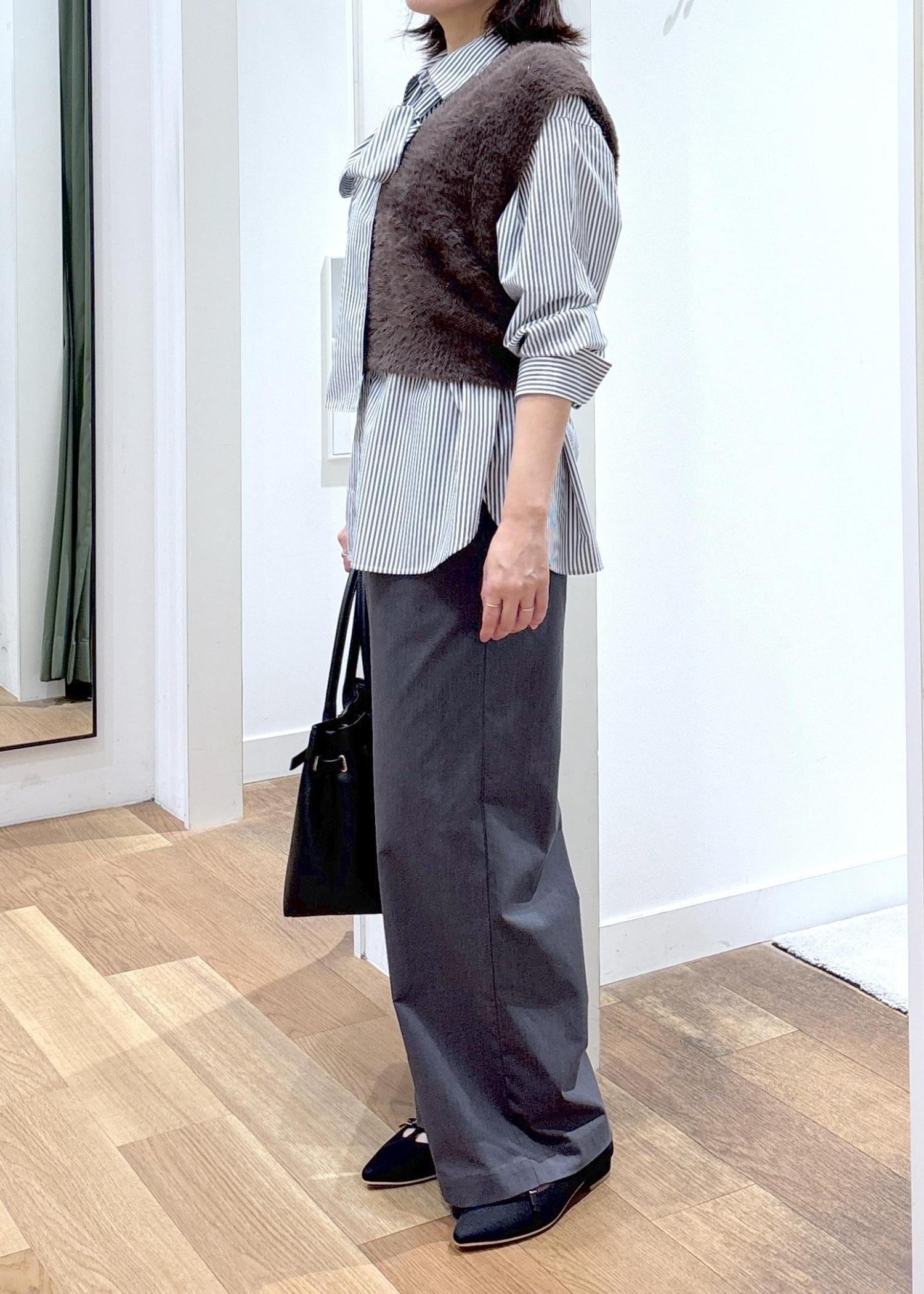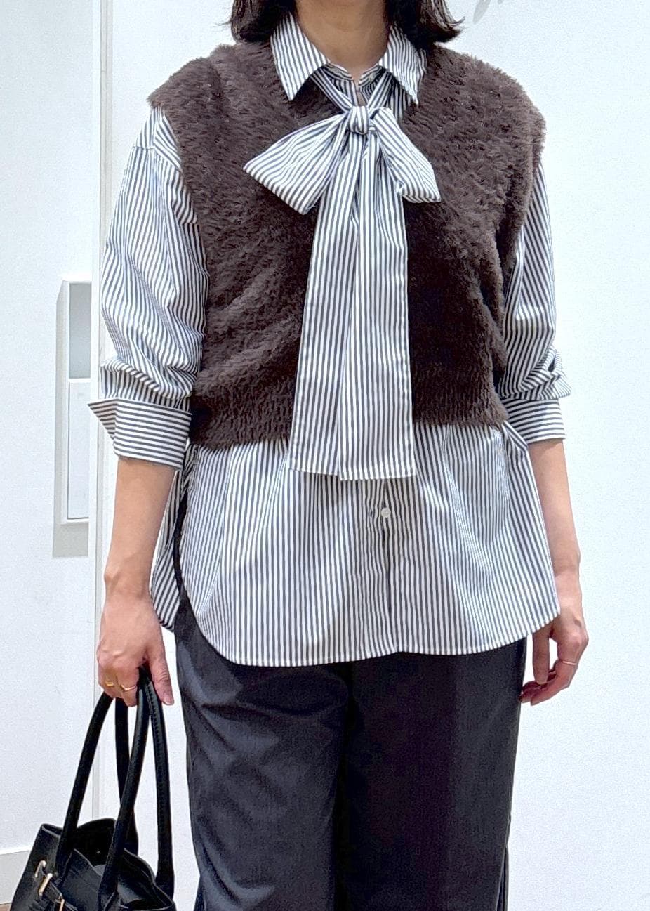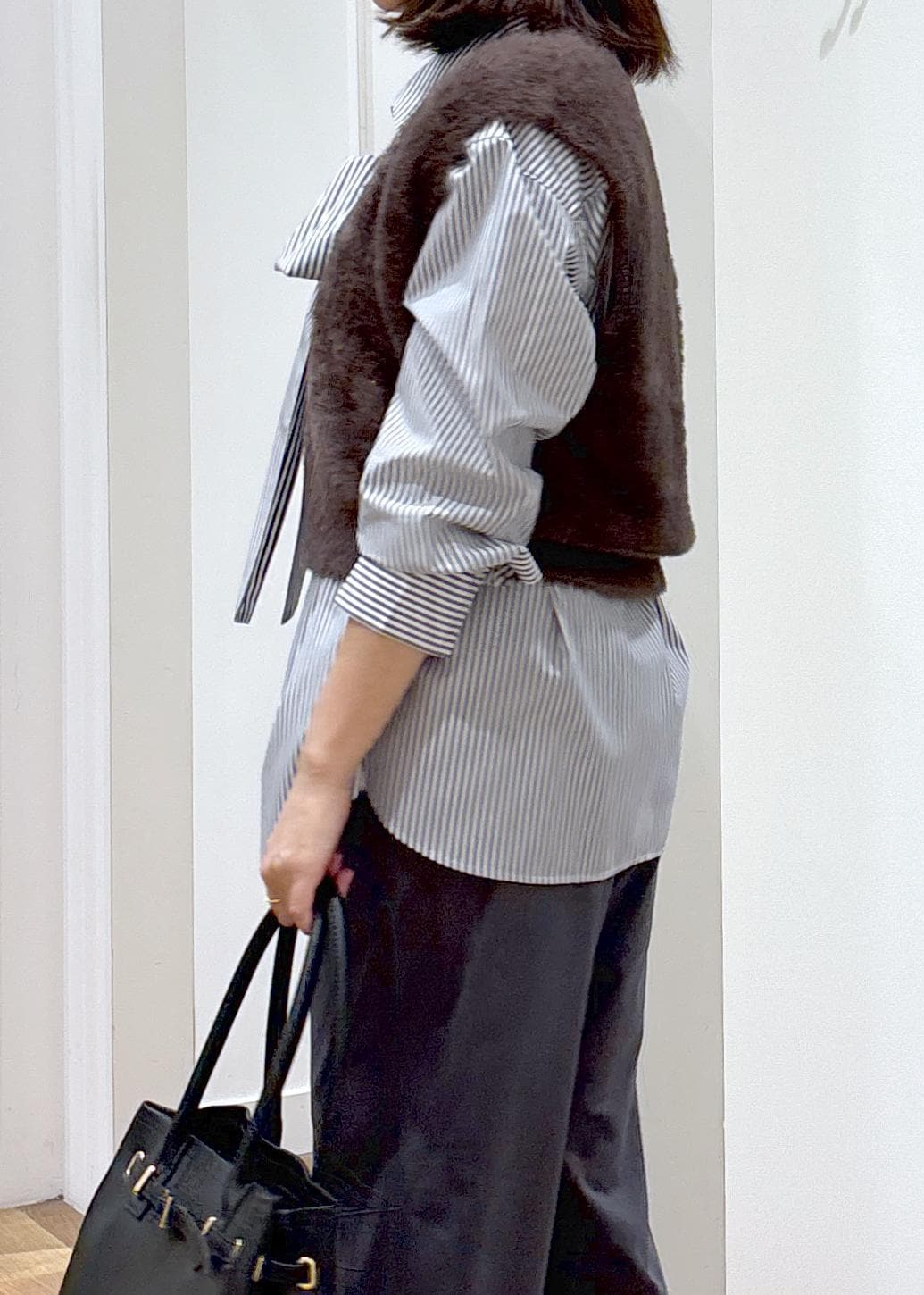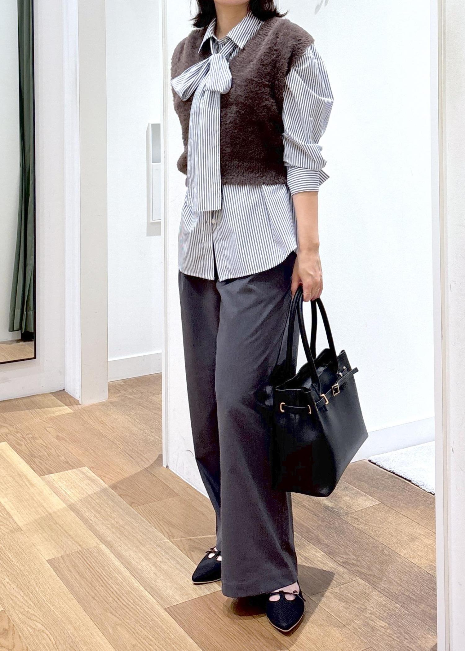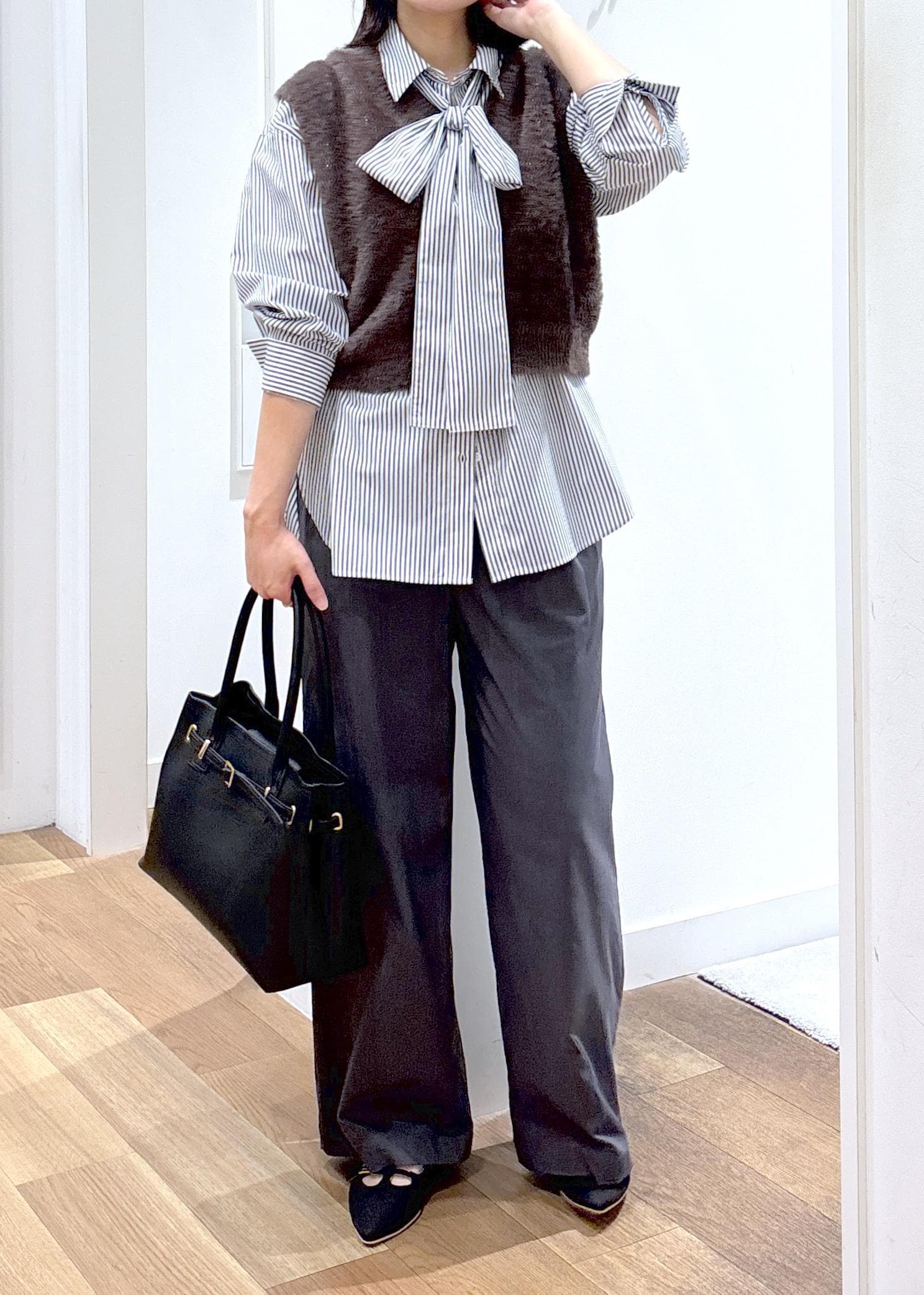 綺麗め要素としてタイ付きシャツとクラシカルバッグを合わせ、