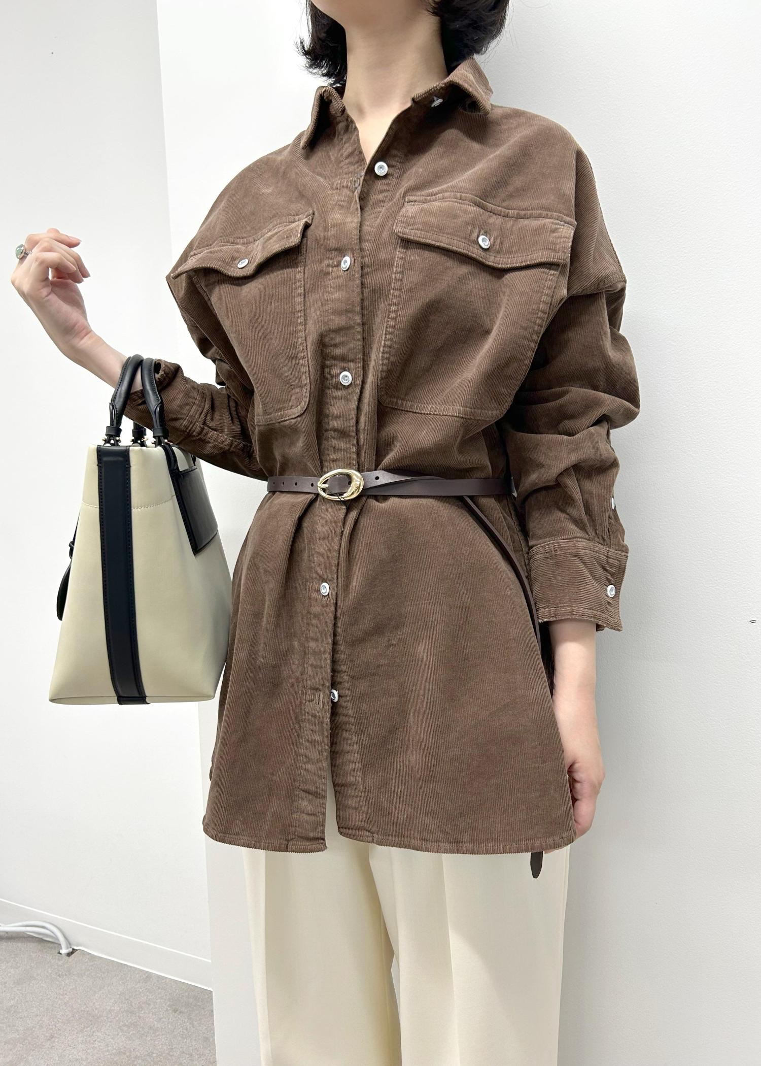 ROPÉ SELECT【Healthy denim(ヘルシーデニム)】一部別注Almondコーデュロイビッグシャツ/イージーケアダークブラウン / M¥20,900レビュー丈はヒップがすっぽり隠れる長さです。見頃はオーバーサイズですが襟と袖口はスッキリしているのでバランスが良いです。張りがあるしっかりした生地で柔らかさもあり軽い着心地です。ヴィンテージっぽいボタンがポイントになります。