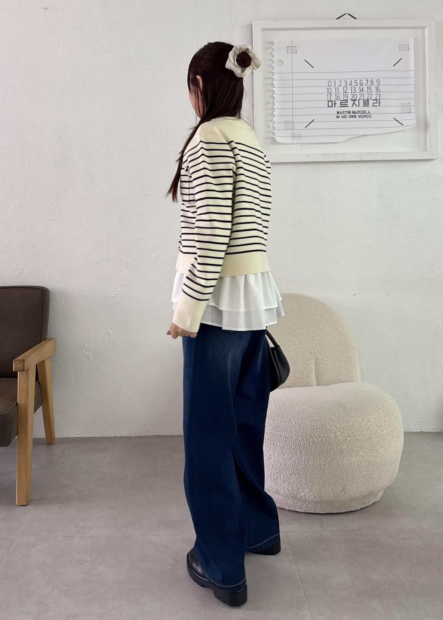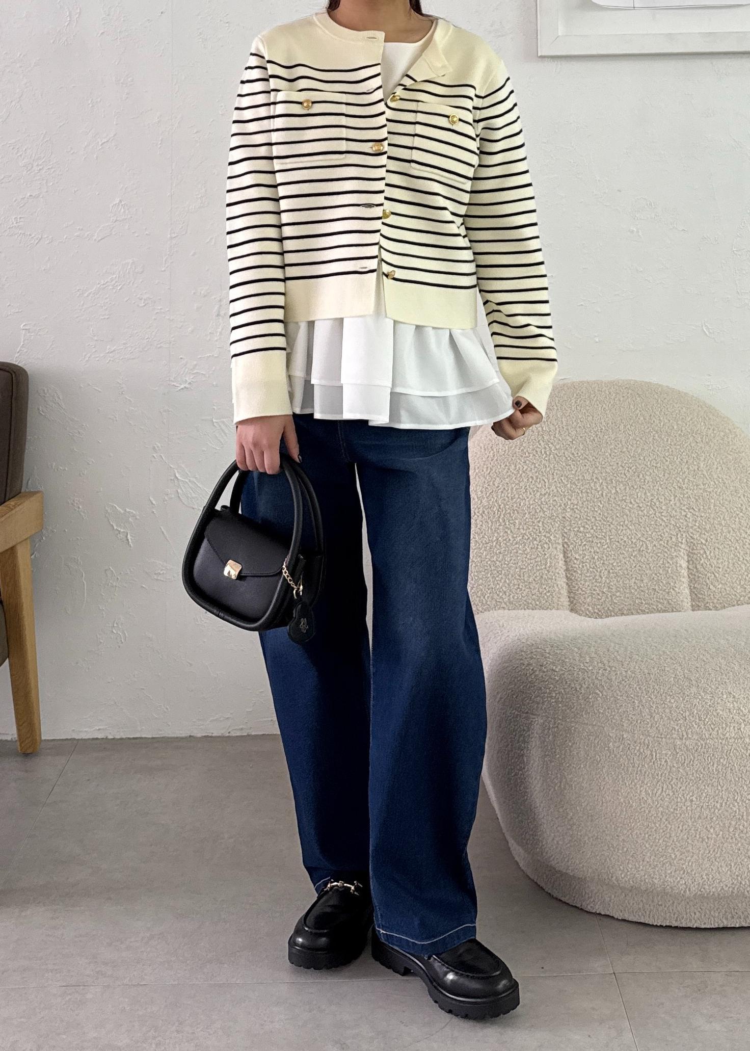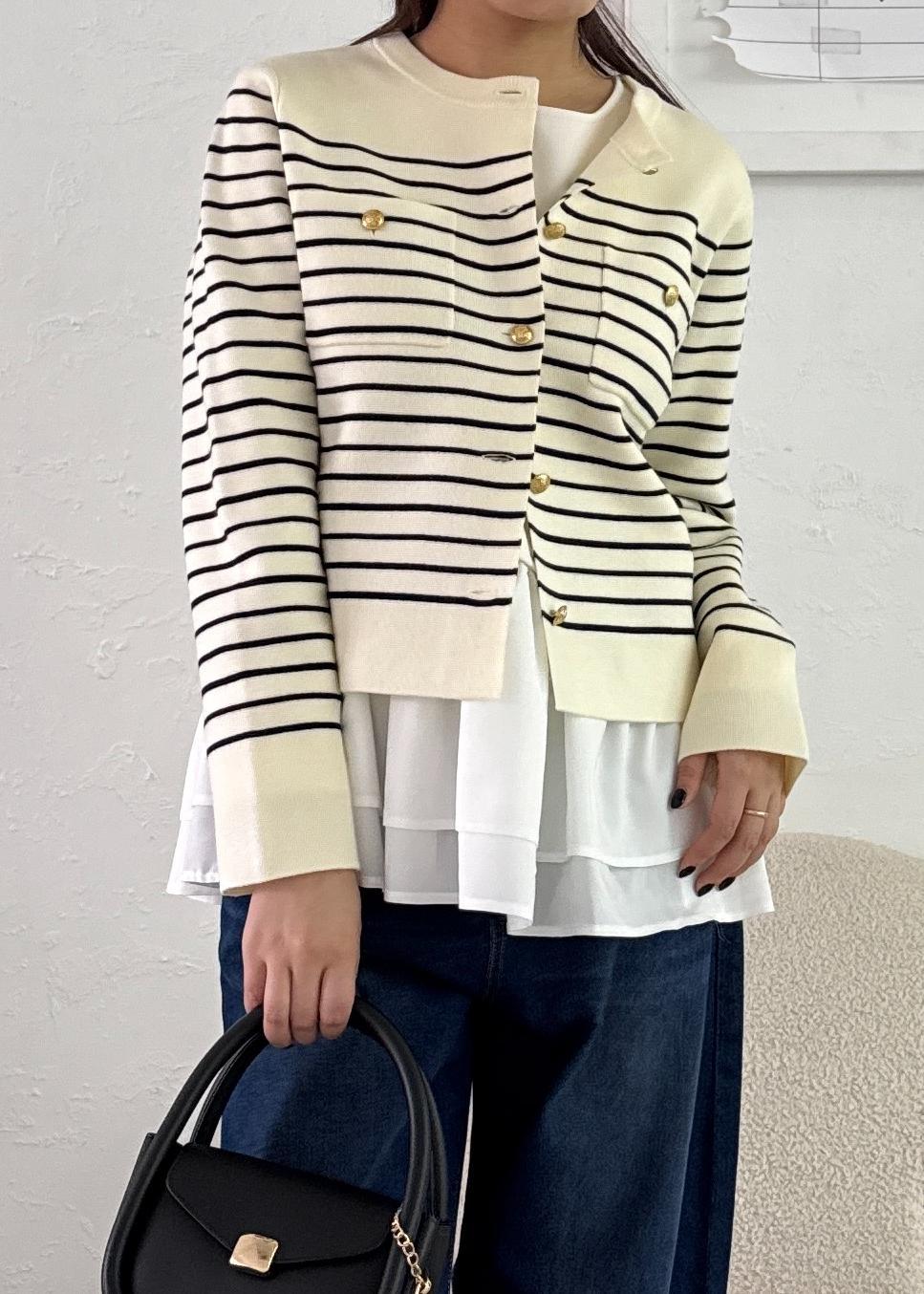 金ボタンとボーダーがフレンチシックで上品な印象のカーディガンにペプラム丈のトップスをレイヤードしたトレンド感のあるコーディネートです。