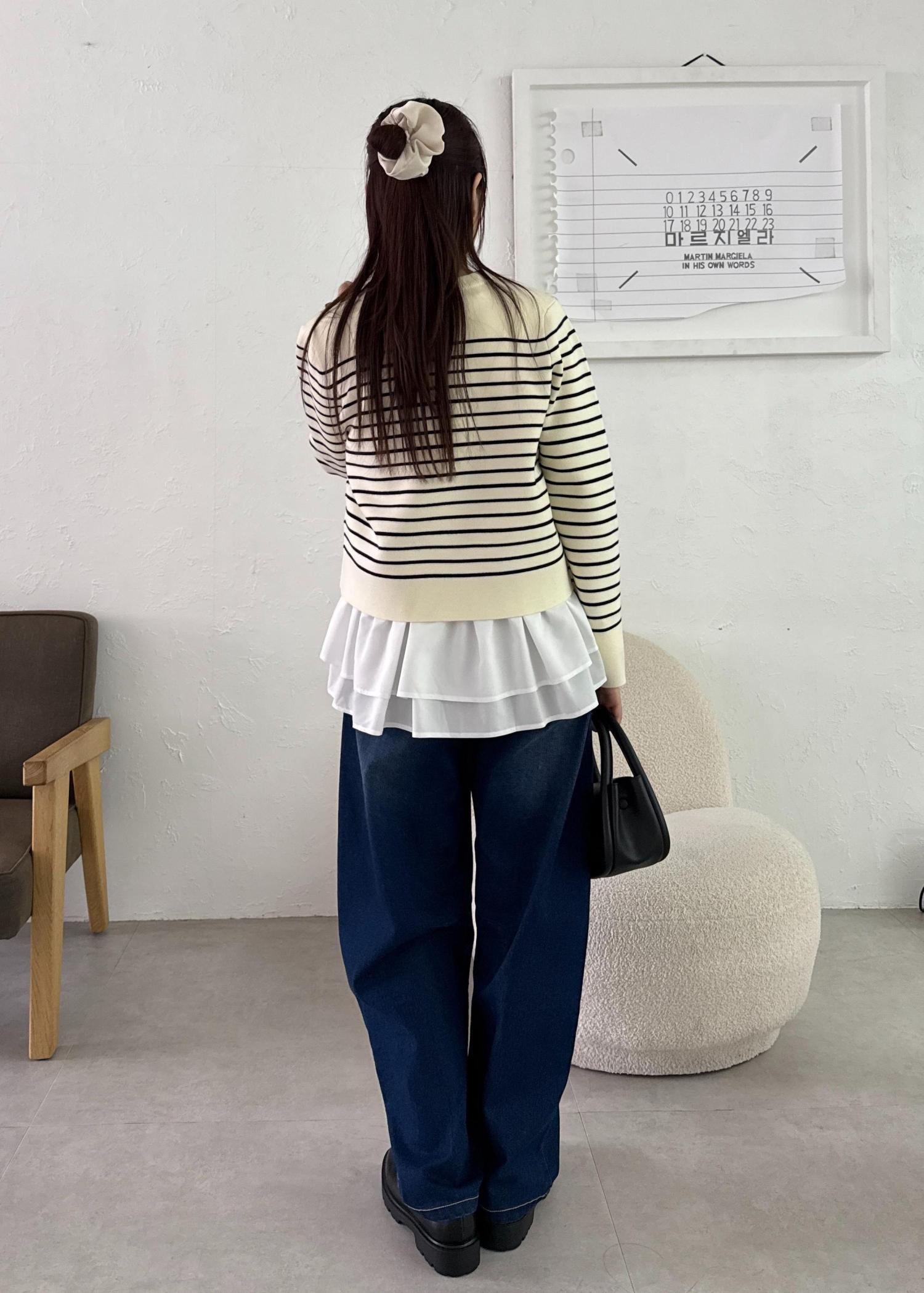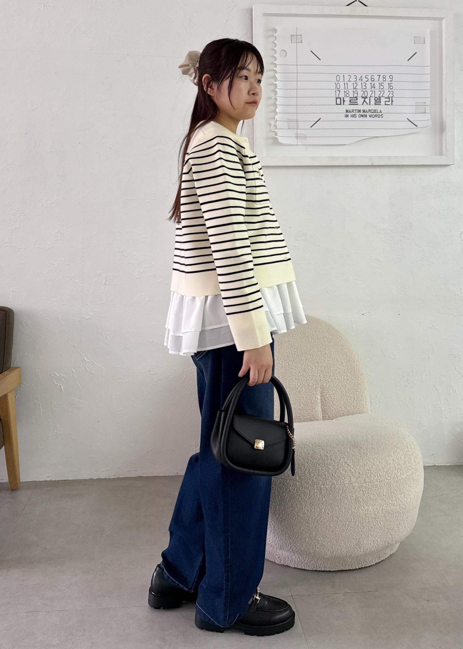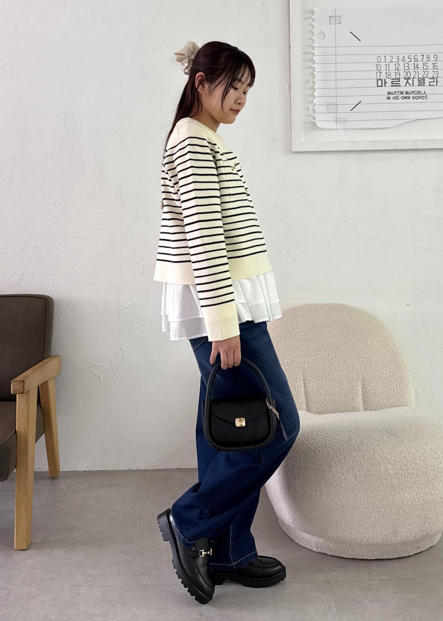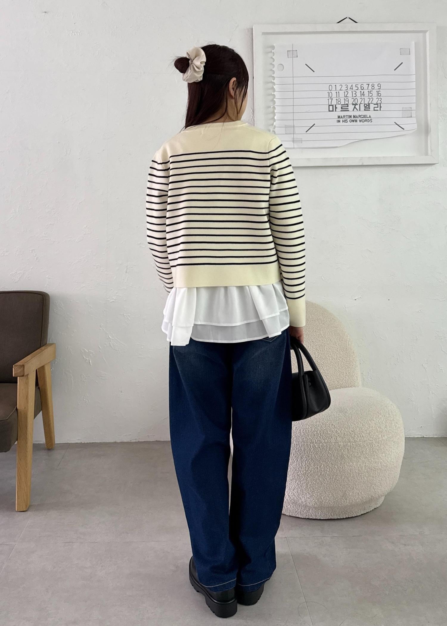 金ボタンとボーダーがフレンチシックで上品な印象のカーディガンにペプラム丈のトップスをレイヤードしたトレンド感のあるコーディネートです。