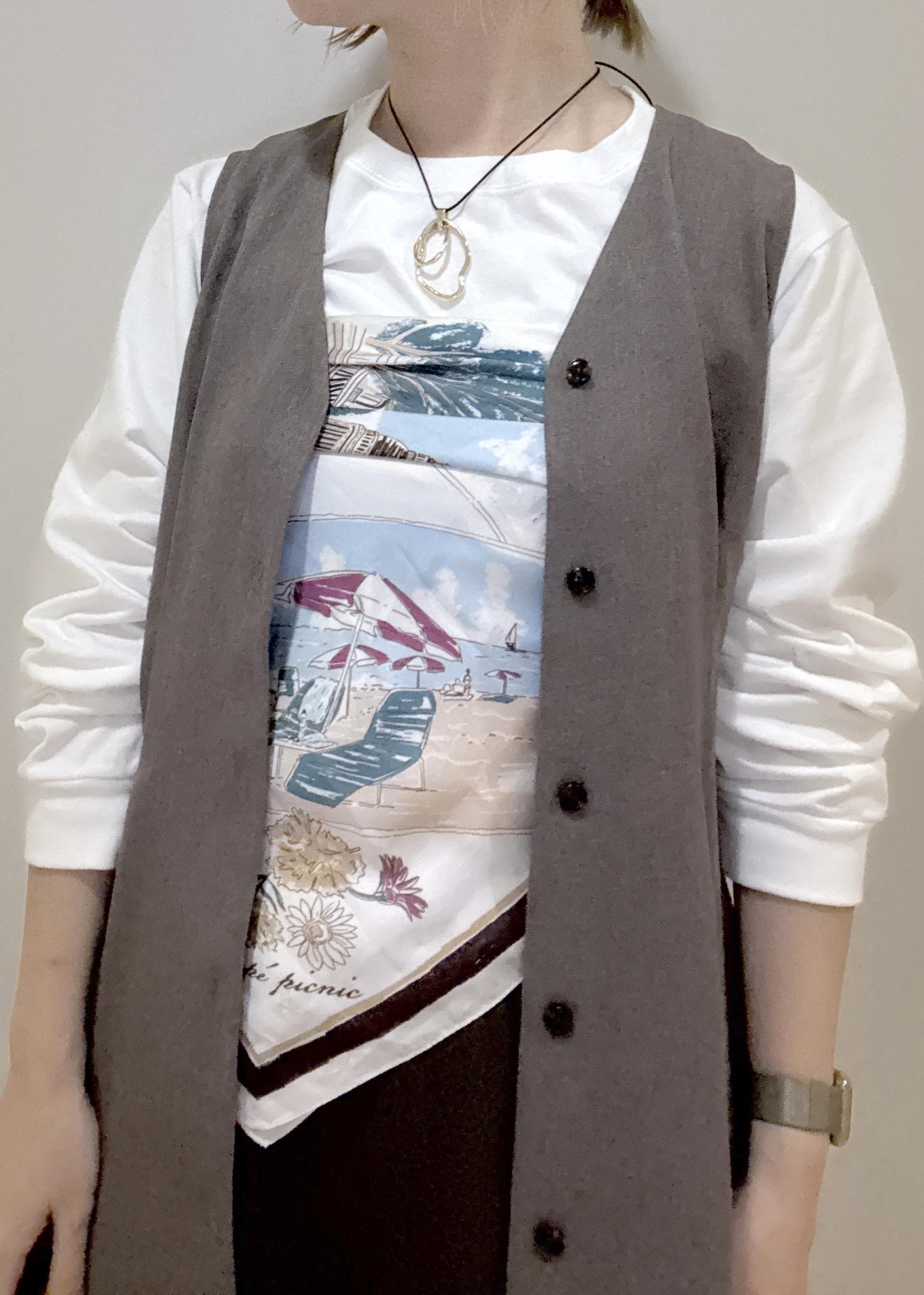 大判スカーフをビスチェ風に巻いてジレを重ねたレイヤードコーデです。