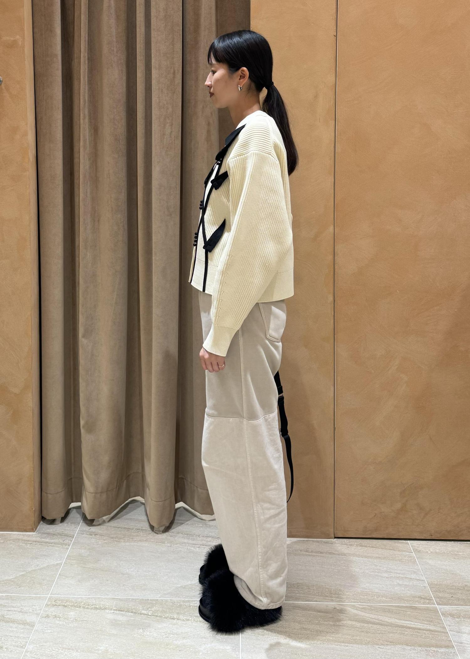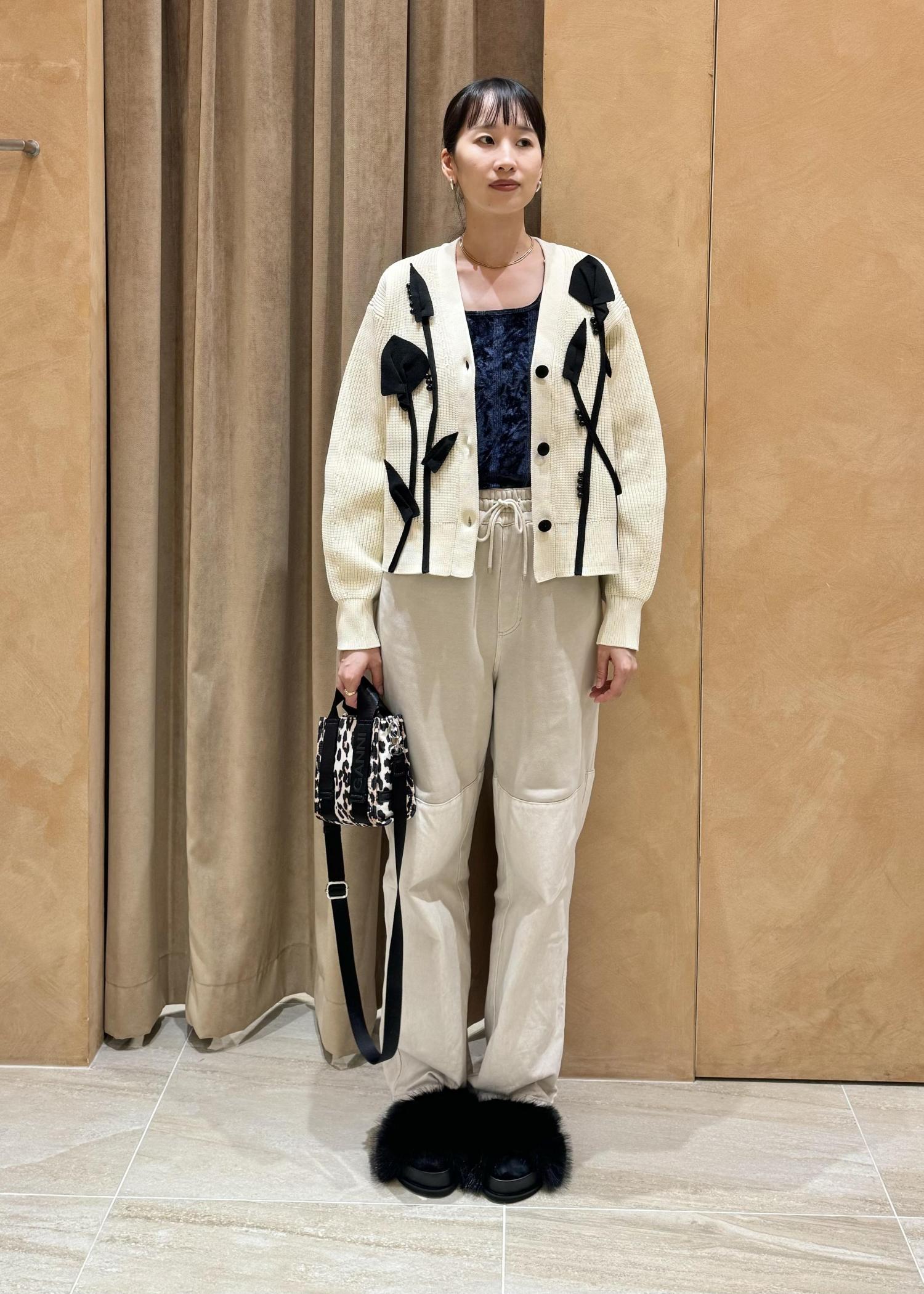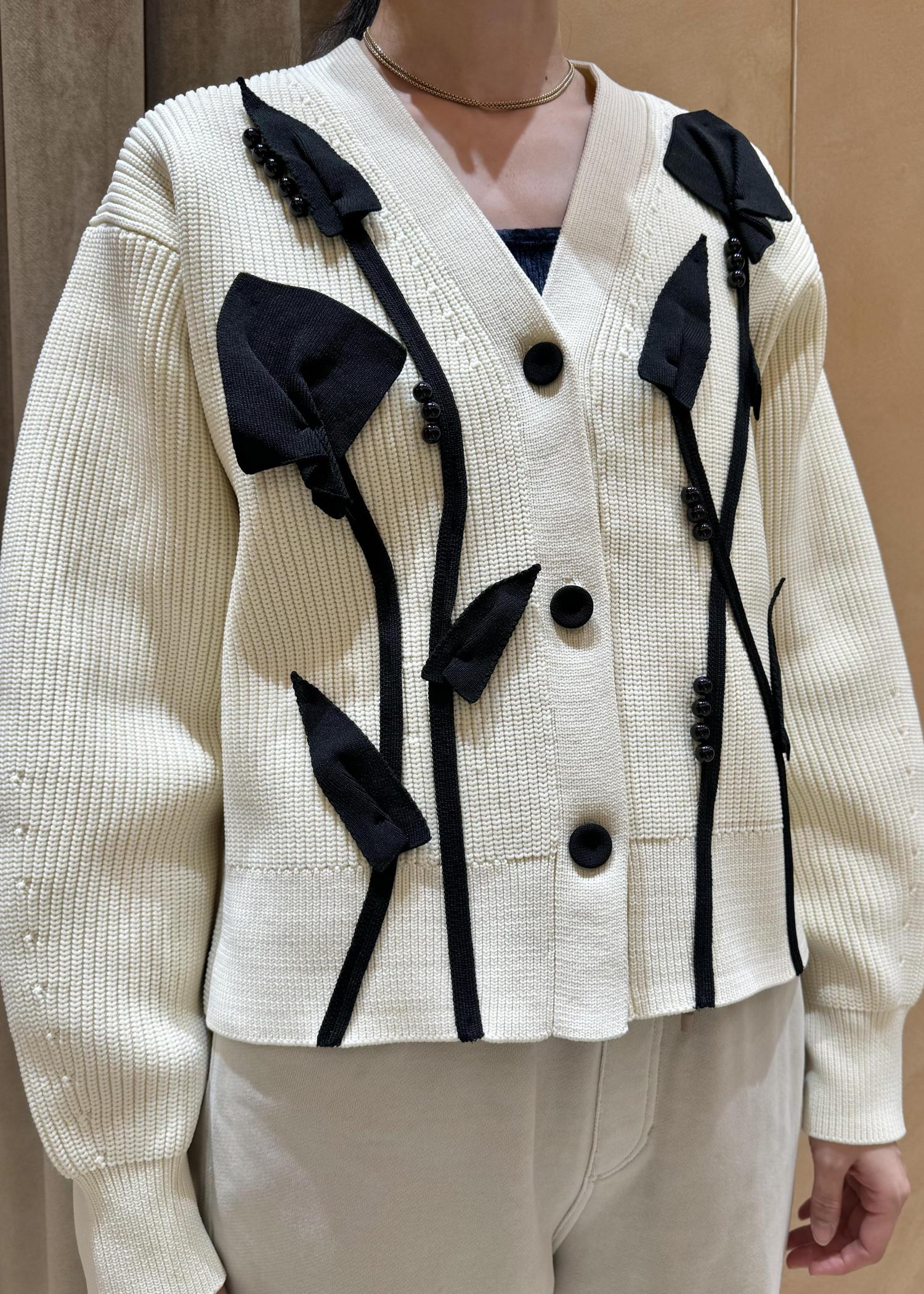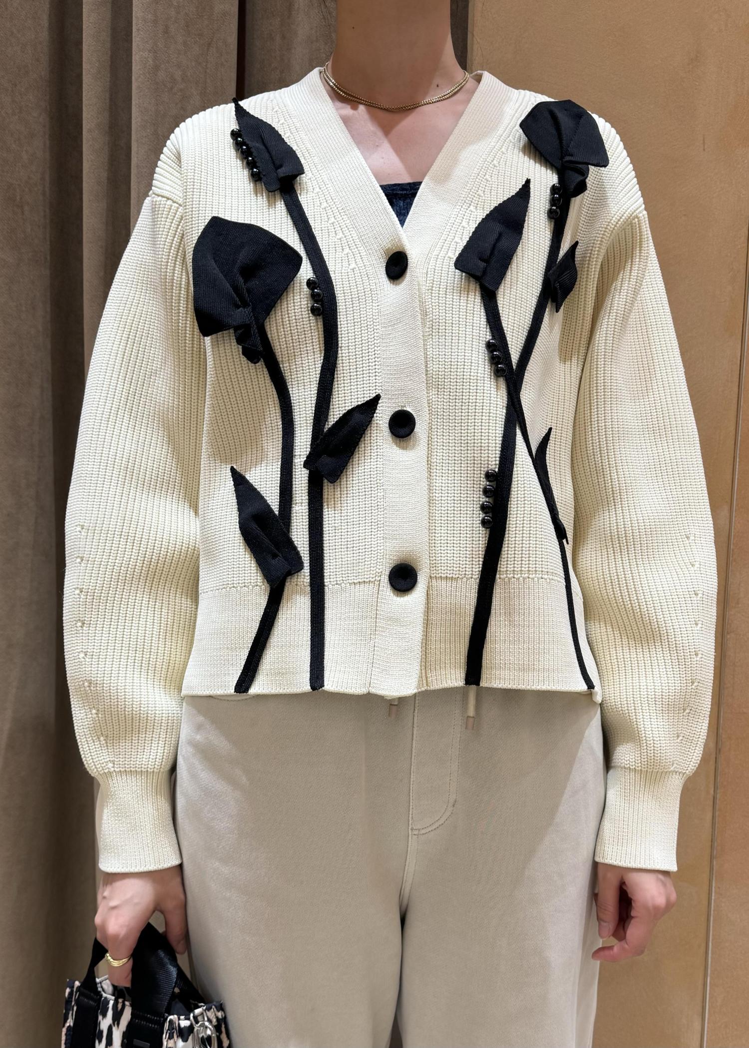 カーディガンとしてもプルオーバーとしても華やかなニットカーディガンのスタイリングです。