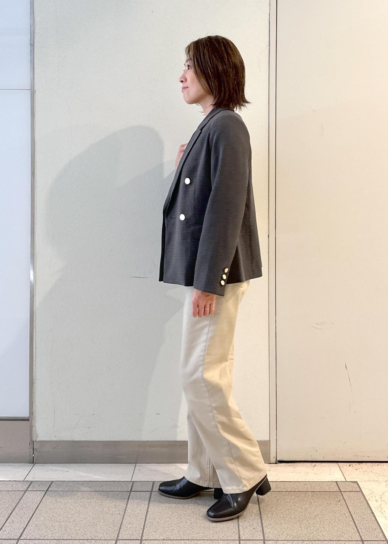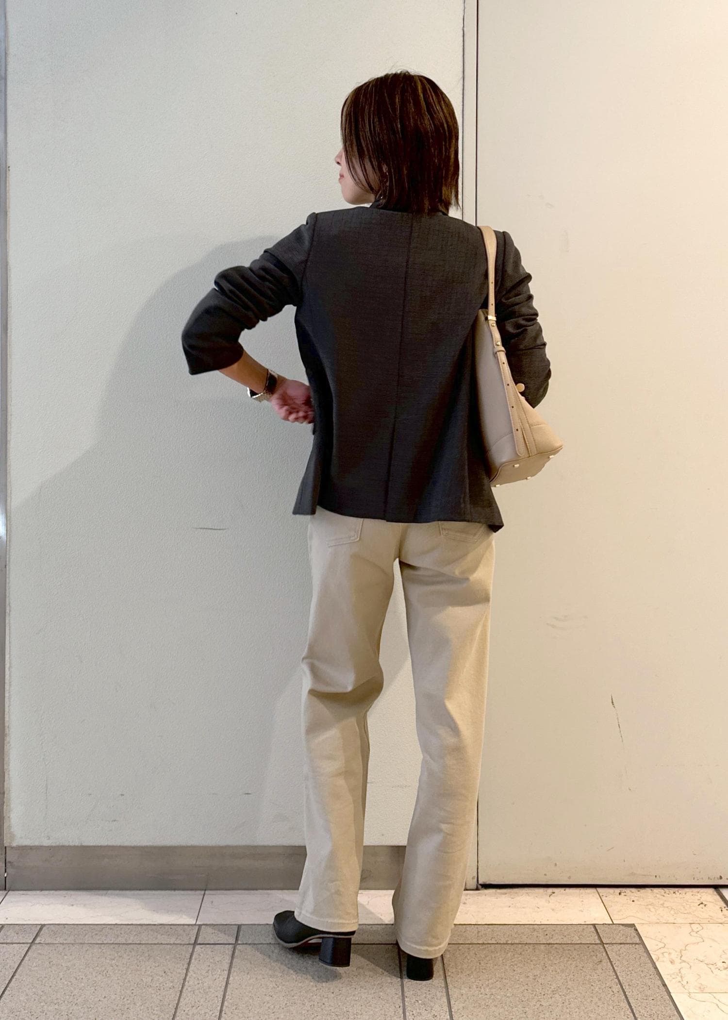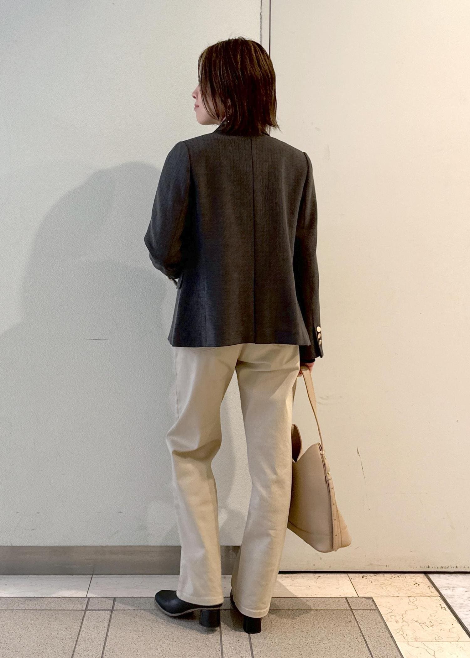 袖丈はちょうど良く、腕周りにゆとりが感じられます。着丈は腰まわりが隠れややお尻にかかる位の長さです。裏地は半裏なので軽やかさがあります。 -
