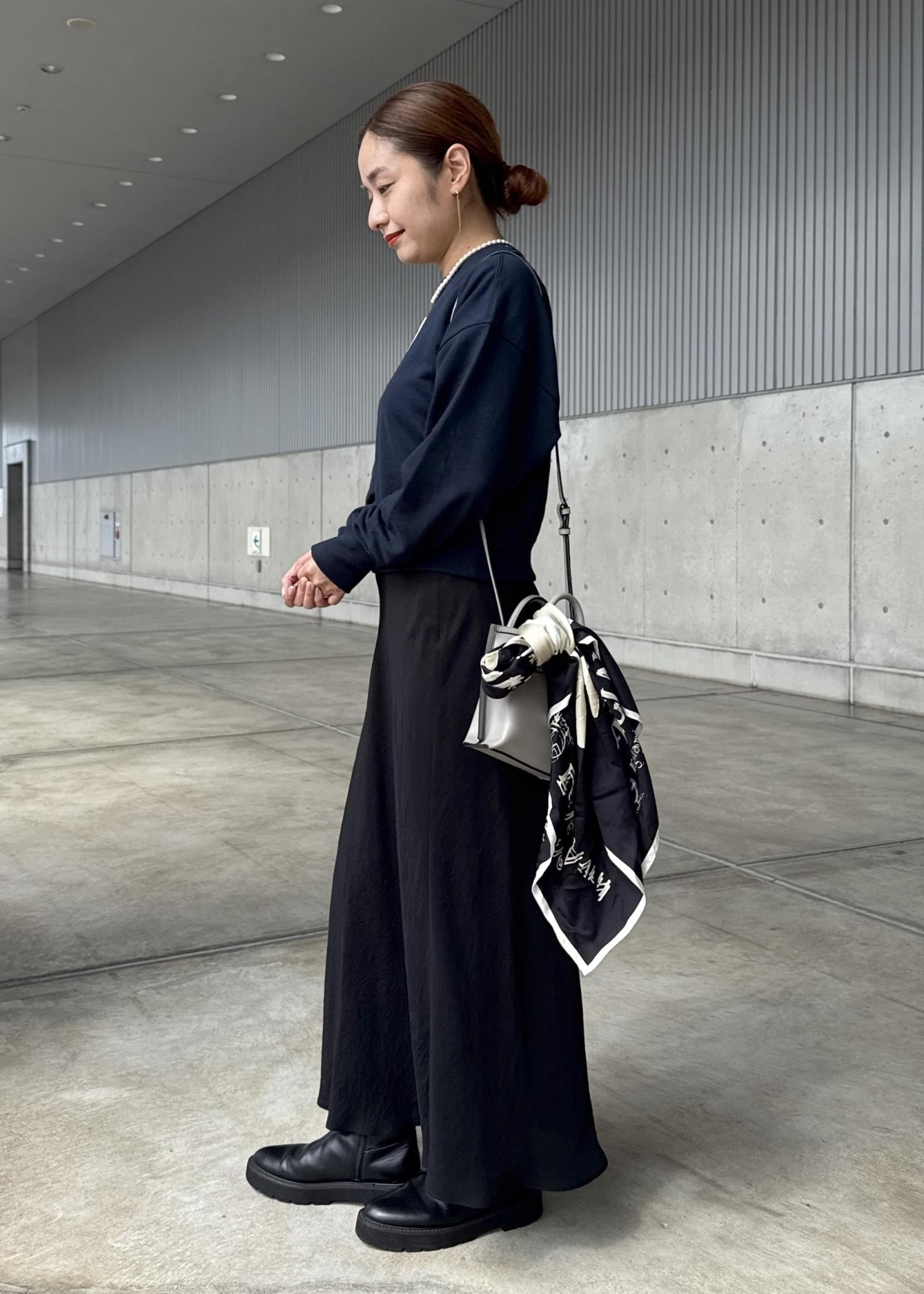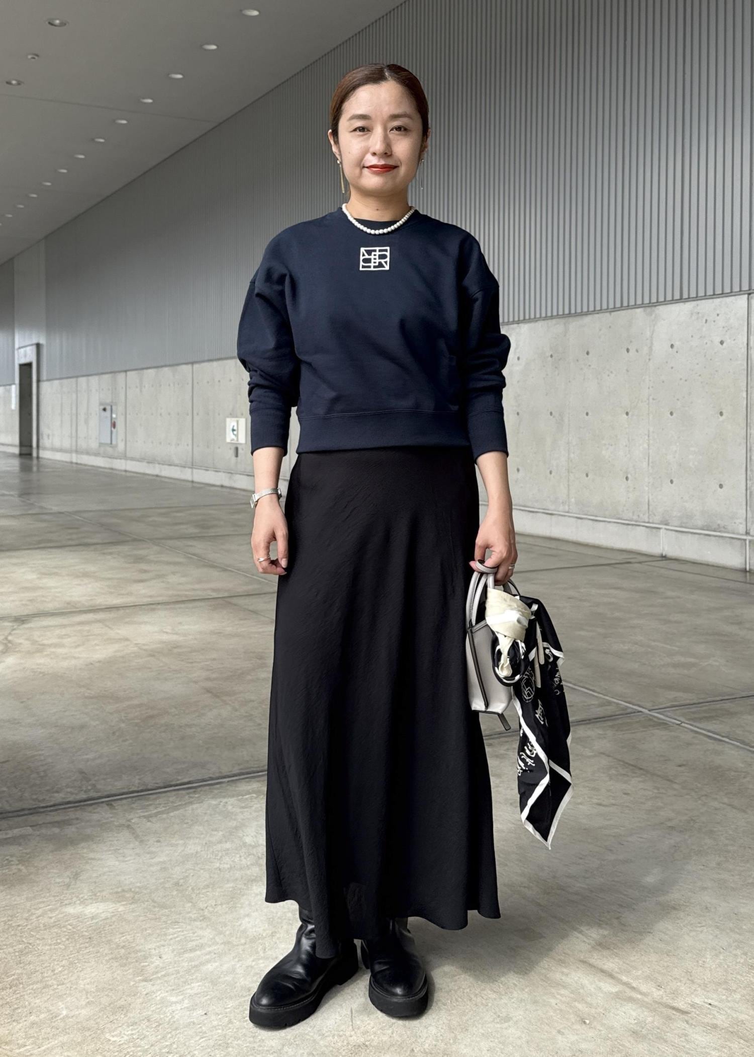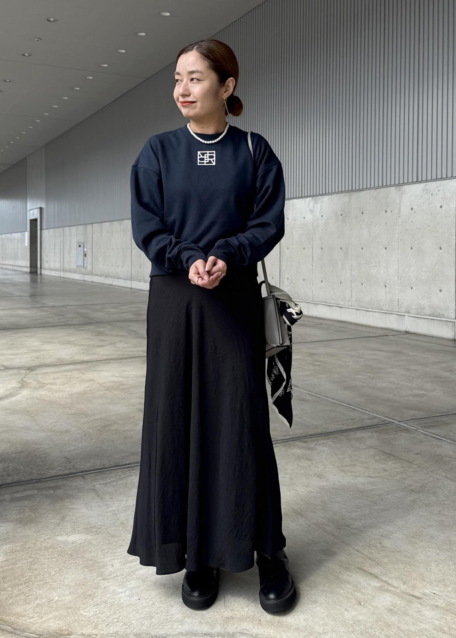 大人カジュアルにはキレイ目な素材のスカートとパールをプラスして♡