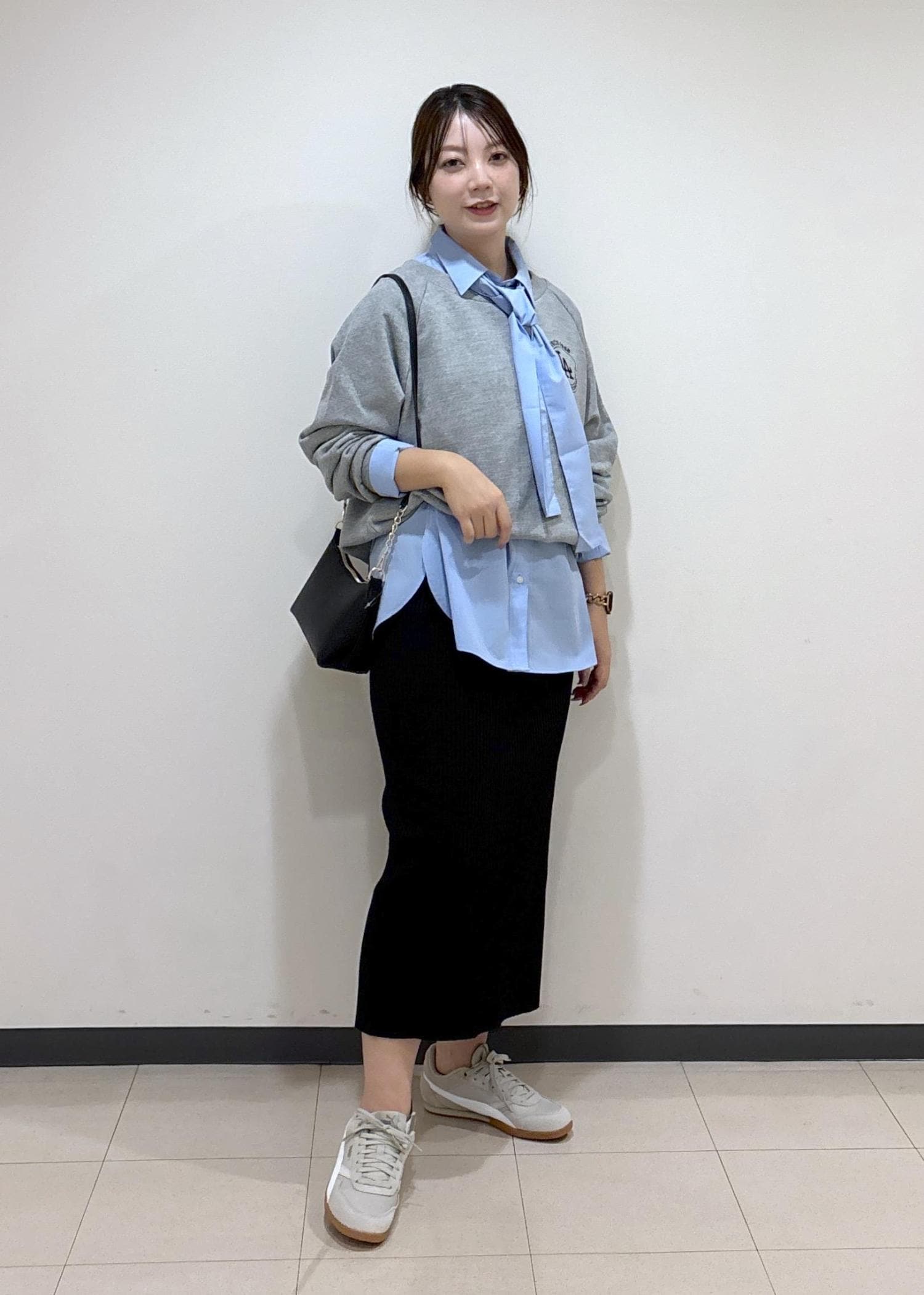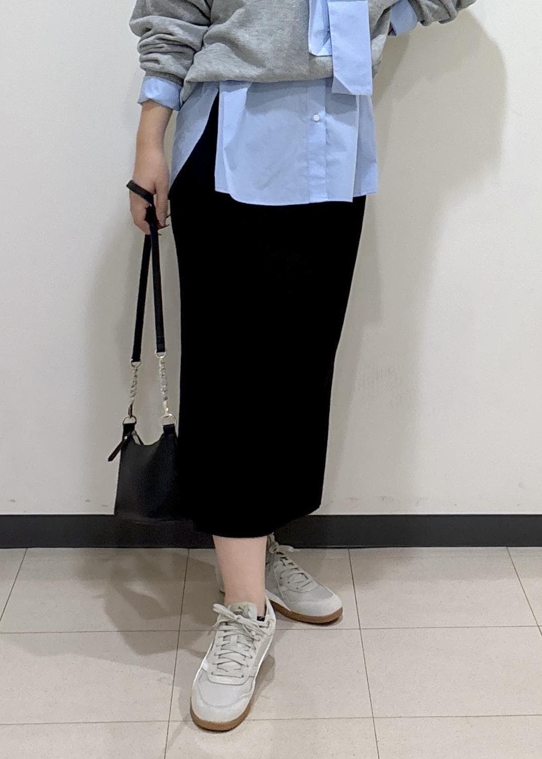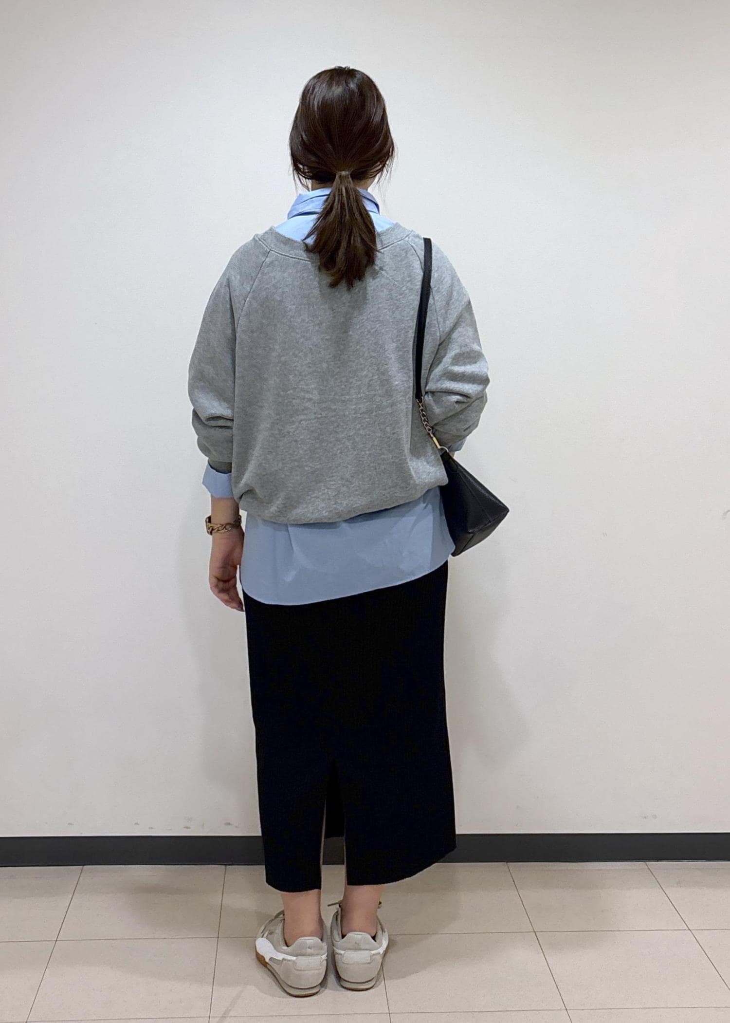 上がオーバーめで着丈は長めなのでタイトスカートでスッキリ見えるようにしました。