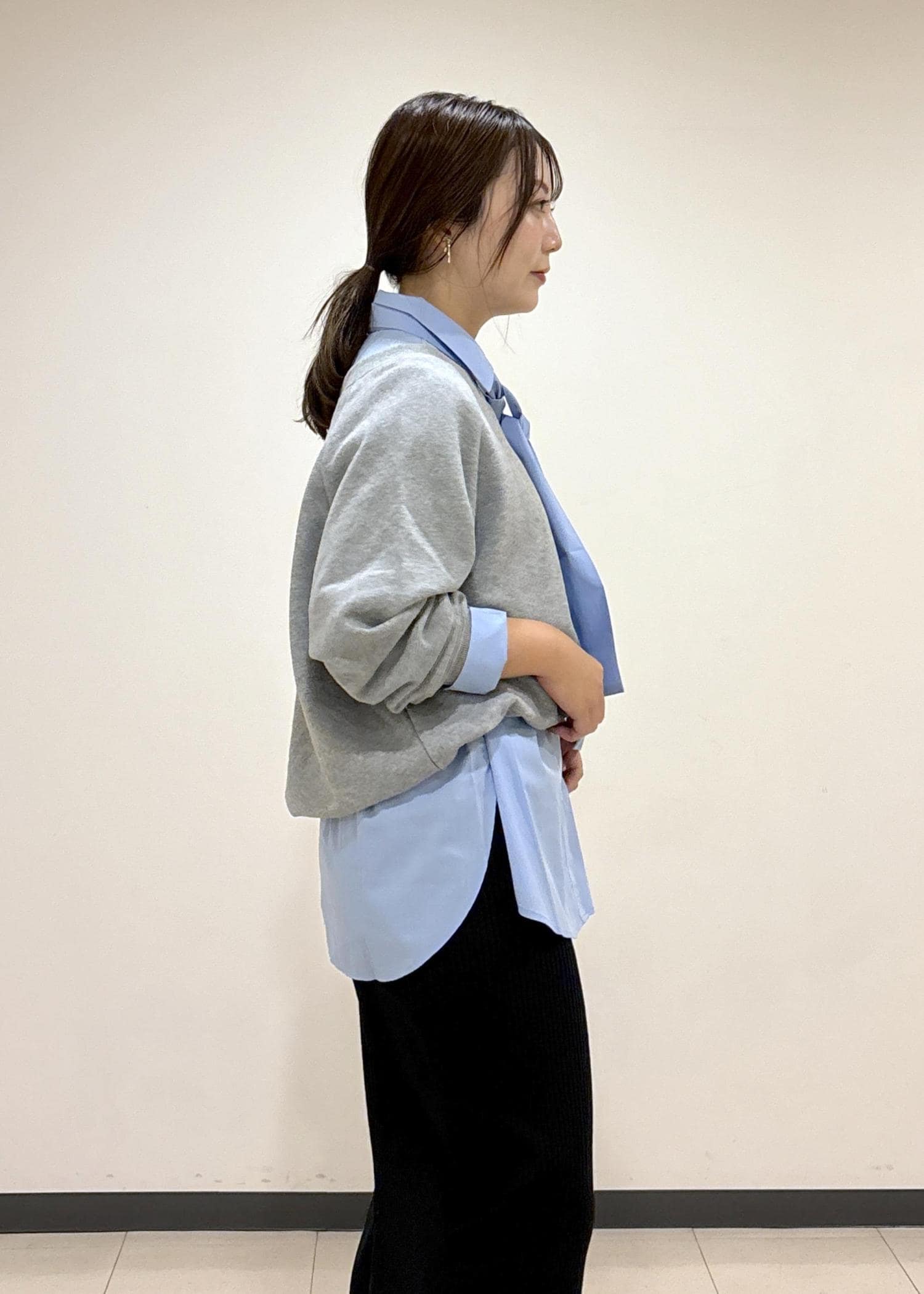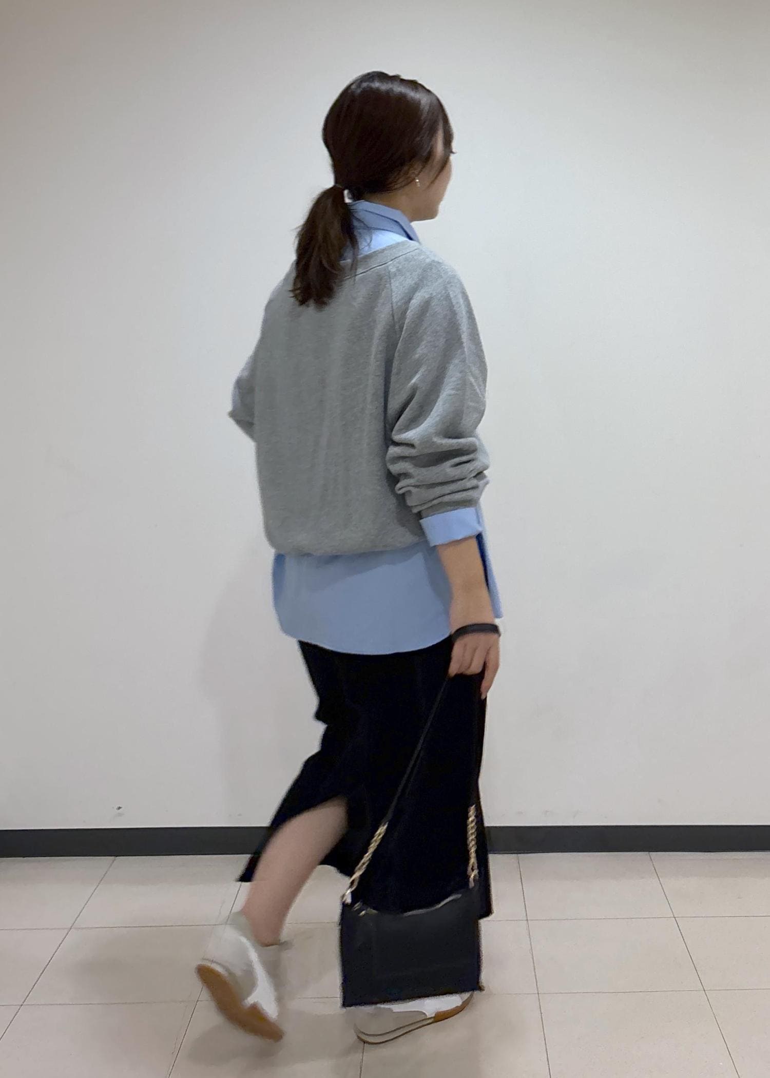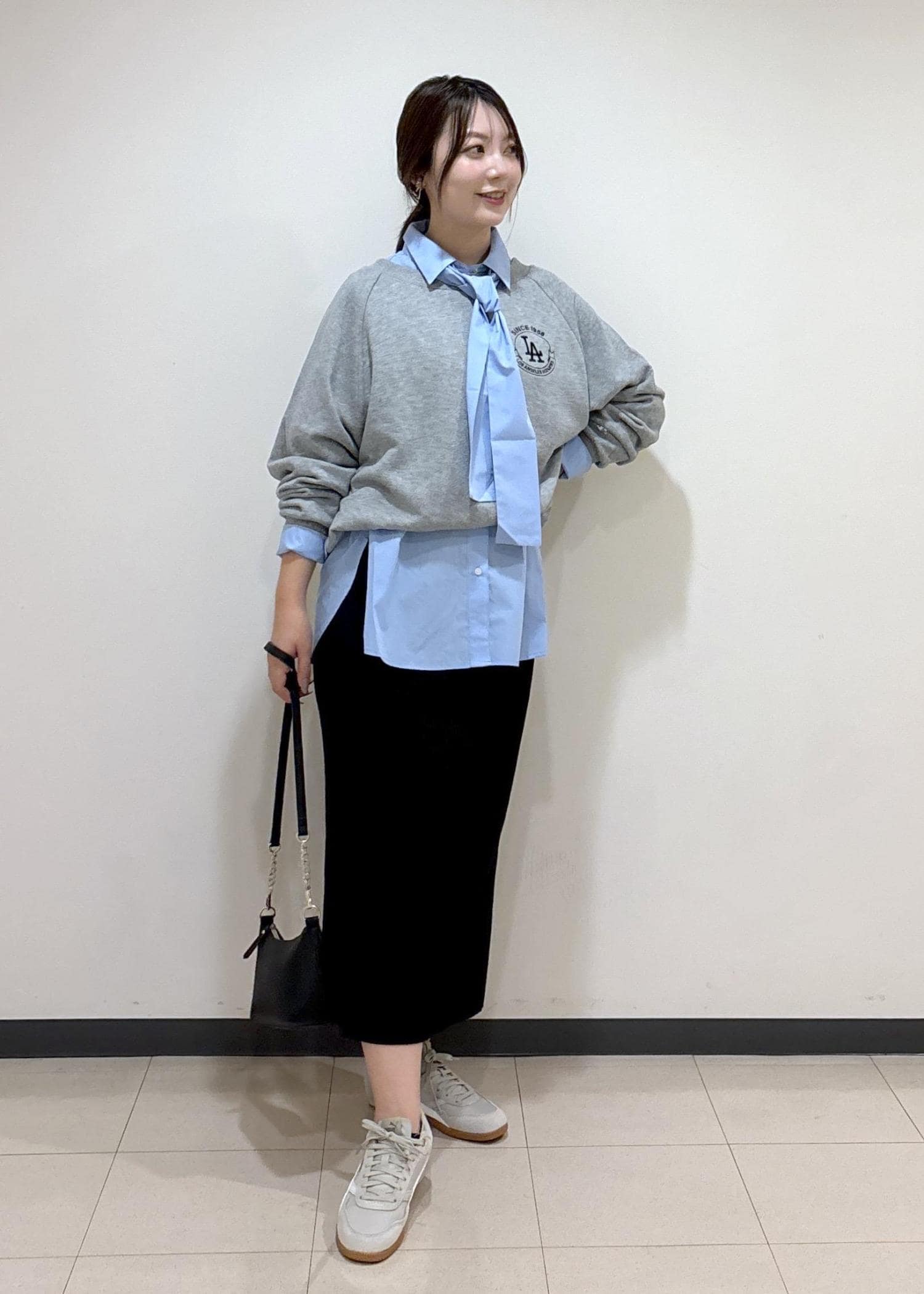 上がオーバーめで着丈は長めなのでタイトスカートでスッキリ見えるようにしました。