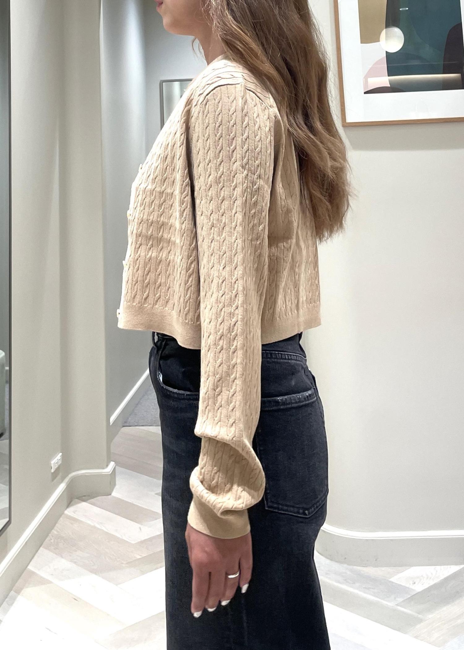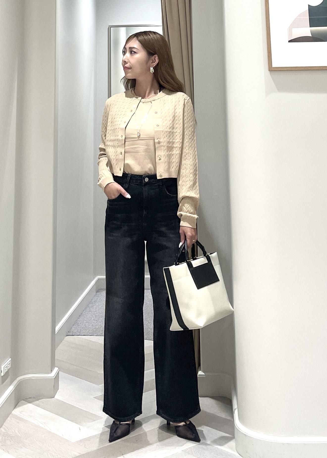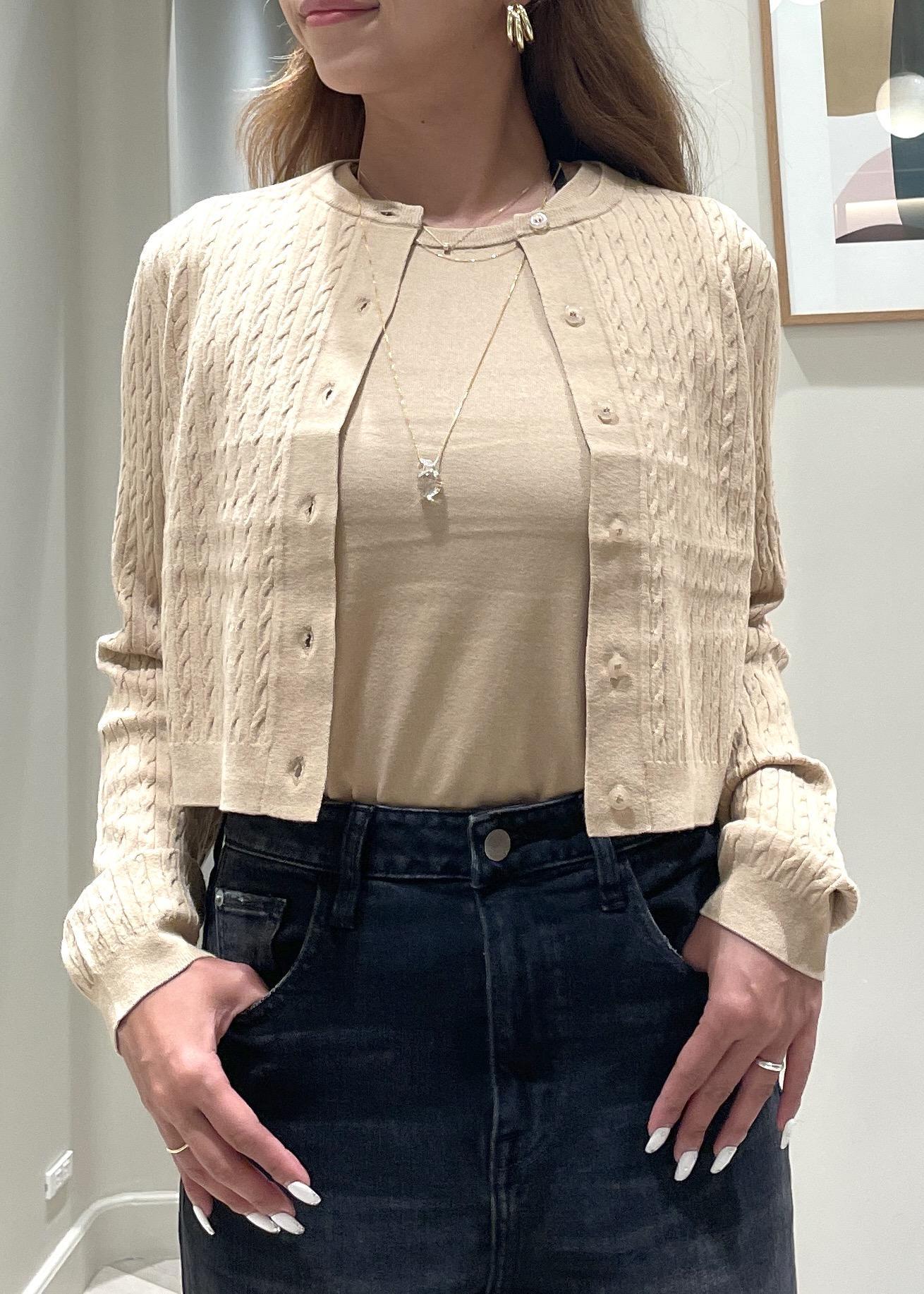 ROPÉミニケーブルセパレートカーディガン(アンサンブル)/ イージーケアベージュ / F¥21,560レビュー160cmが着用で、丈感はおへそ辺り。