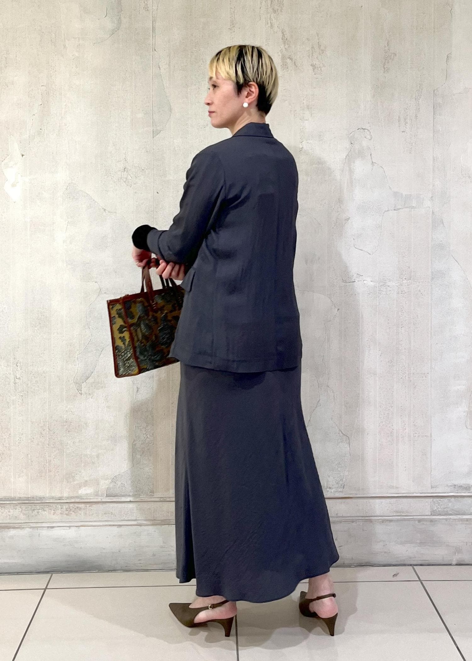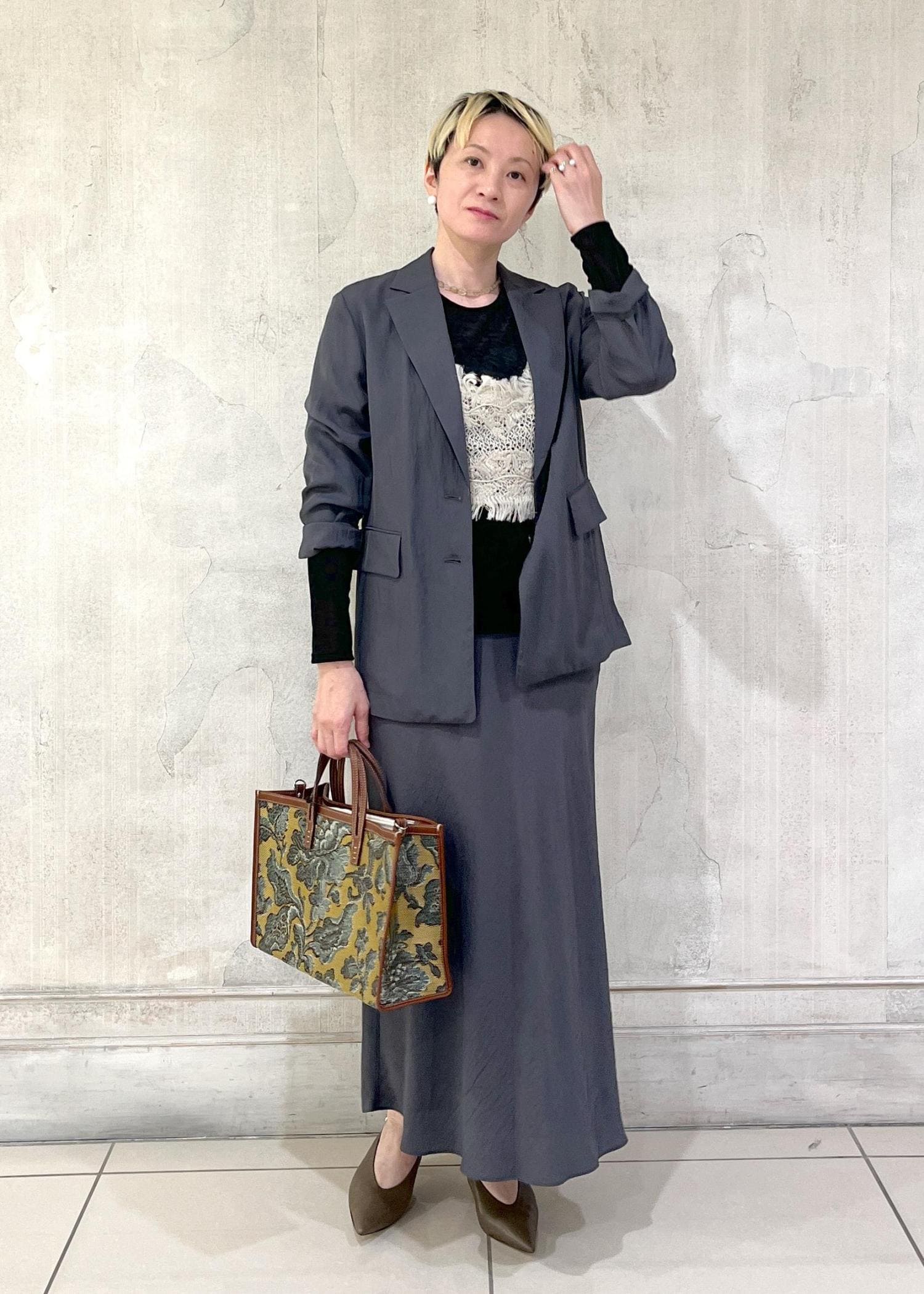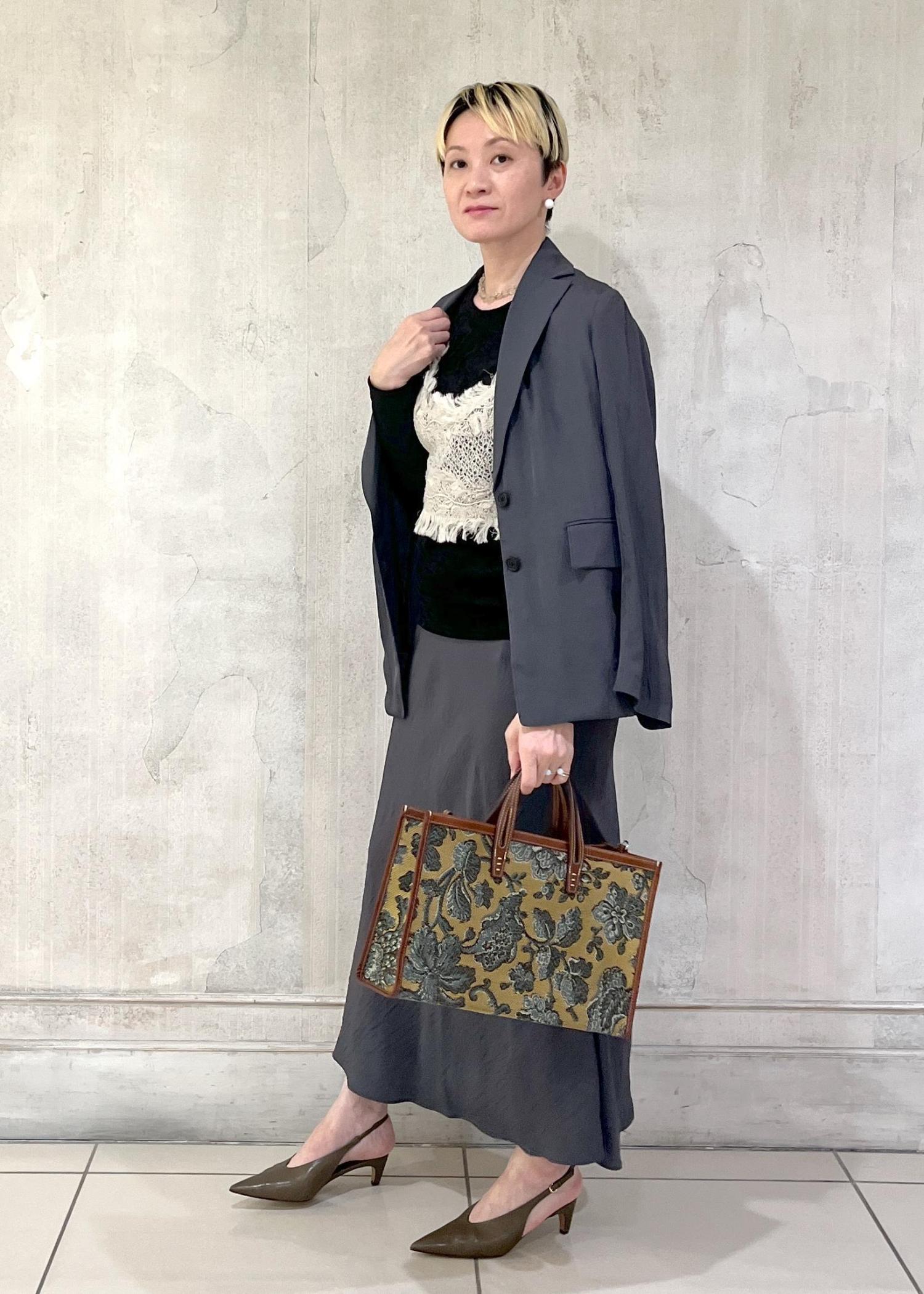 同素材のマーメイドスカートもあるので、セットアップでの着用も素敵です。 -
