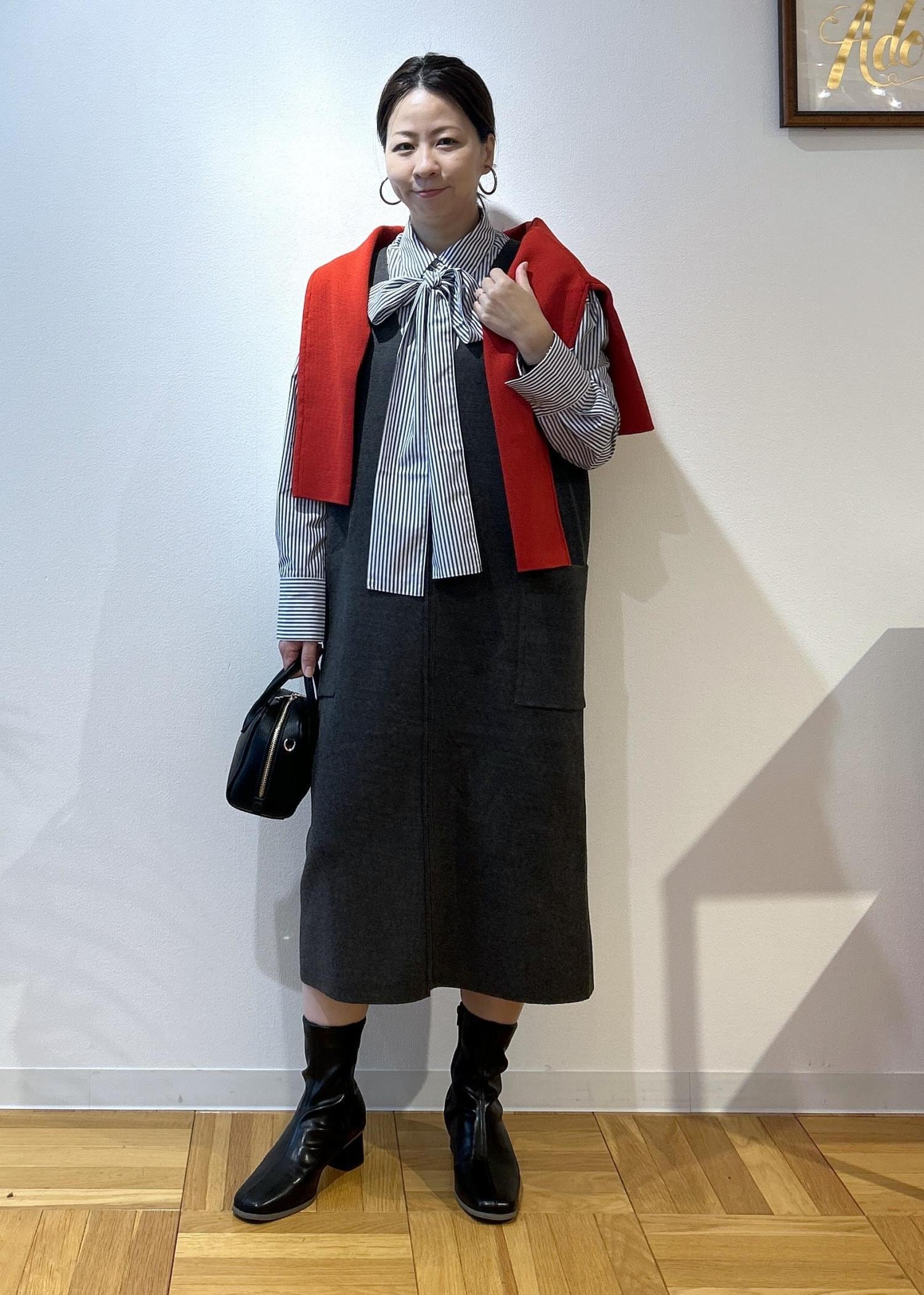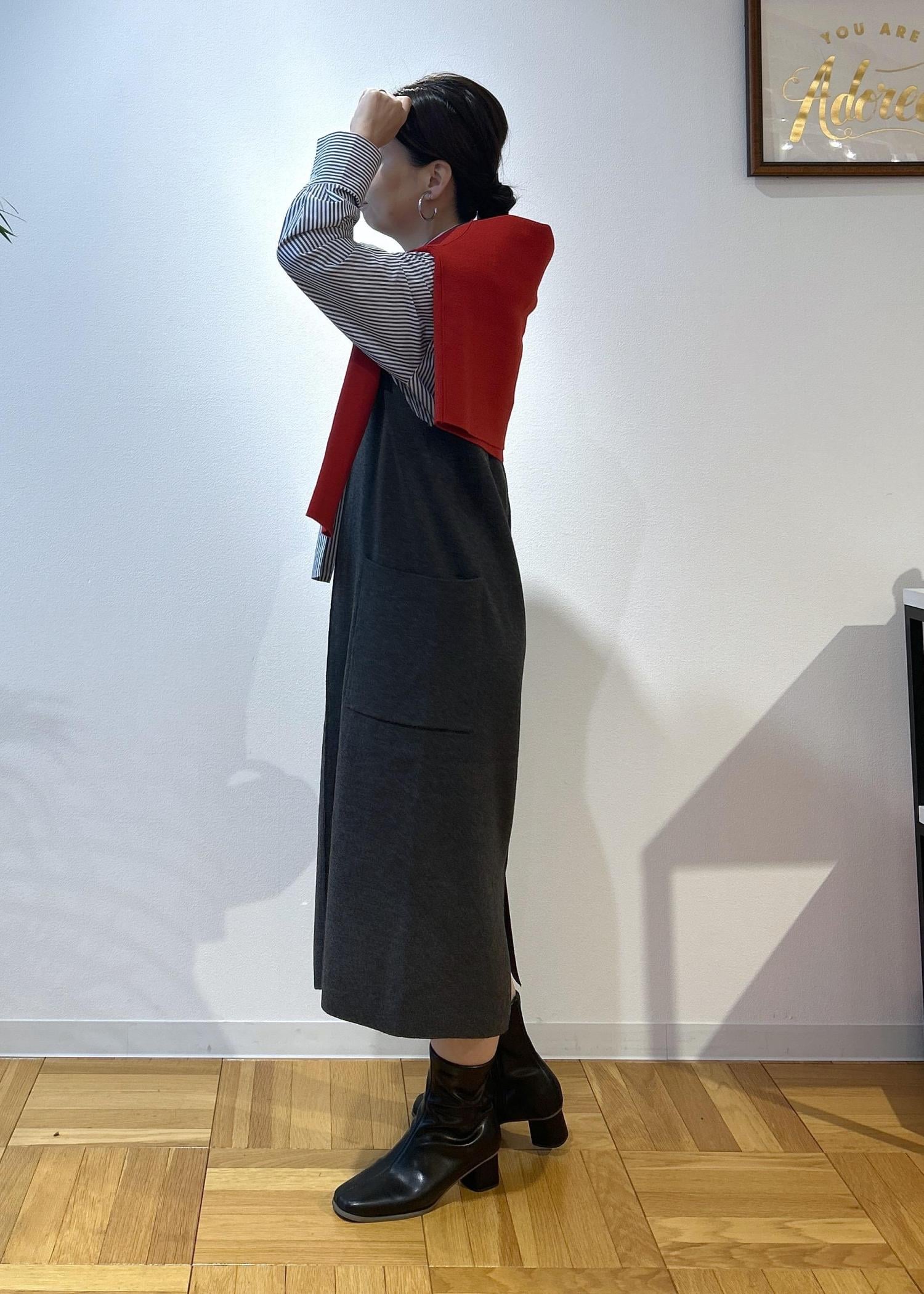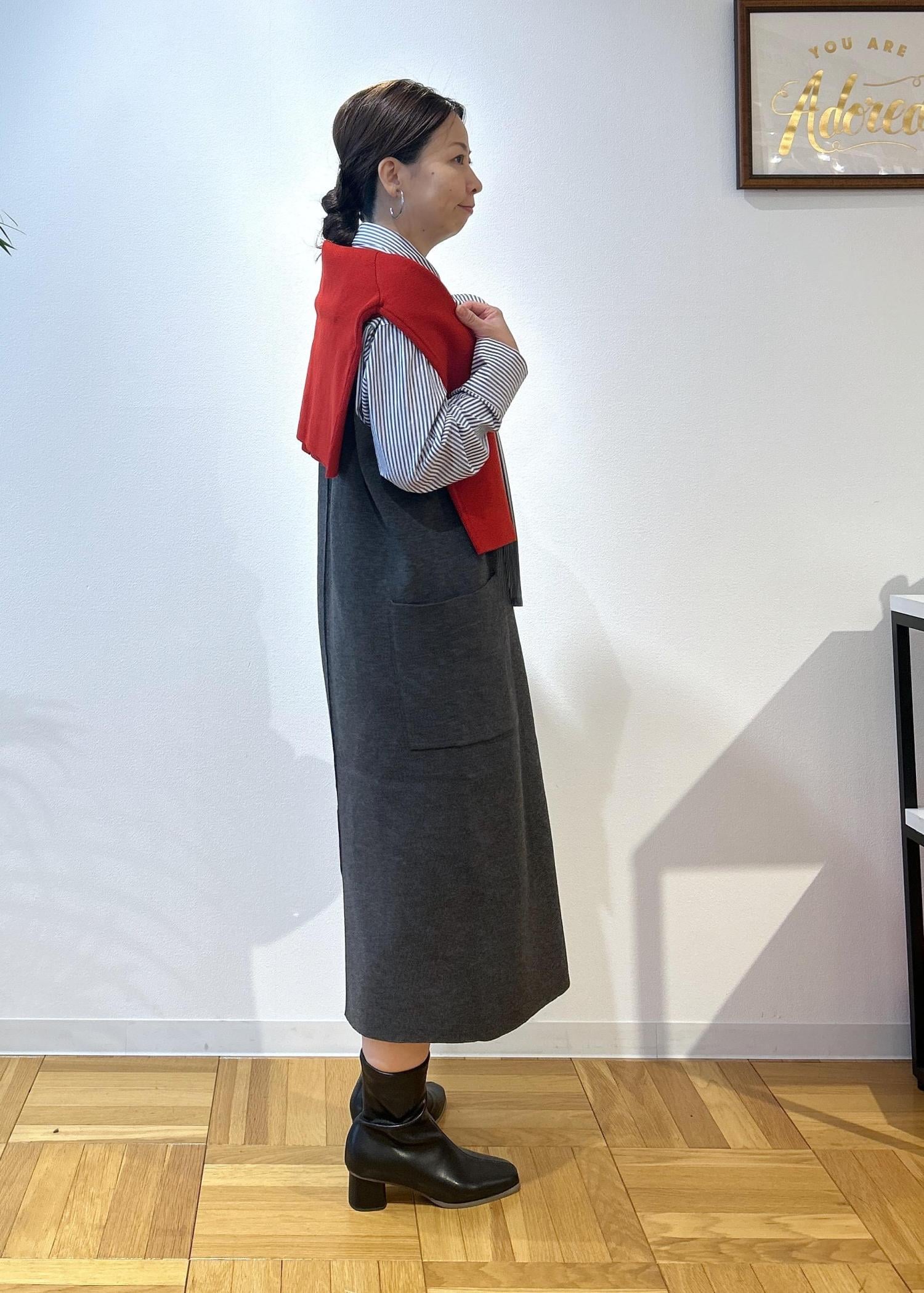 ROPÉ PICNICニットジャンパースカート/着丈が選べる・リンクコーデチャコール / M¥4,994レビューニットなので伸縮性があり、楽に着脱できます。深めなVネックのため顔まわりはスッキリ見せてくれます。今回はMサイズの着丈が短いものにし、155センチの私には膝下15センチくらいの長さでした。ショートブーツもいいけど、ロングブーツもかわいくなると思います。