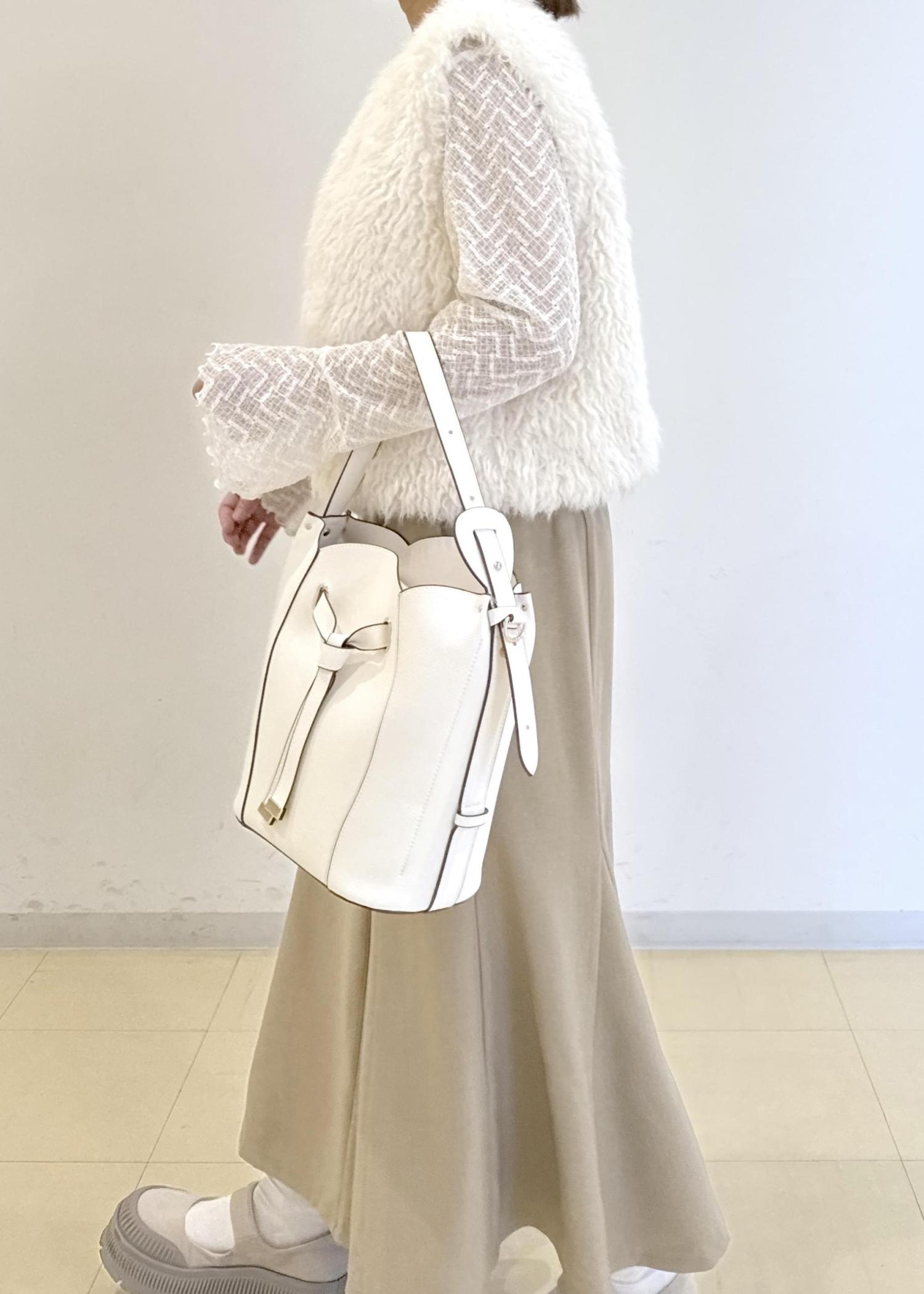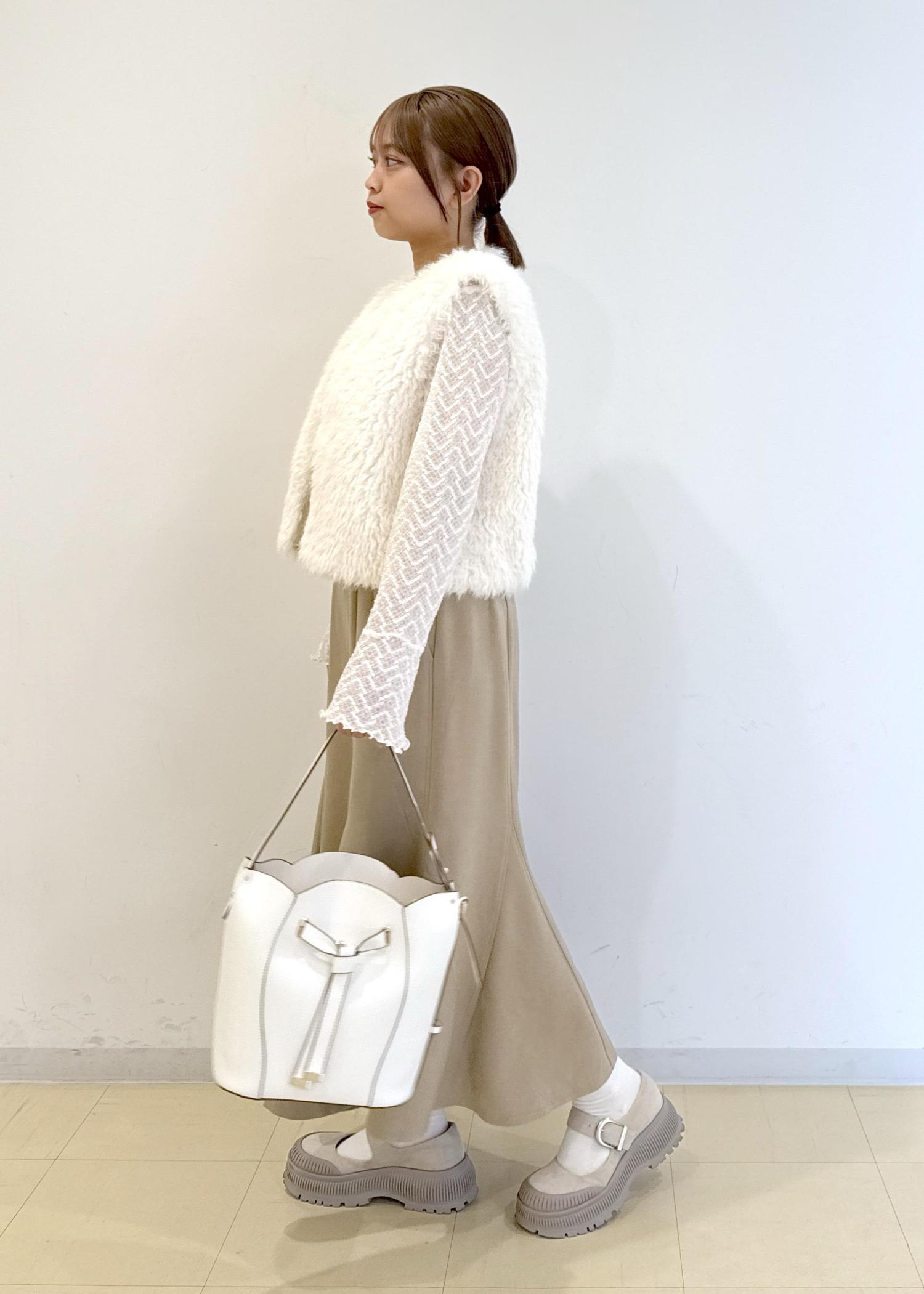 あえて小物も同系色にすることで、淡く柔らかいコーディネートにしました。