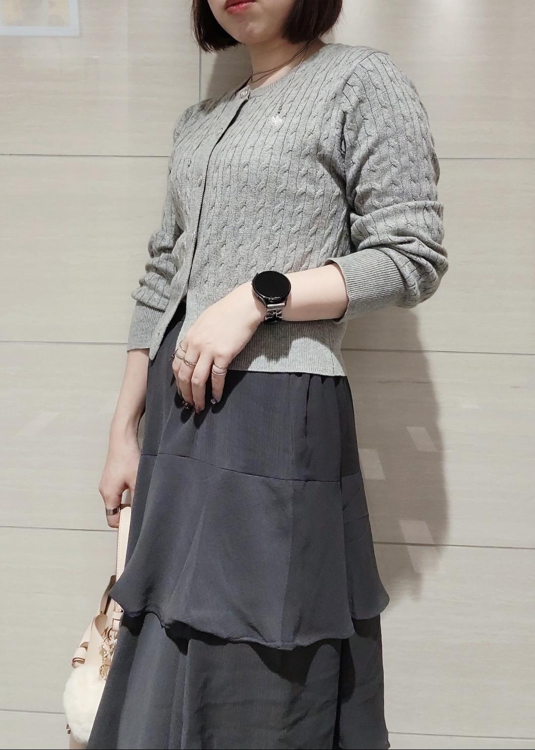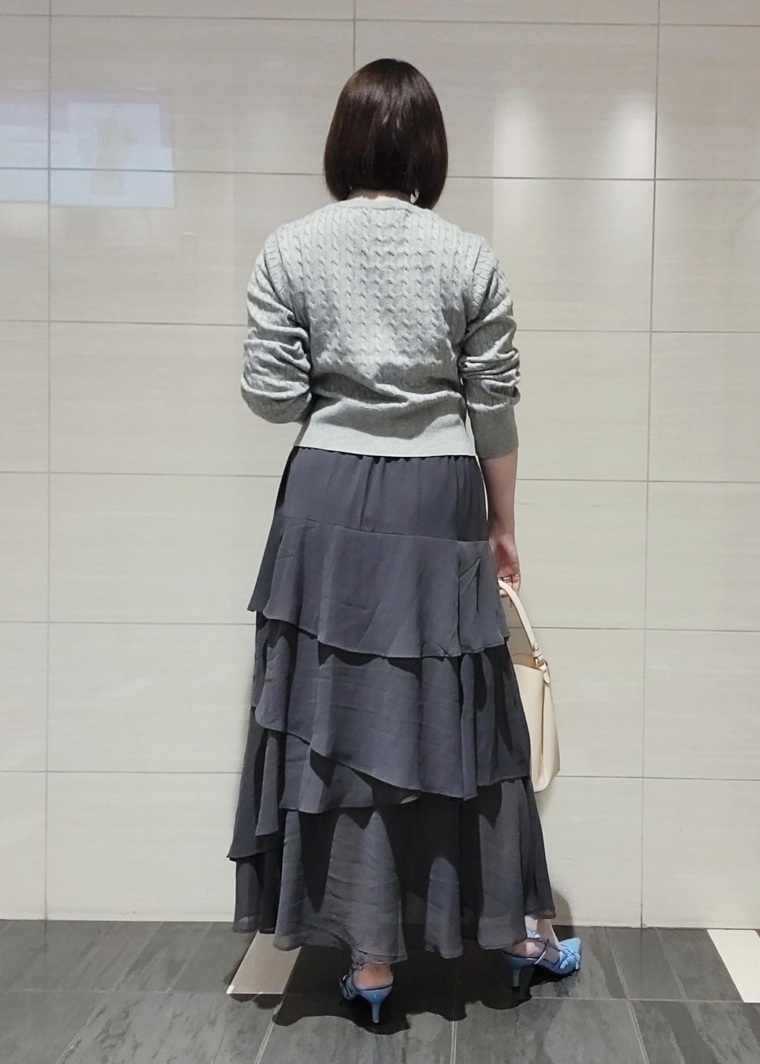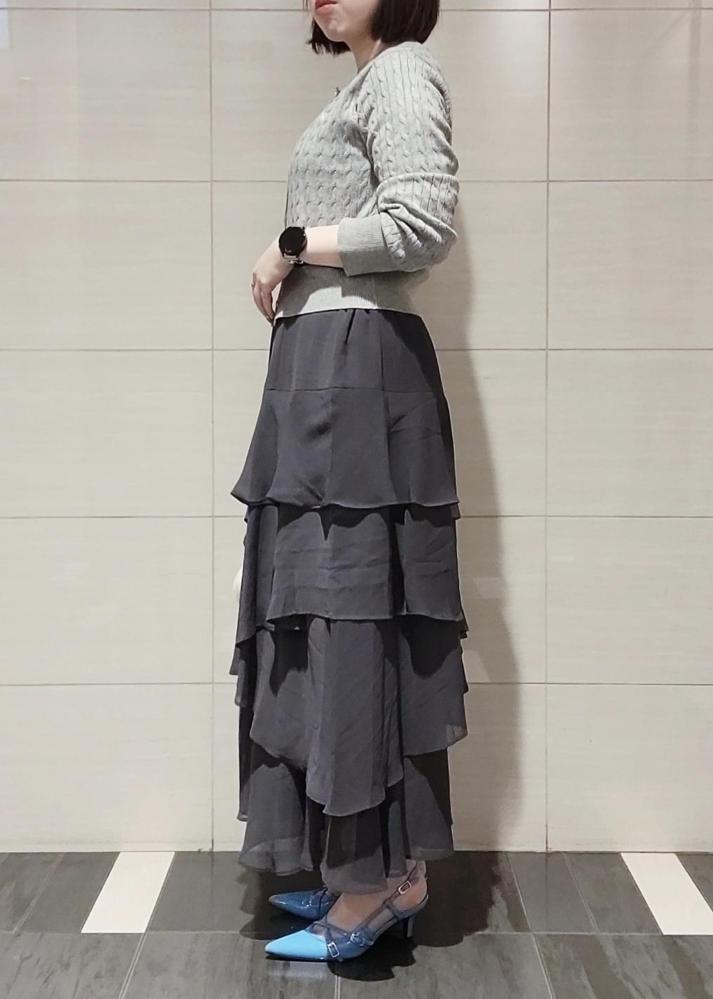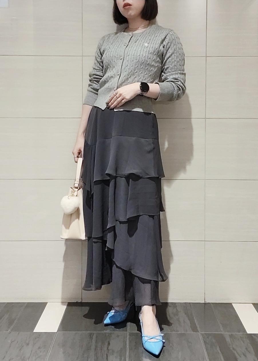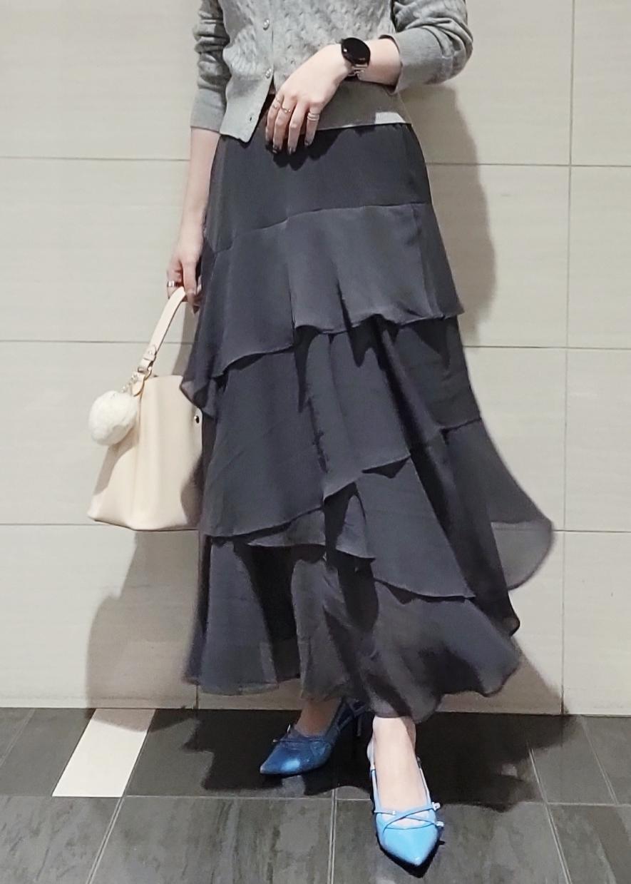 VIS花柄アソート楊柳ティアードスカートチャコール / F¥3,845レビューシアー感のある素材ですが、裏地がしっかりとあるので、透け感を気にせず着用できます。フリルの動きがあり、ボリューム感がちょうど良いです。