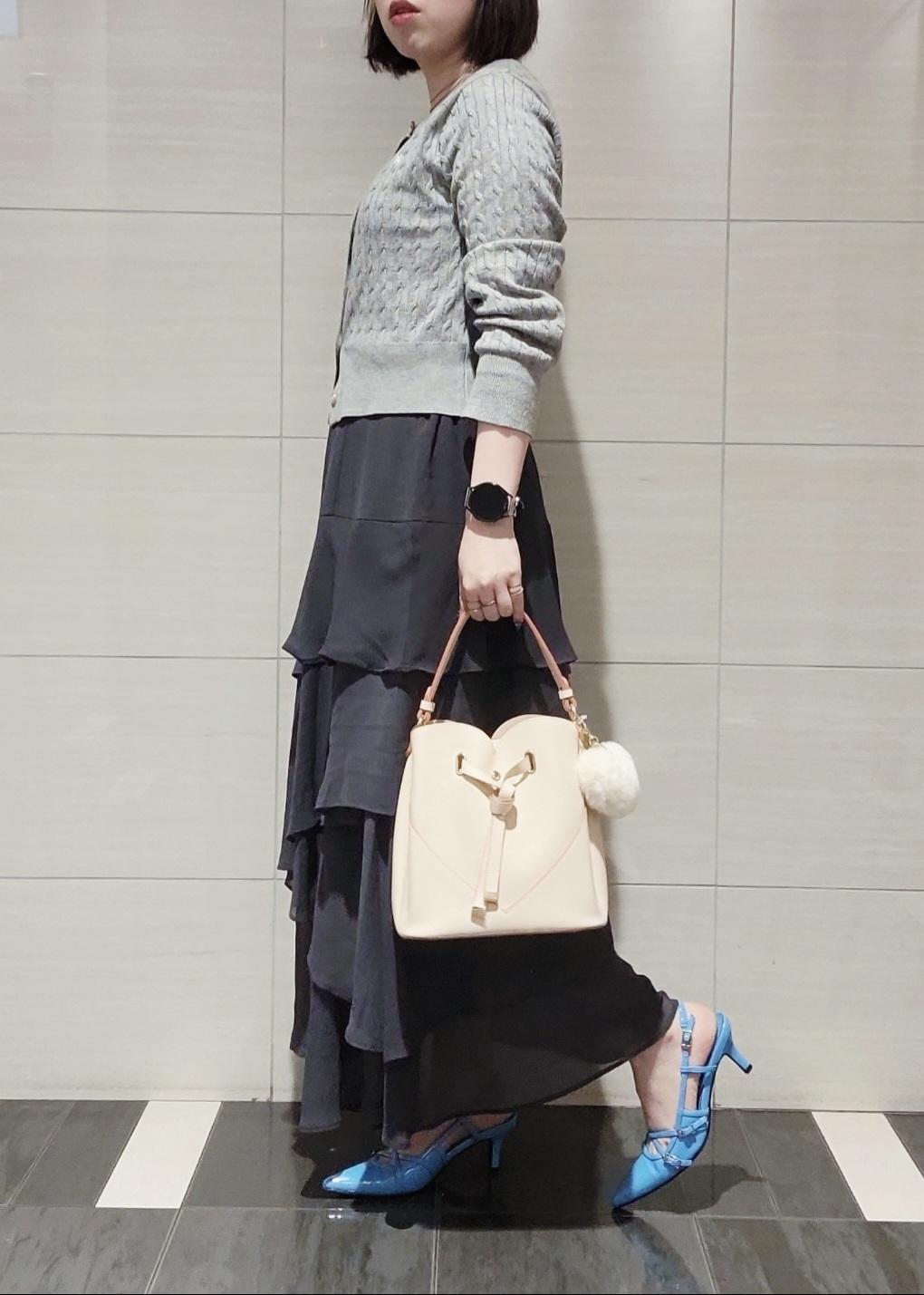 オフィスでも使えるグレーカラーで落ち着きのあるスタイリングにしました♪足元はアクセントにカラーを取り入れました!