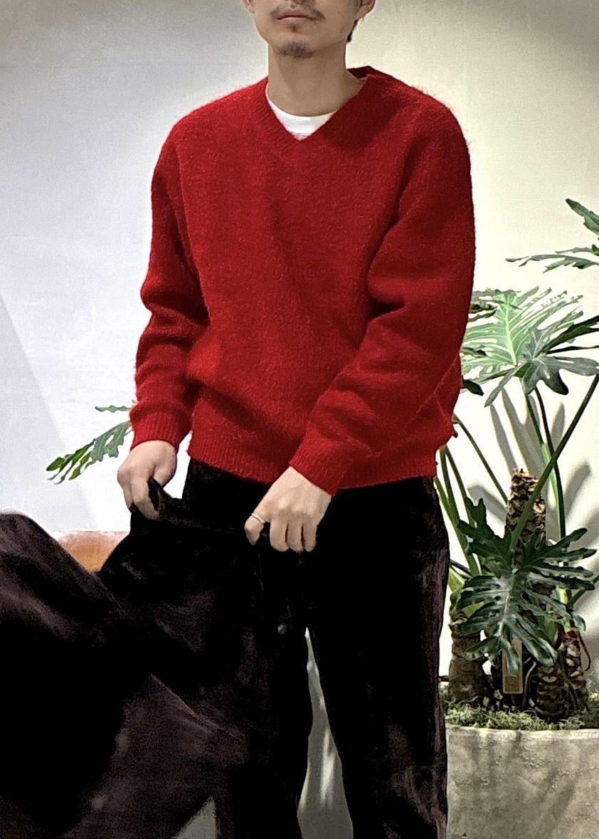 ADAM ET ROPÉ HOMMEモヘアミックス オーバーサイズ Vネックニットレッド / M¥16,940レビューややゆったりめのサイズ感で、僕自身肩幅がありますがMでも余裕を持って着用できました。伸縮性もあり、着心地としてはかなり楽です。