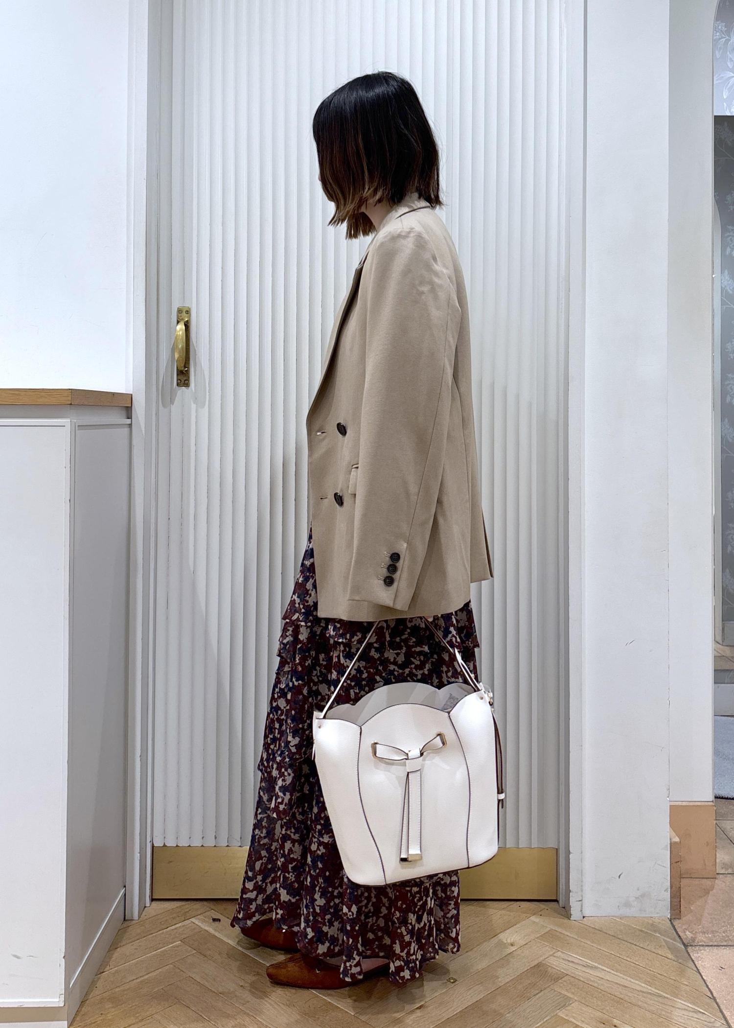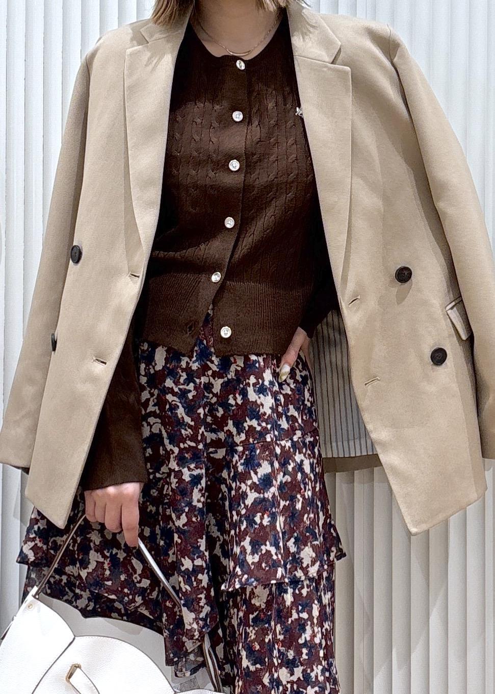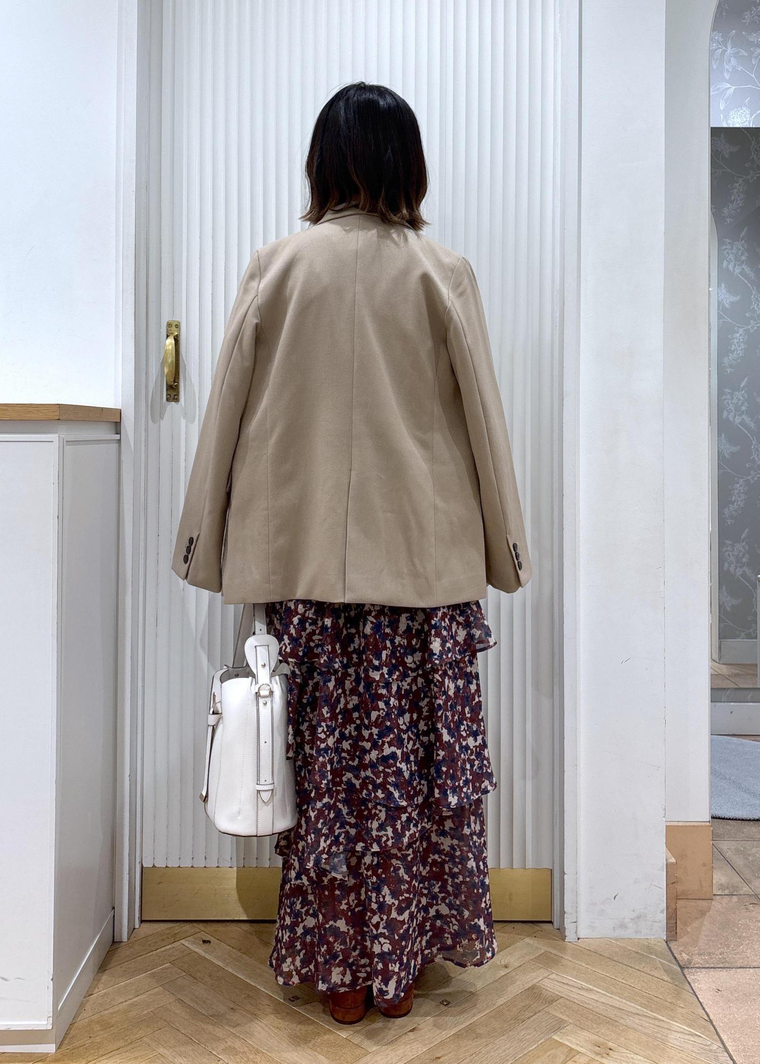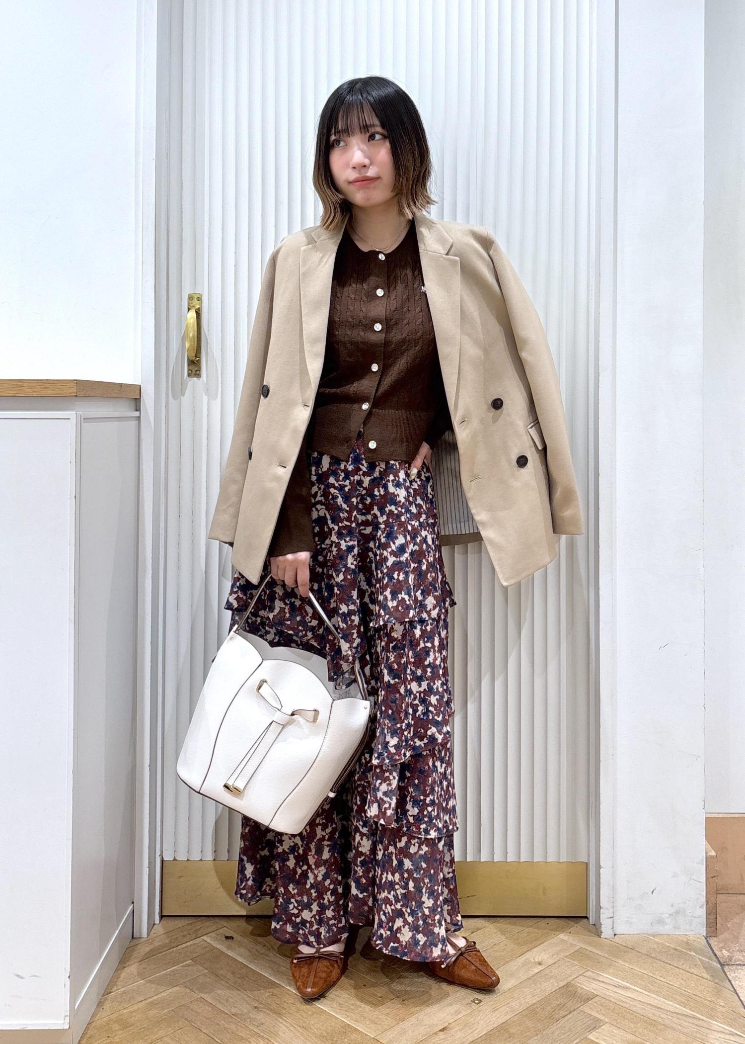 全体を秋カラーで統一したコーディネートです。ブラウンをメインにすることでバッグの白が際立ちコーディネートがより明るく華やかになります。ジャケットに袖を通さず羽織ることで抜け感と着せられてる感がなくなります。