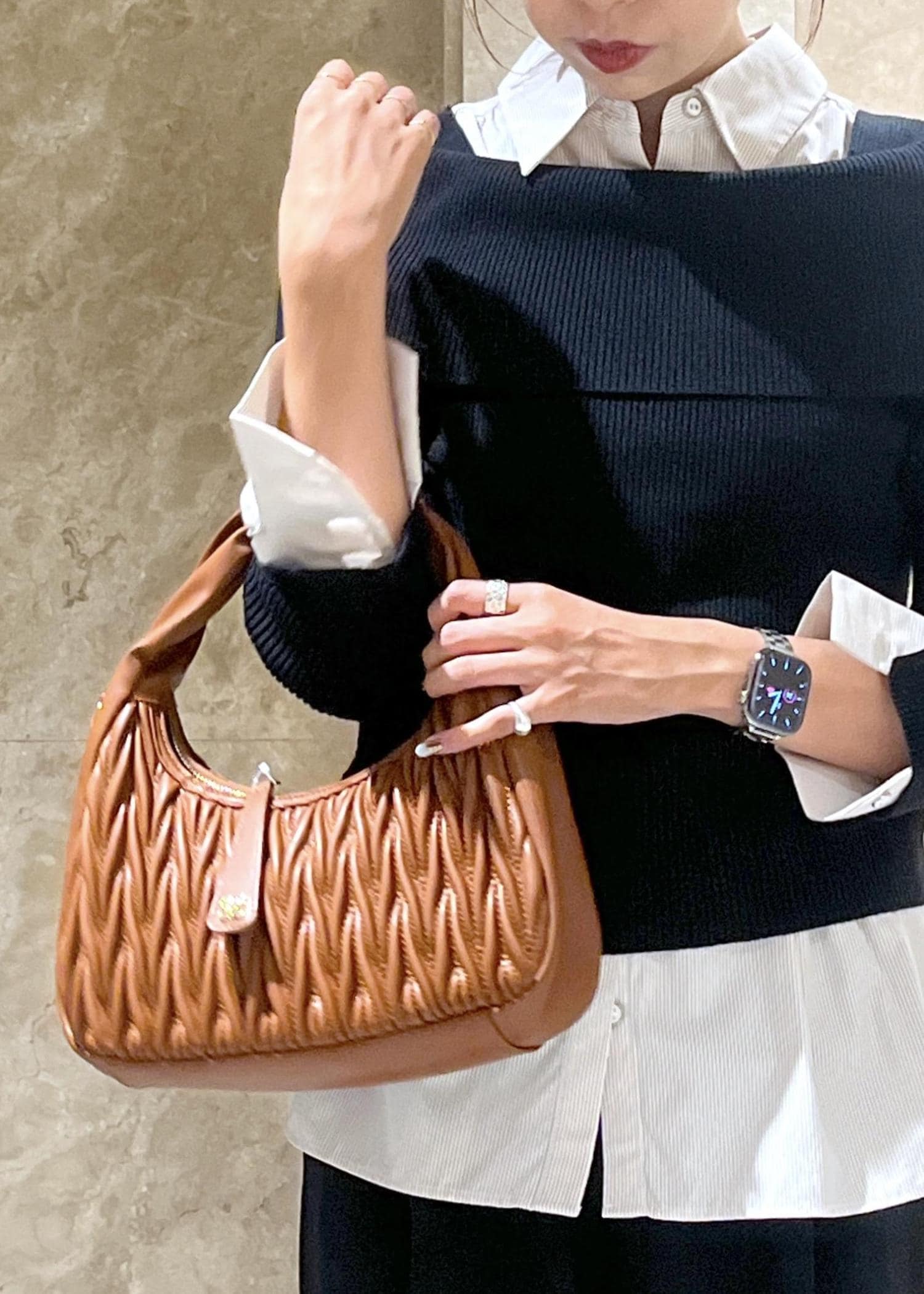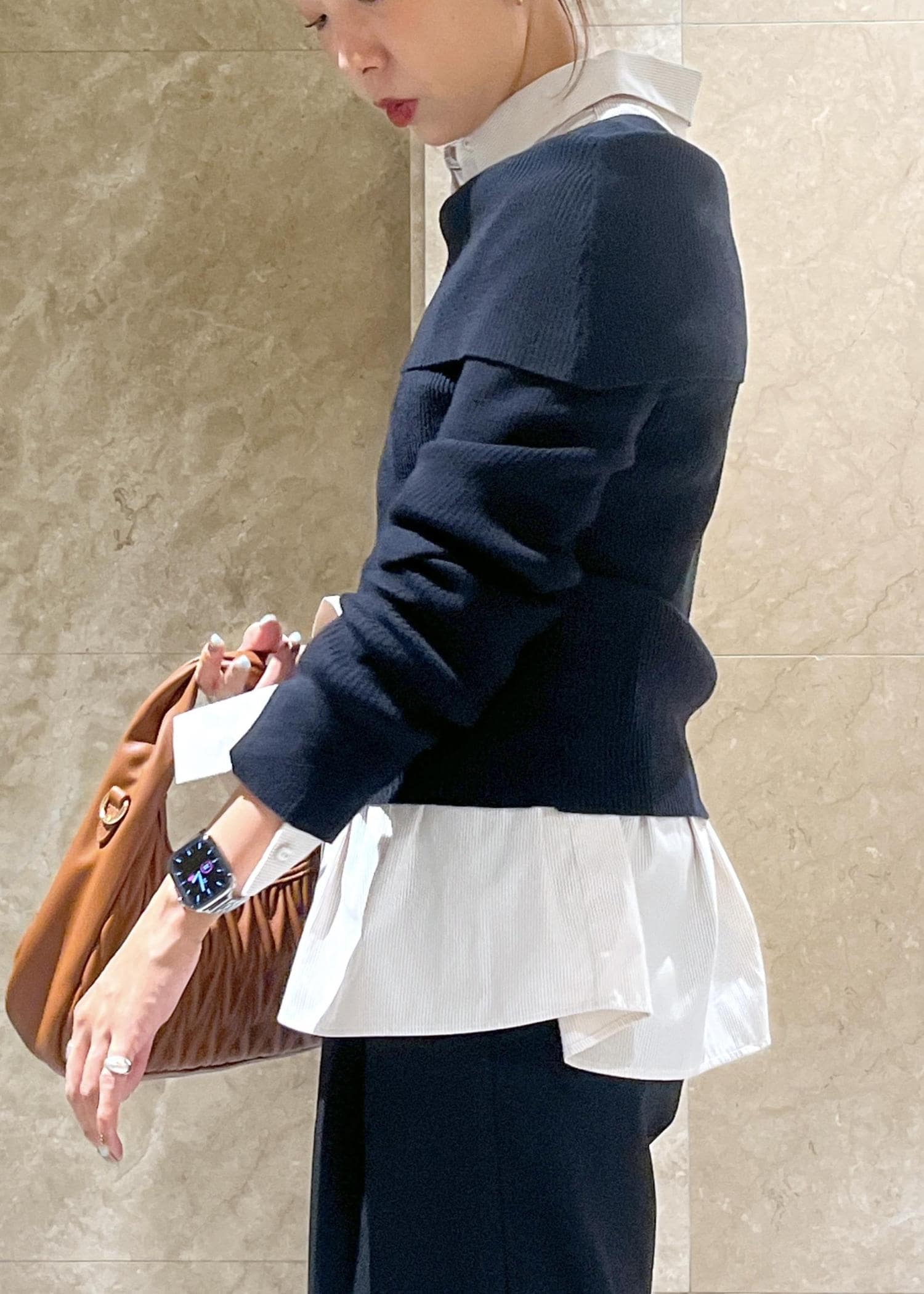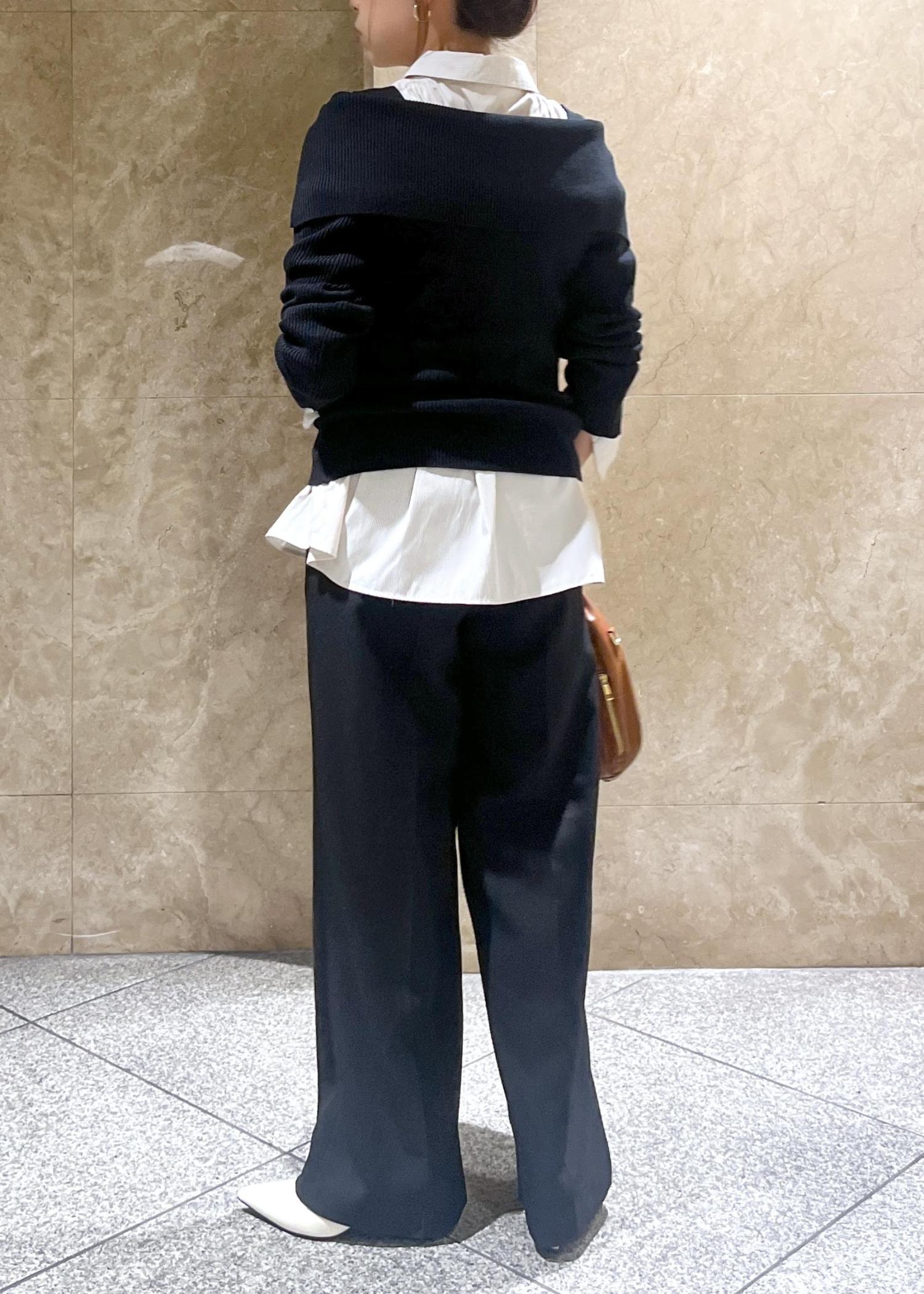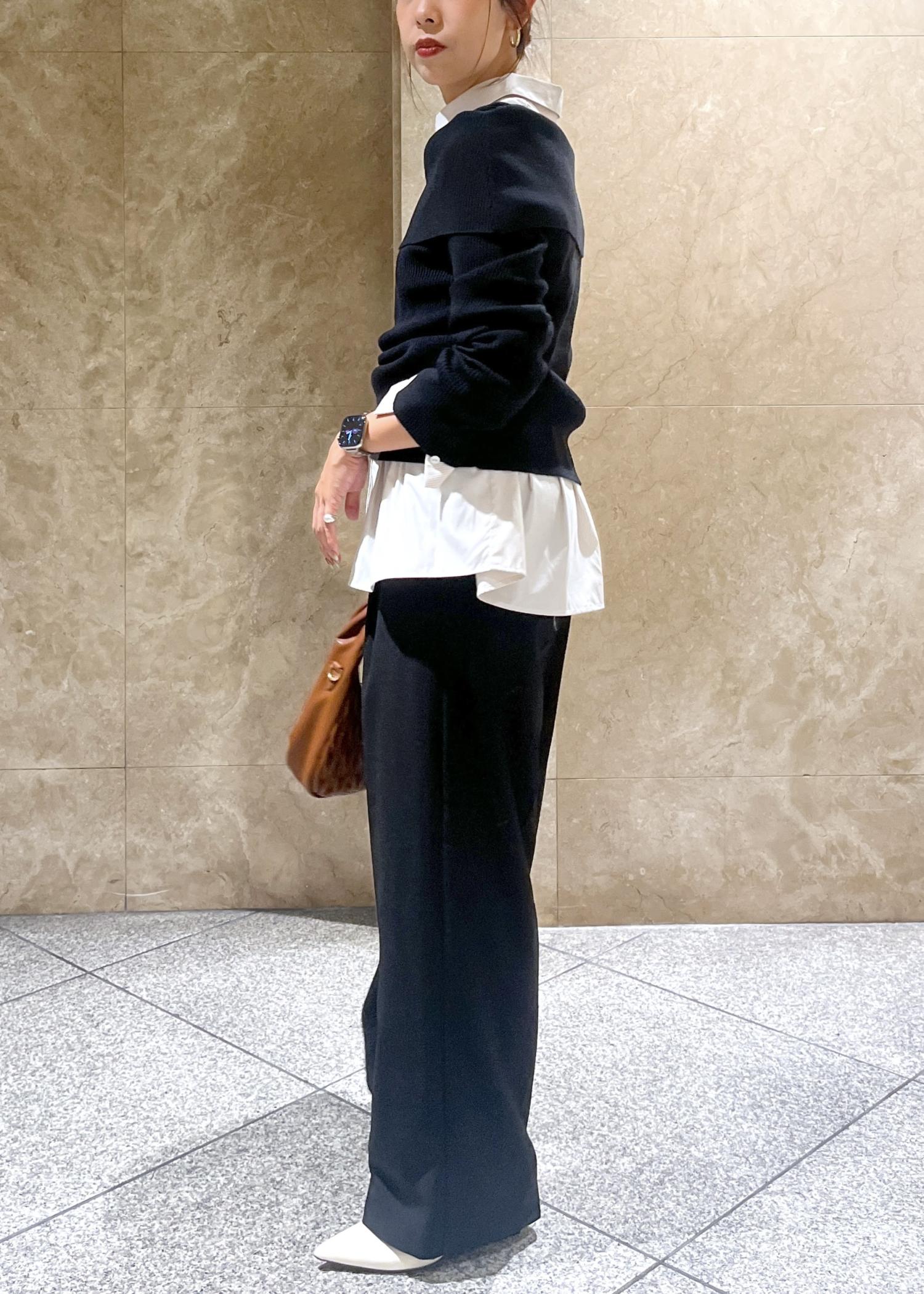 胸周りがシャーリングですっきりとするため、上にニットを重ねたりなども、ごわつかずにレイヤードしやすいと思います。