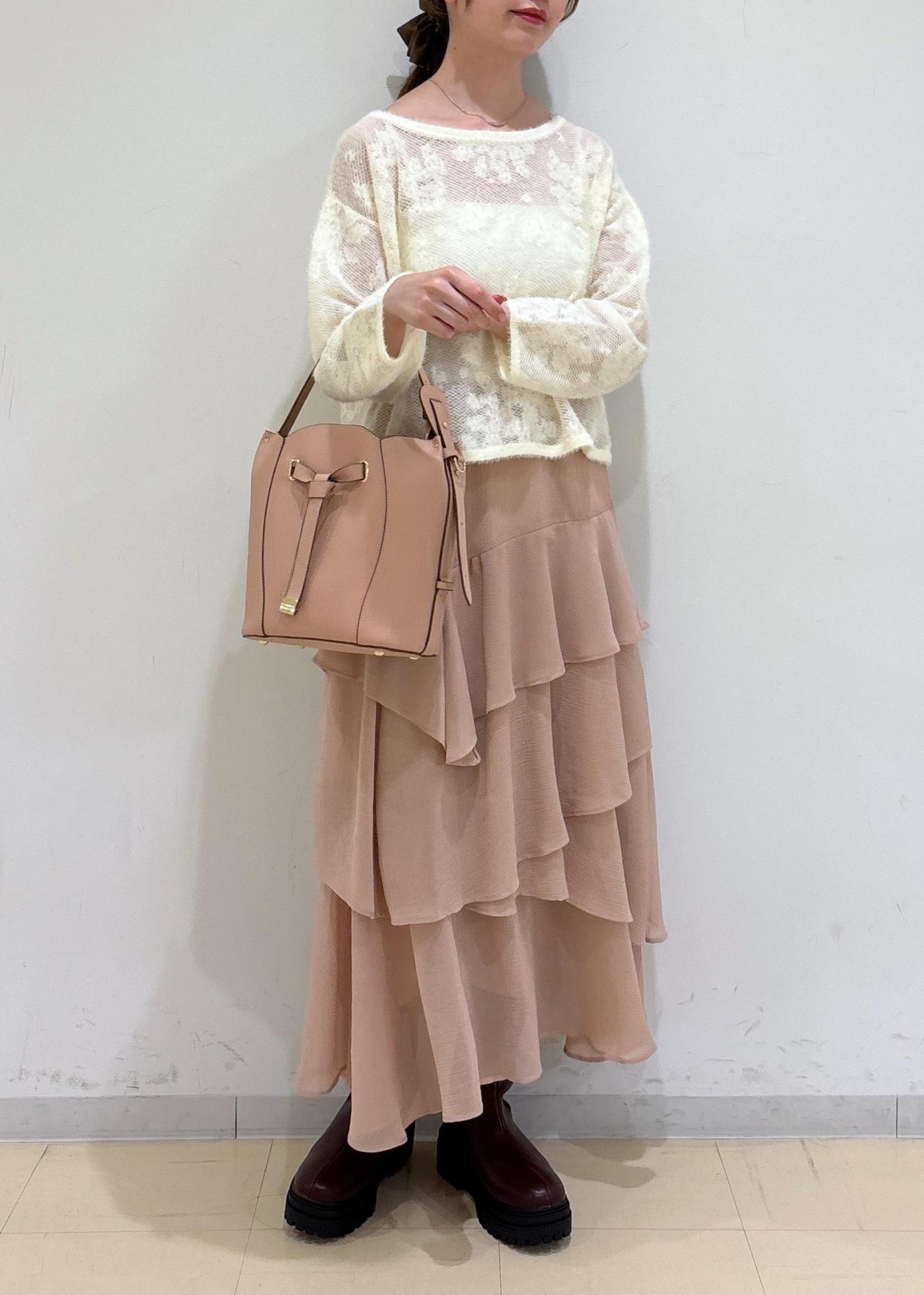 フラワーカットバッグに合わせて、大人フェミニンコーデを組みました。