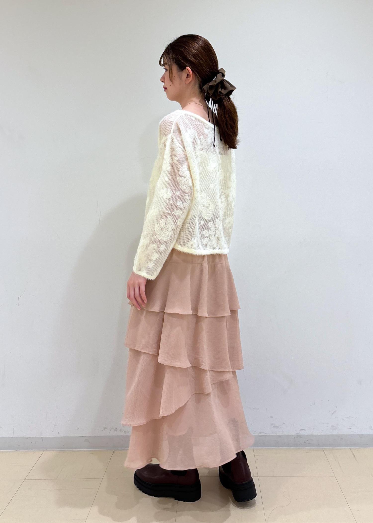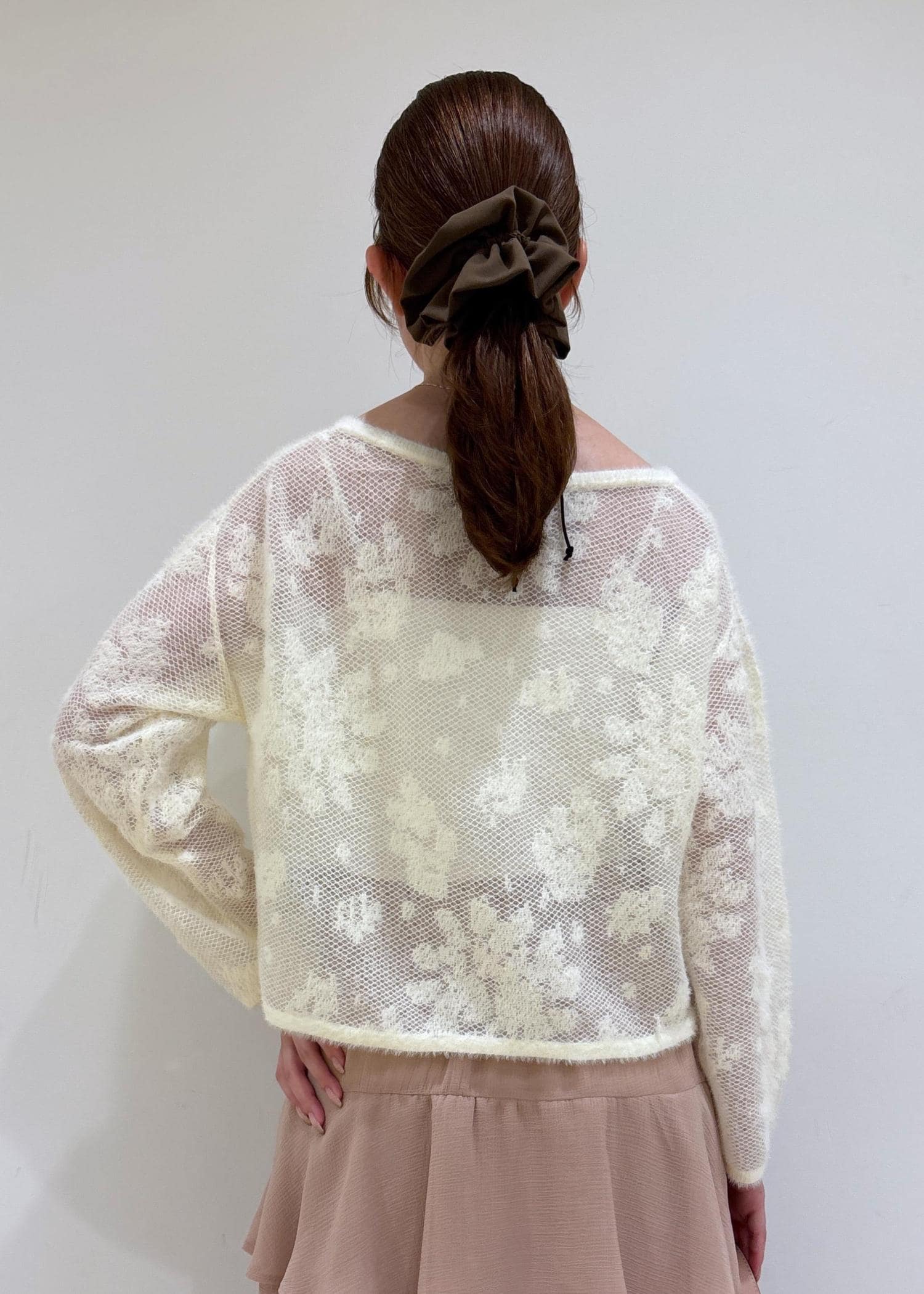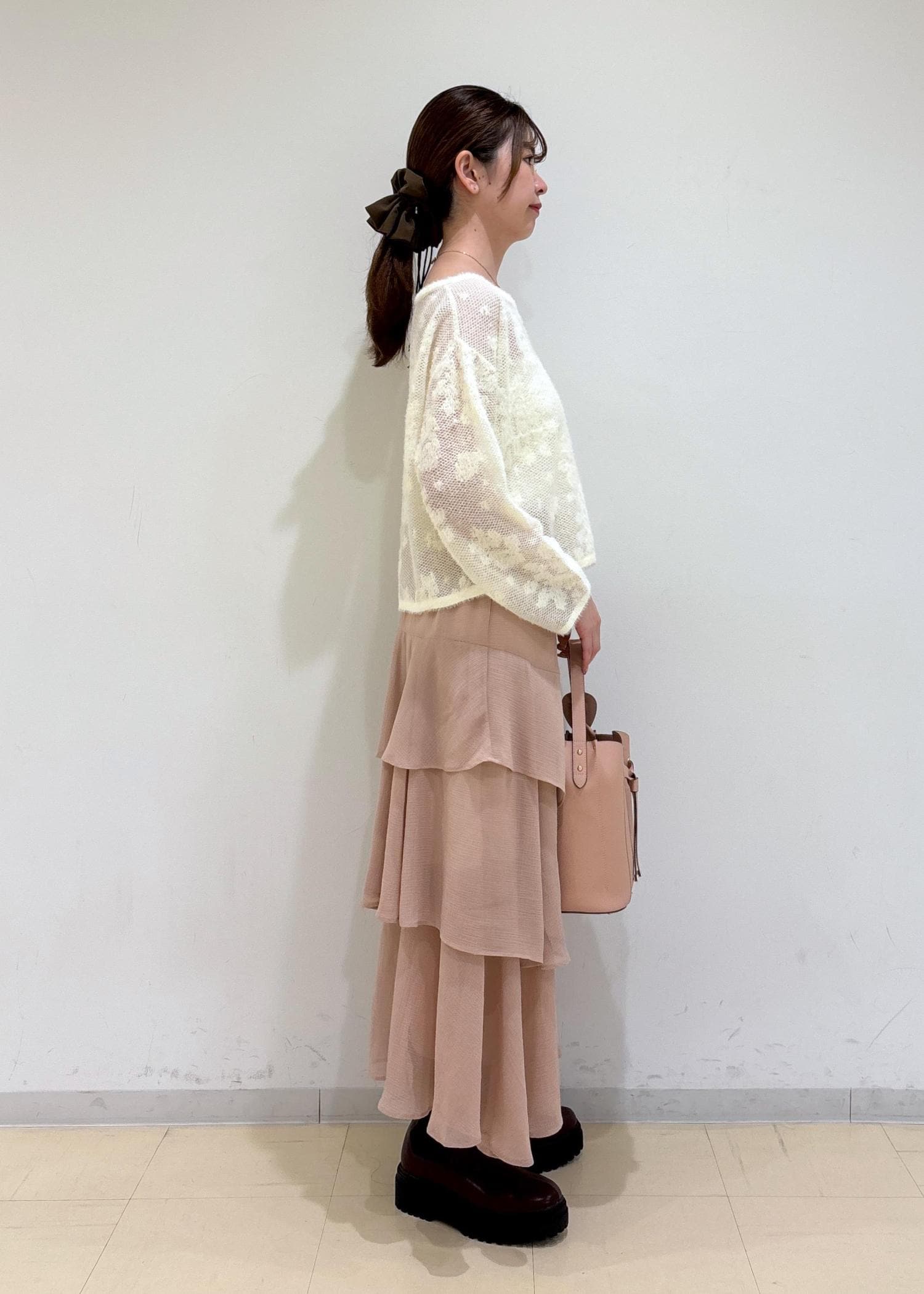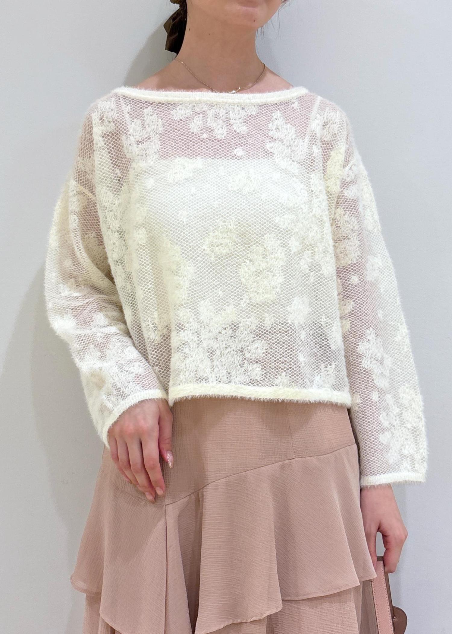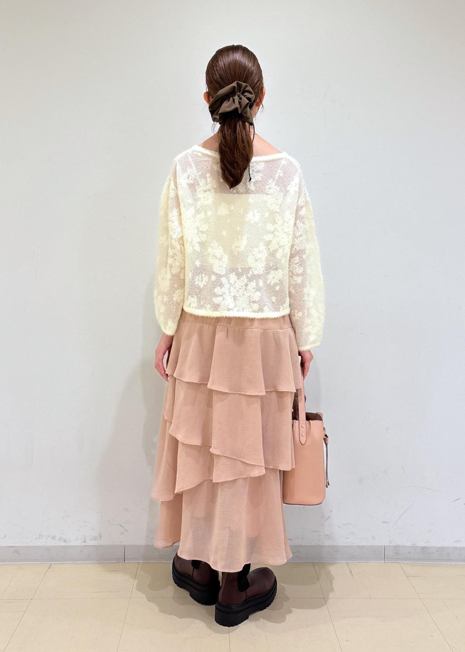 シアーニットもさりげないフラワーモチーフになっていて透け感が可愛い!