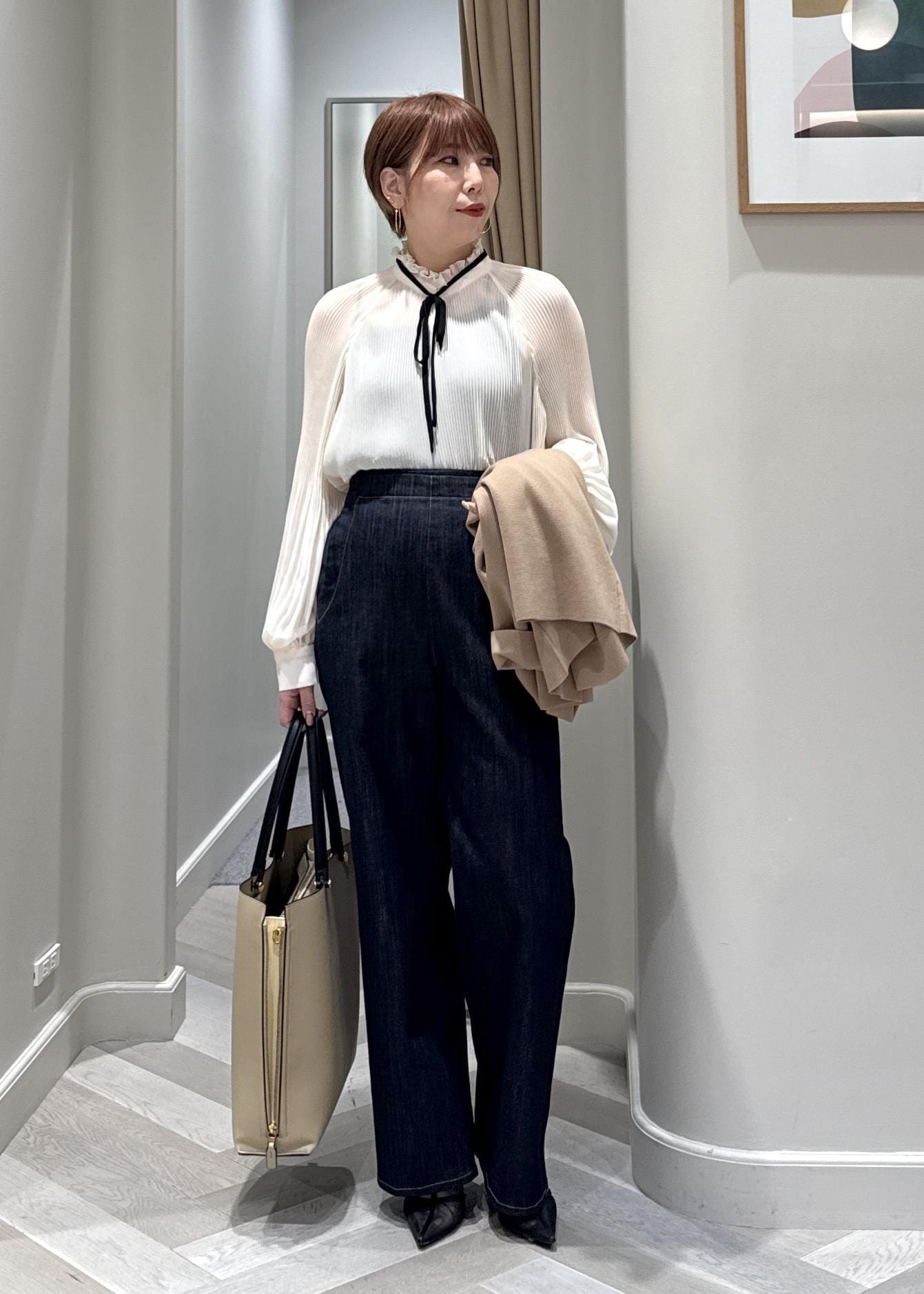 きれいめなブラウスをデニムでカジュアルダウン◎