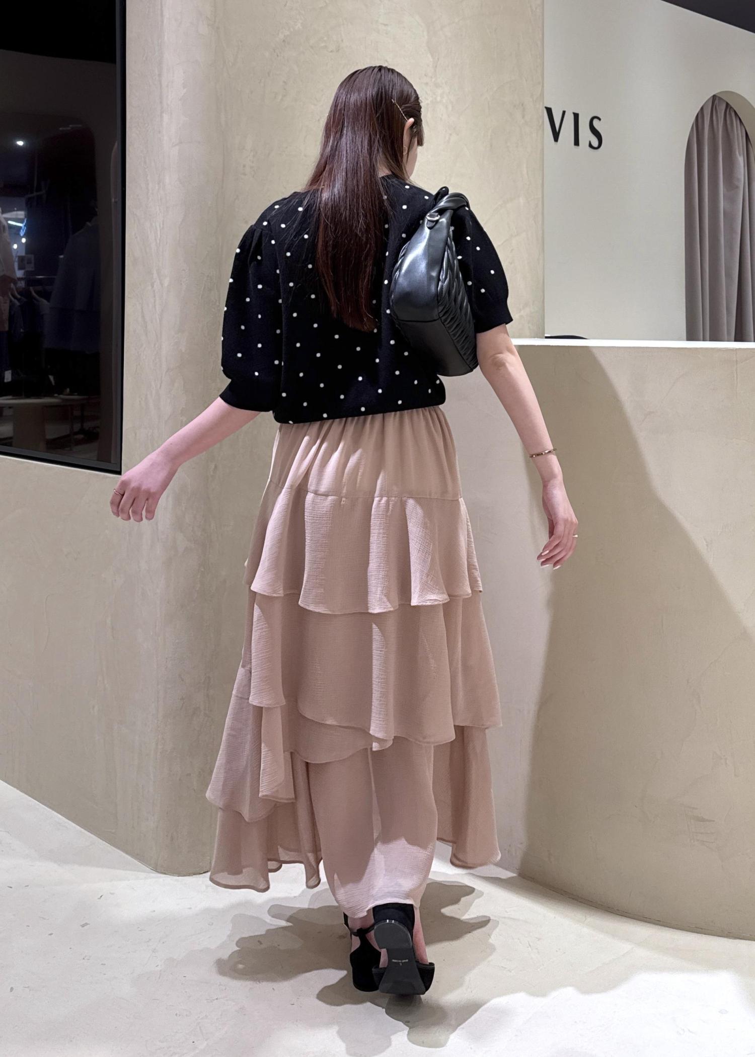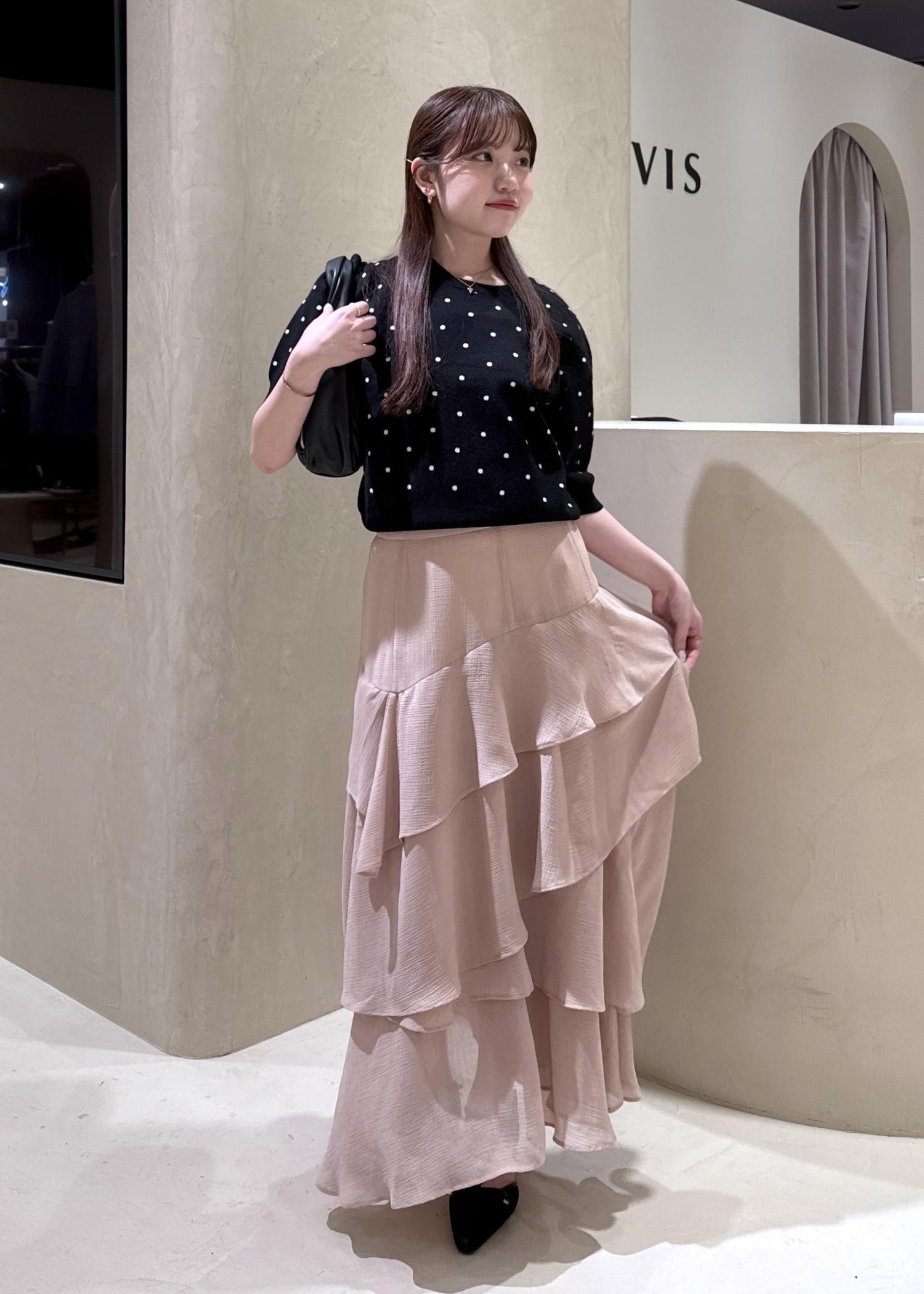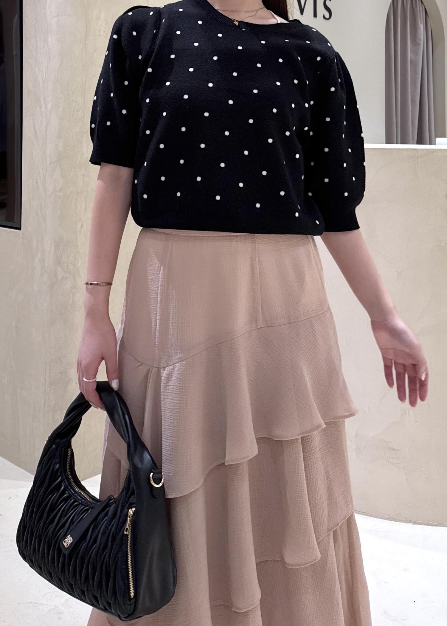 パッと目を引くドット柄ニットトップスに、ひらりと動くたび華やかなティアードスカートを合わせて、デートコーデにぴったりのフェミニンコーデの完成!♡
