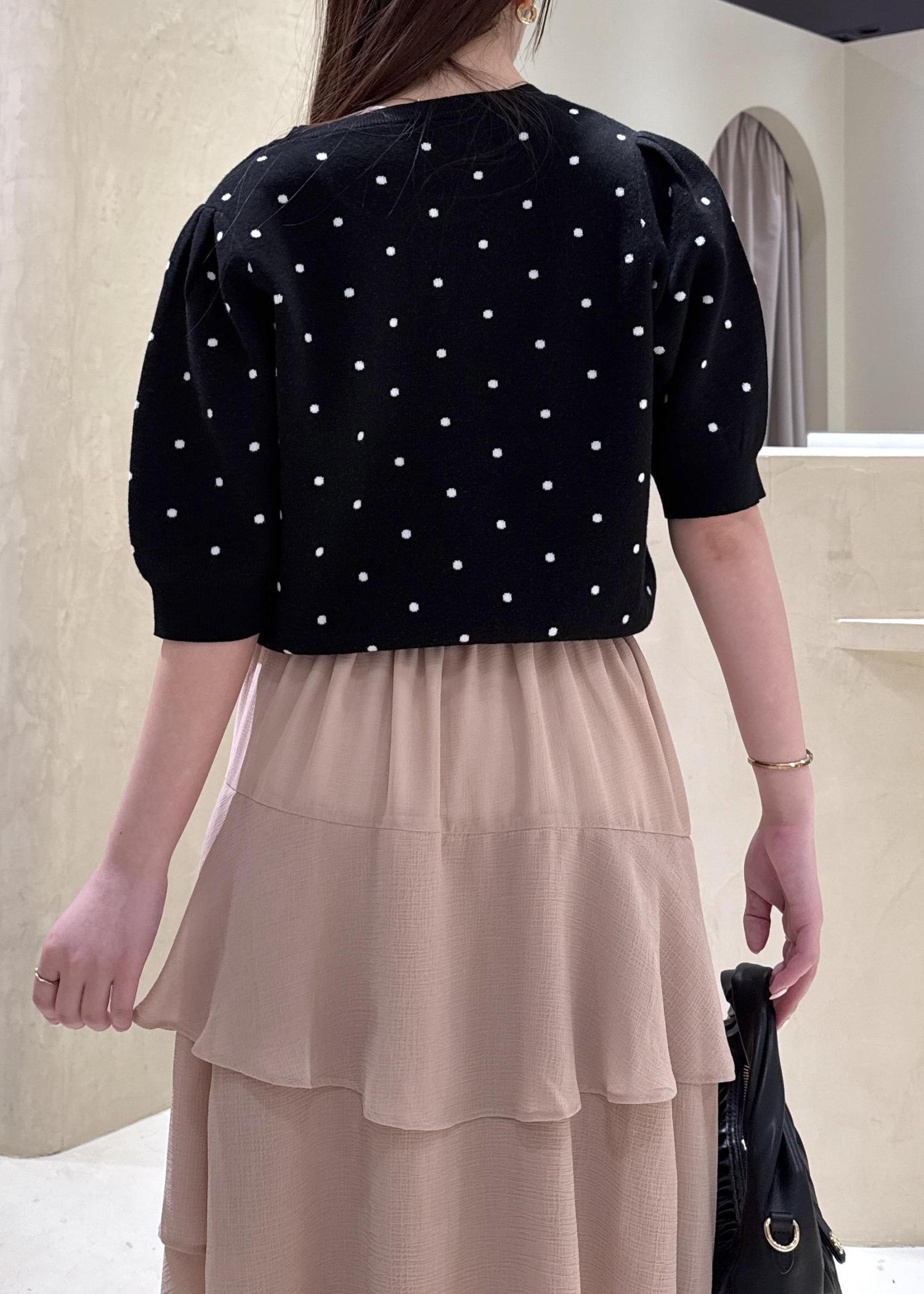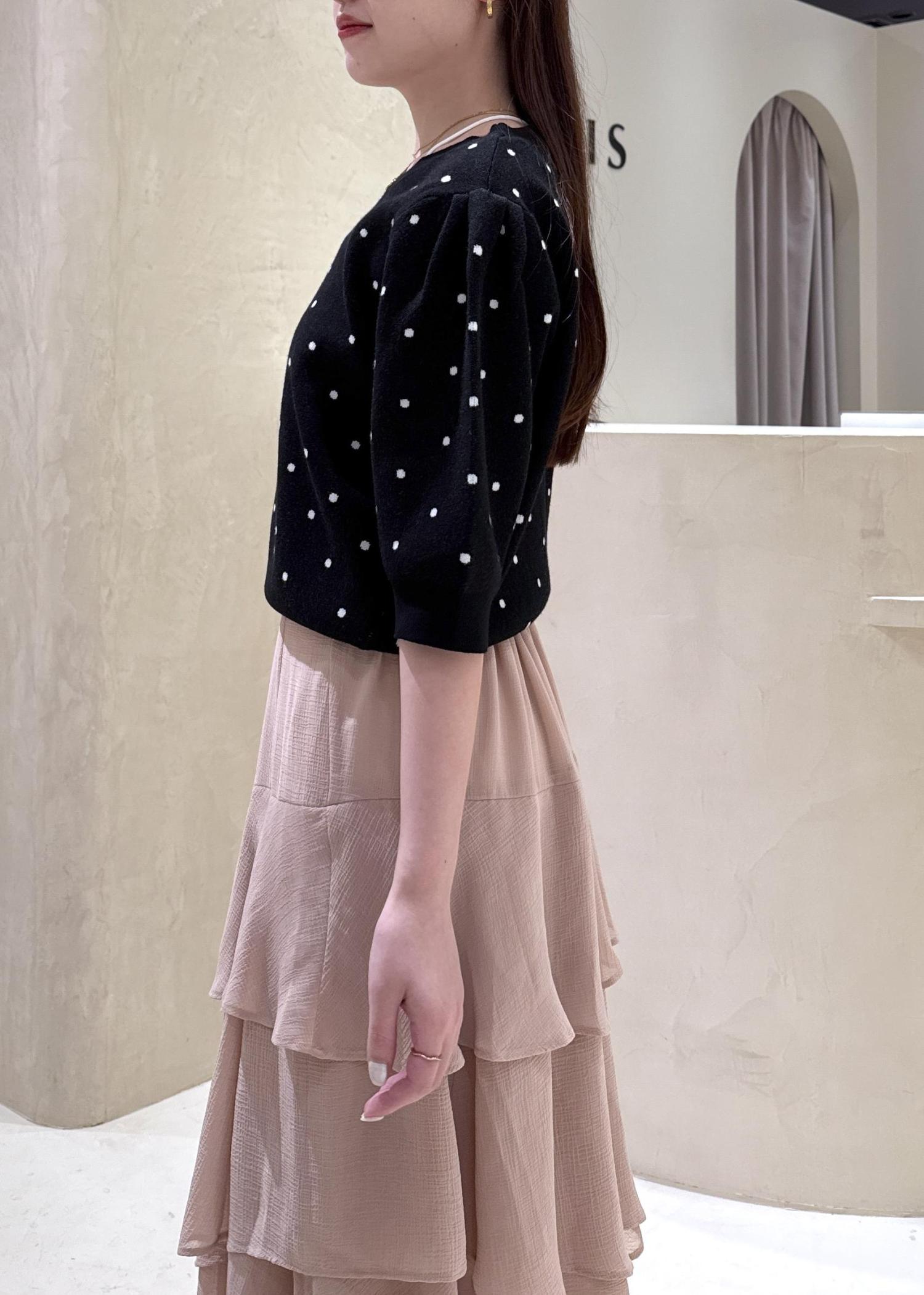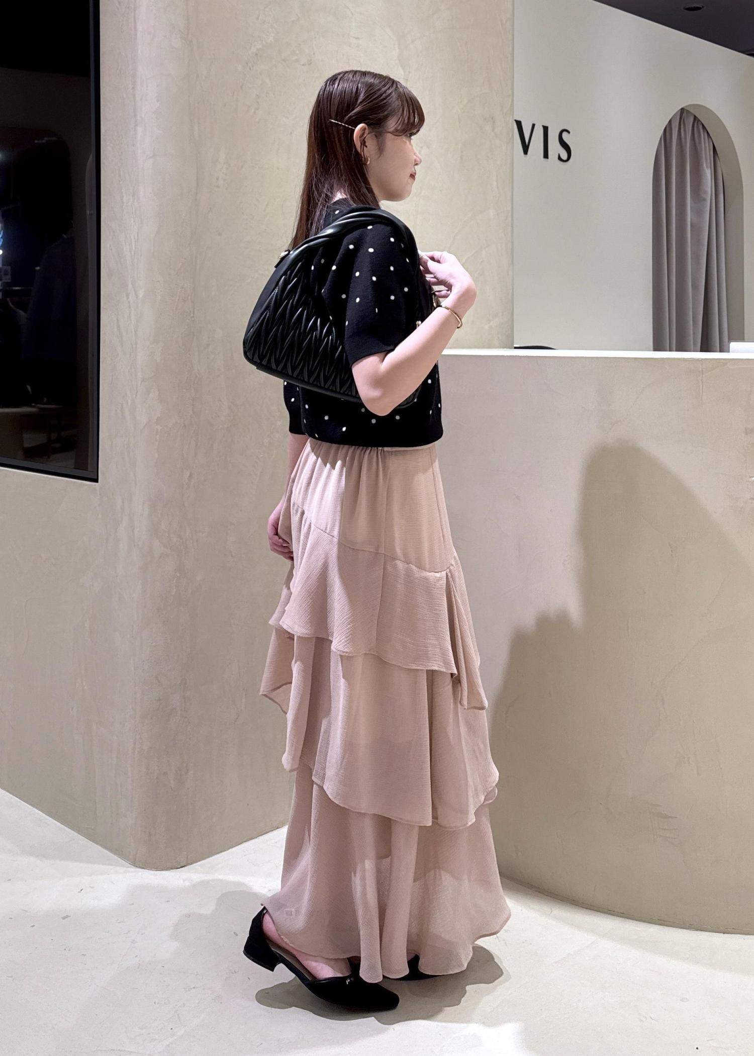パッと目を引くドット柄ニットトップスに、ひらりと動くたび華やかなティアードスカートを合わせて、デートコーデにぴったりのフェミニンコーデの完成!♡