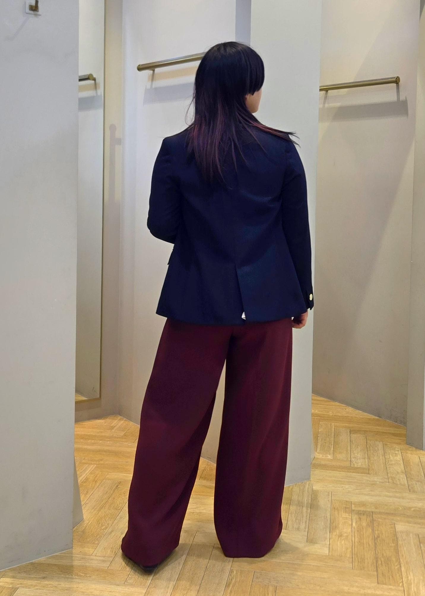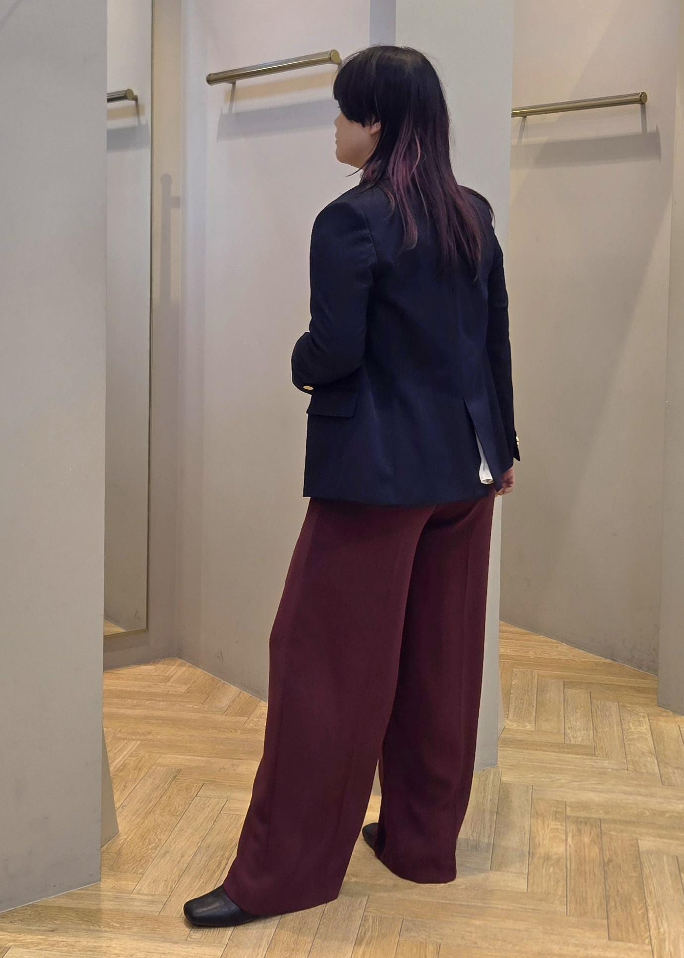 秋カラーのボルドーのワイドパンツでこなれ感を演出しつつ楽に着れるコーデにしました。