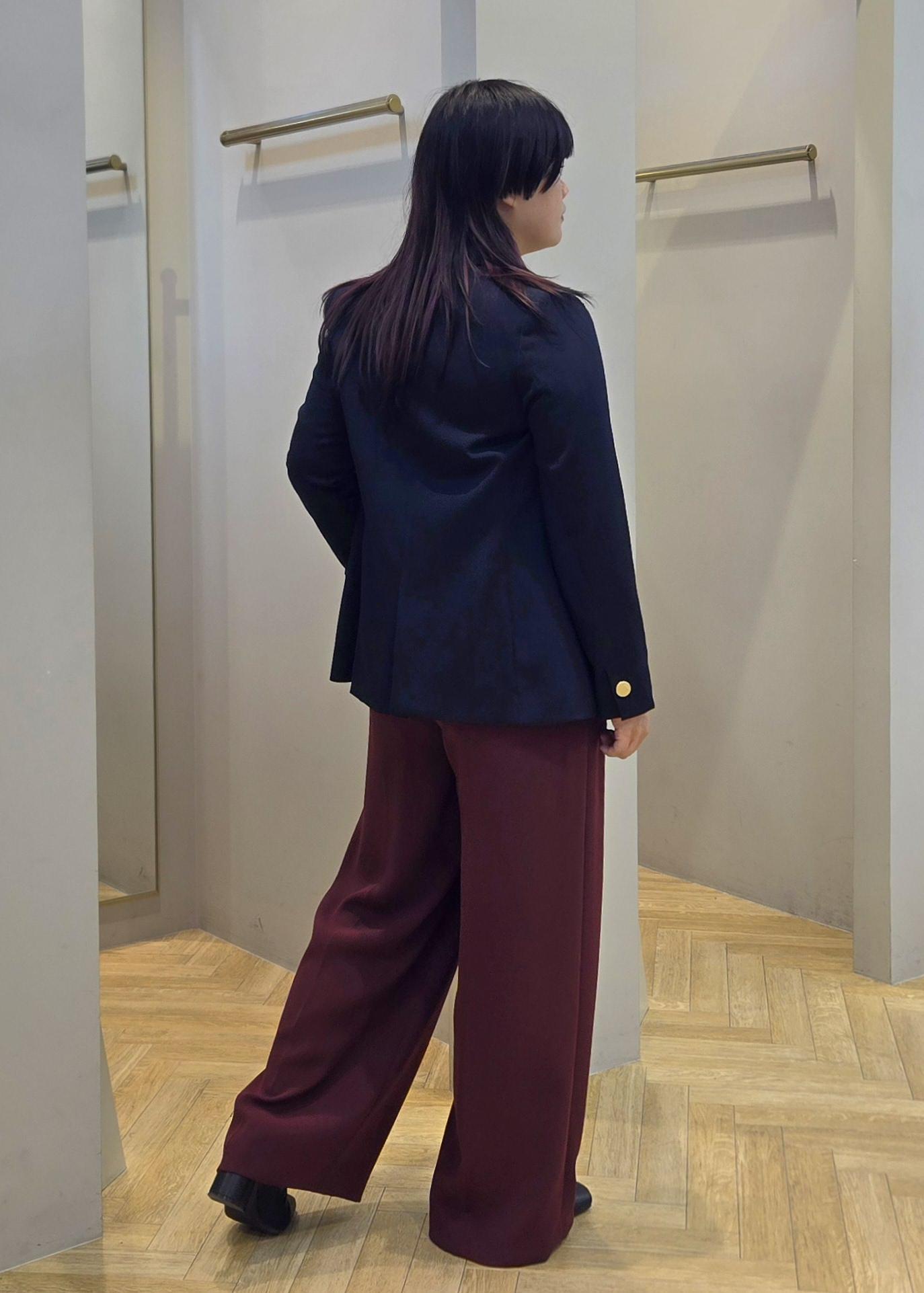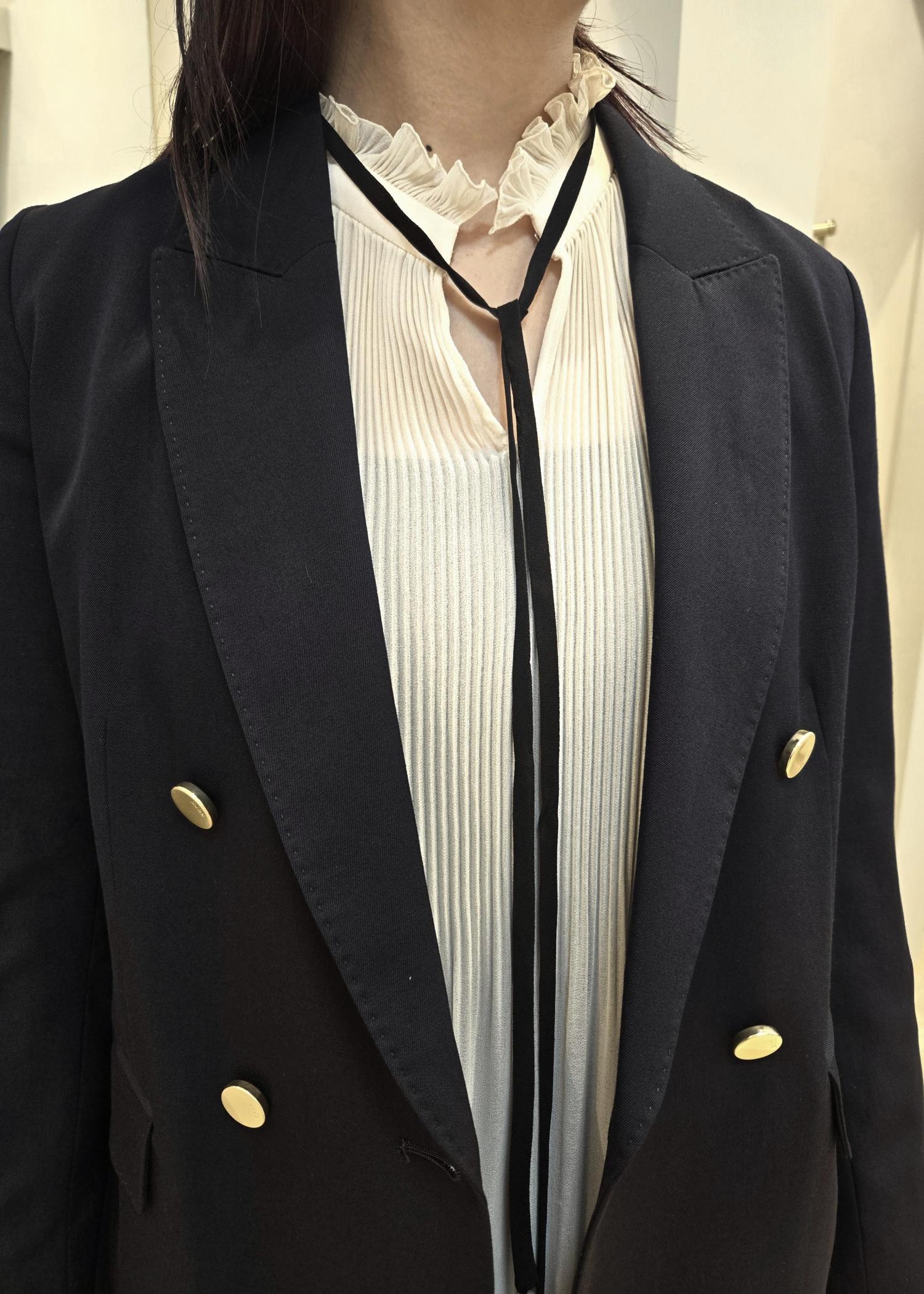 スタイリッシュ見えするジャケットでプリーツブラウスと合わせることで甘さも加わります。