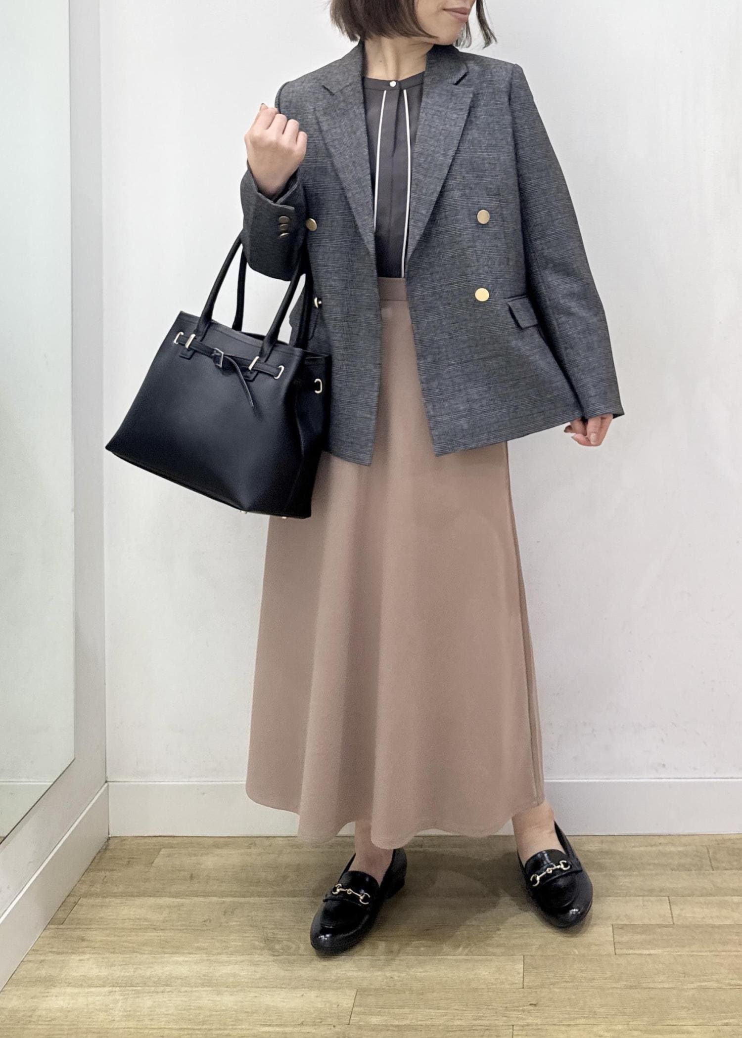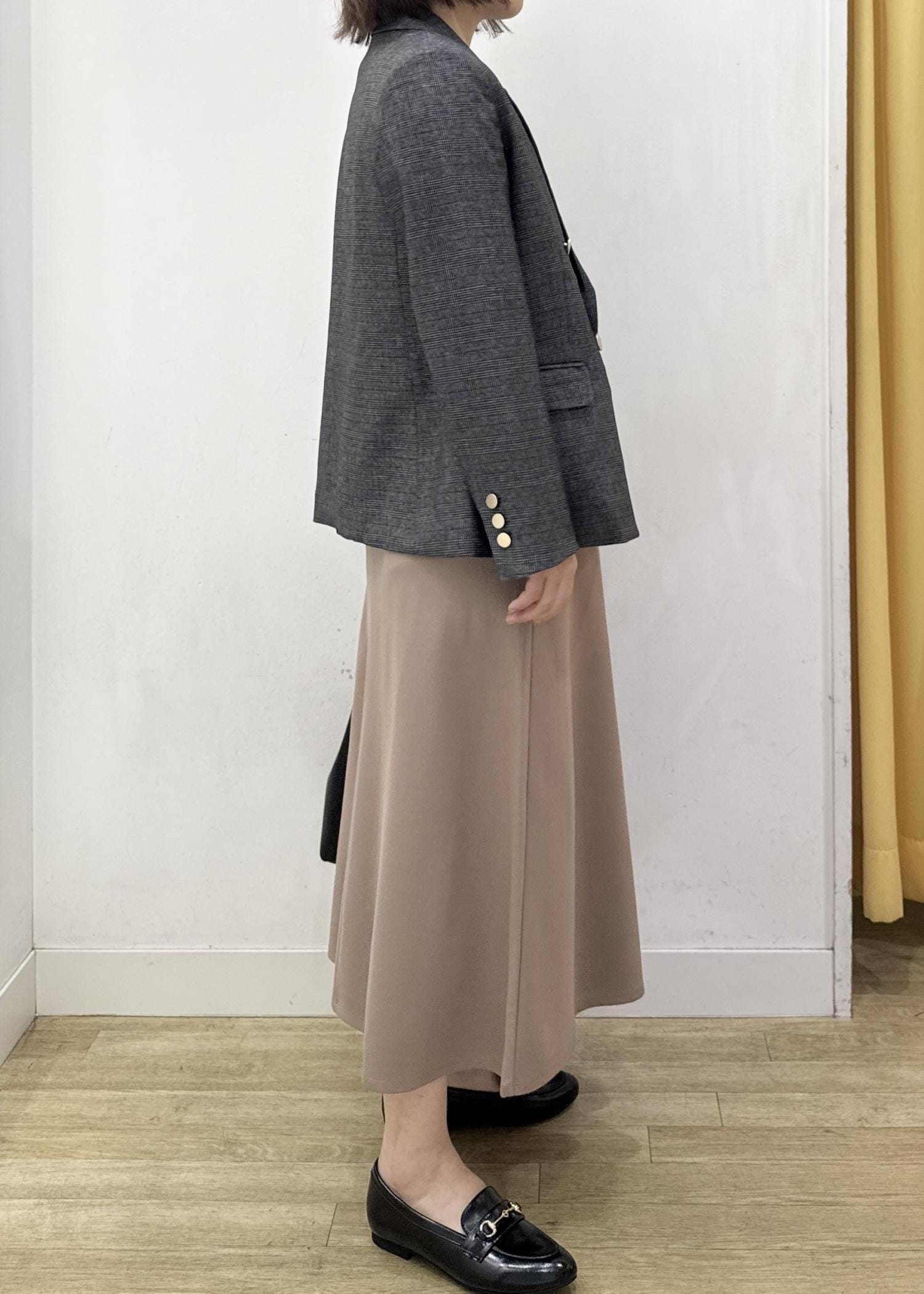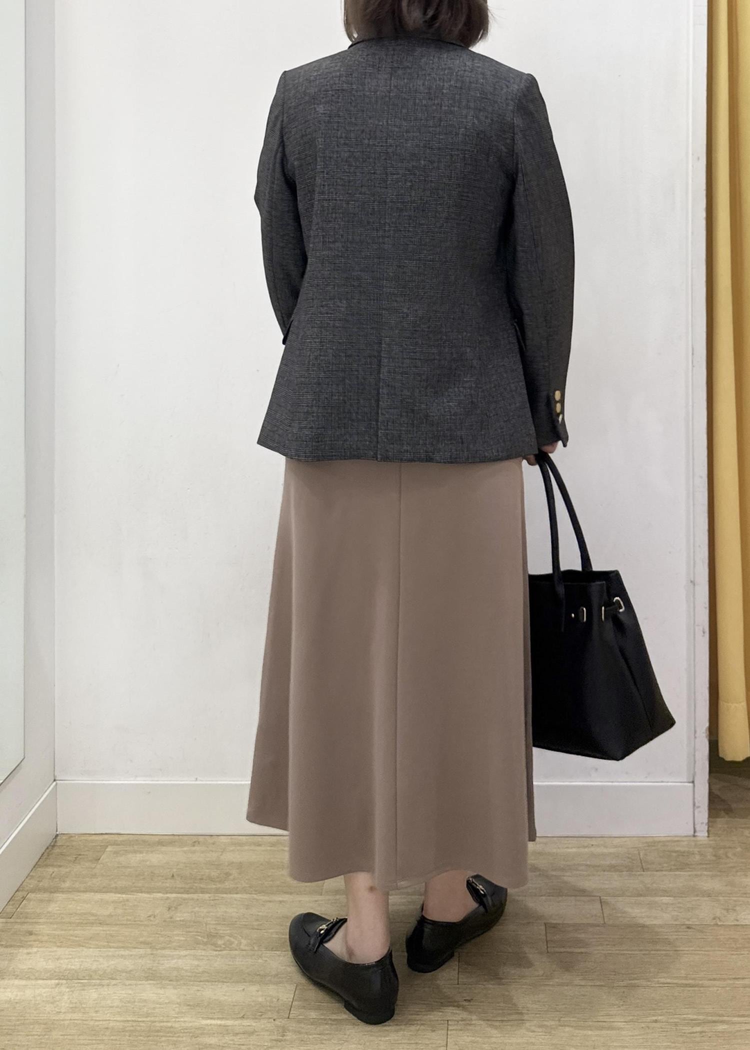 通常サイズに比べると肩幅や身幅は少しコンパクトですが、全体のサイズ感もブラウスや薄手のニット合わせで窮屈感は気にならないピッタリなサイズ感でした。 -
