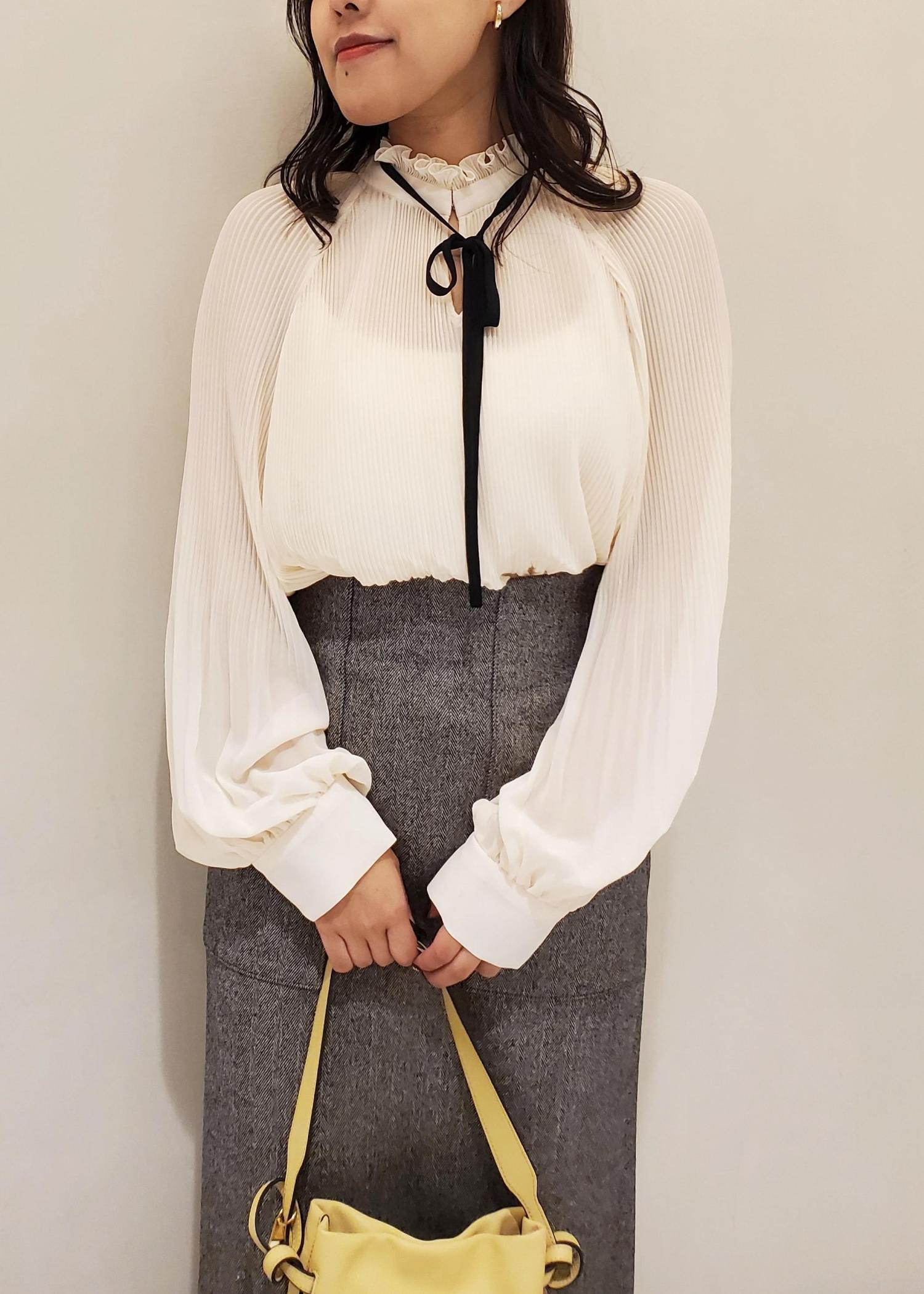 予約ROPÉプリーツデザインブラウス/イージーケアオフホワイト / F¥28,600レビューとろみ感のあるシフォンプリーツブラウス。