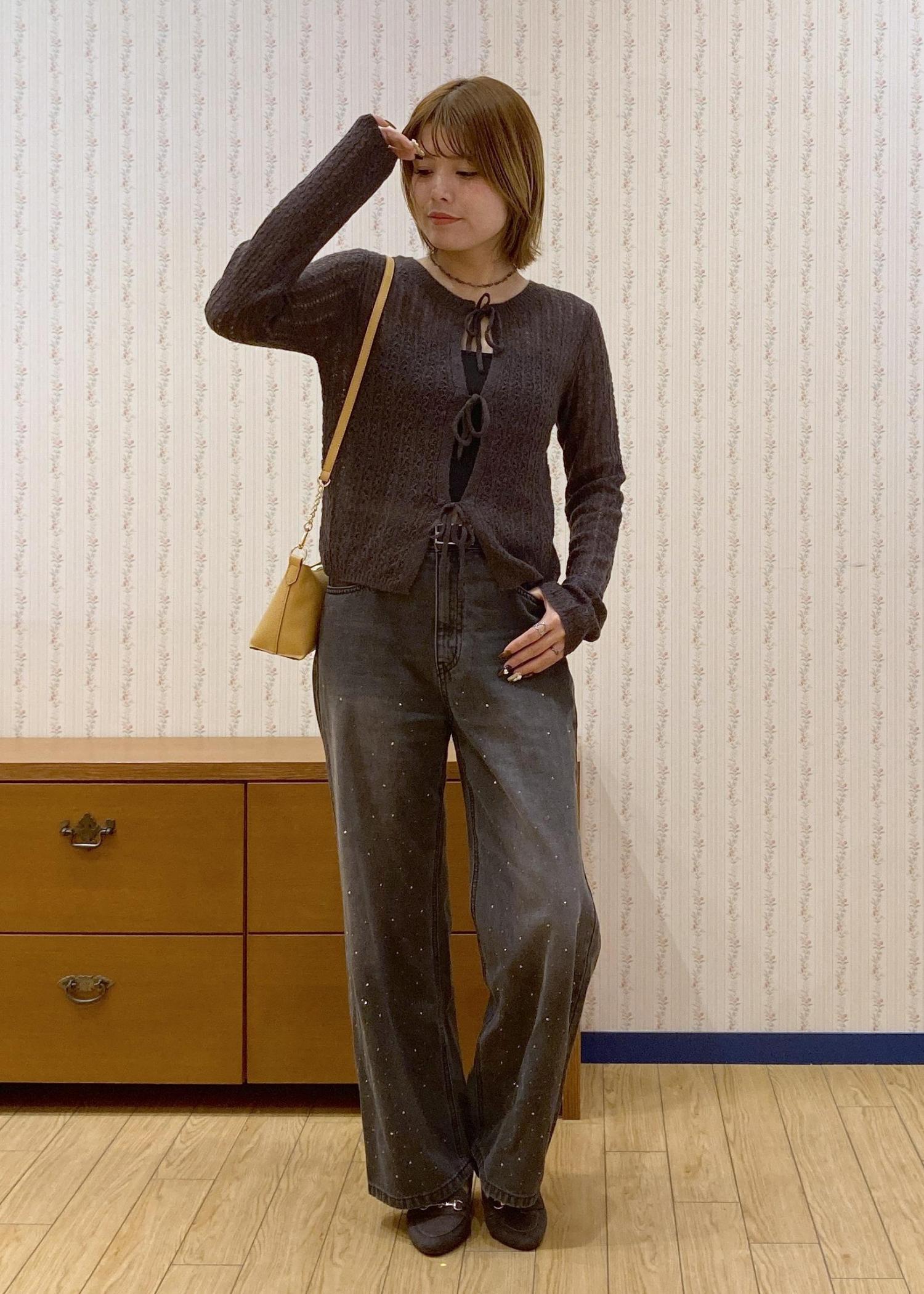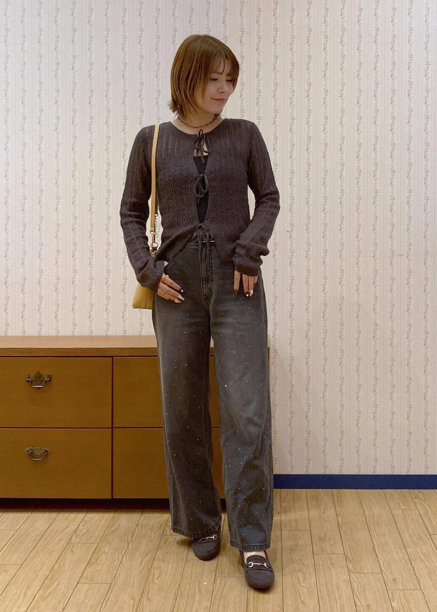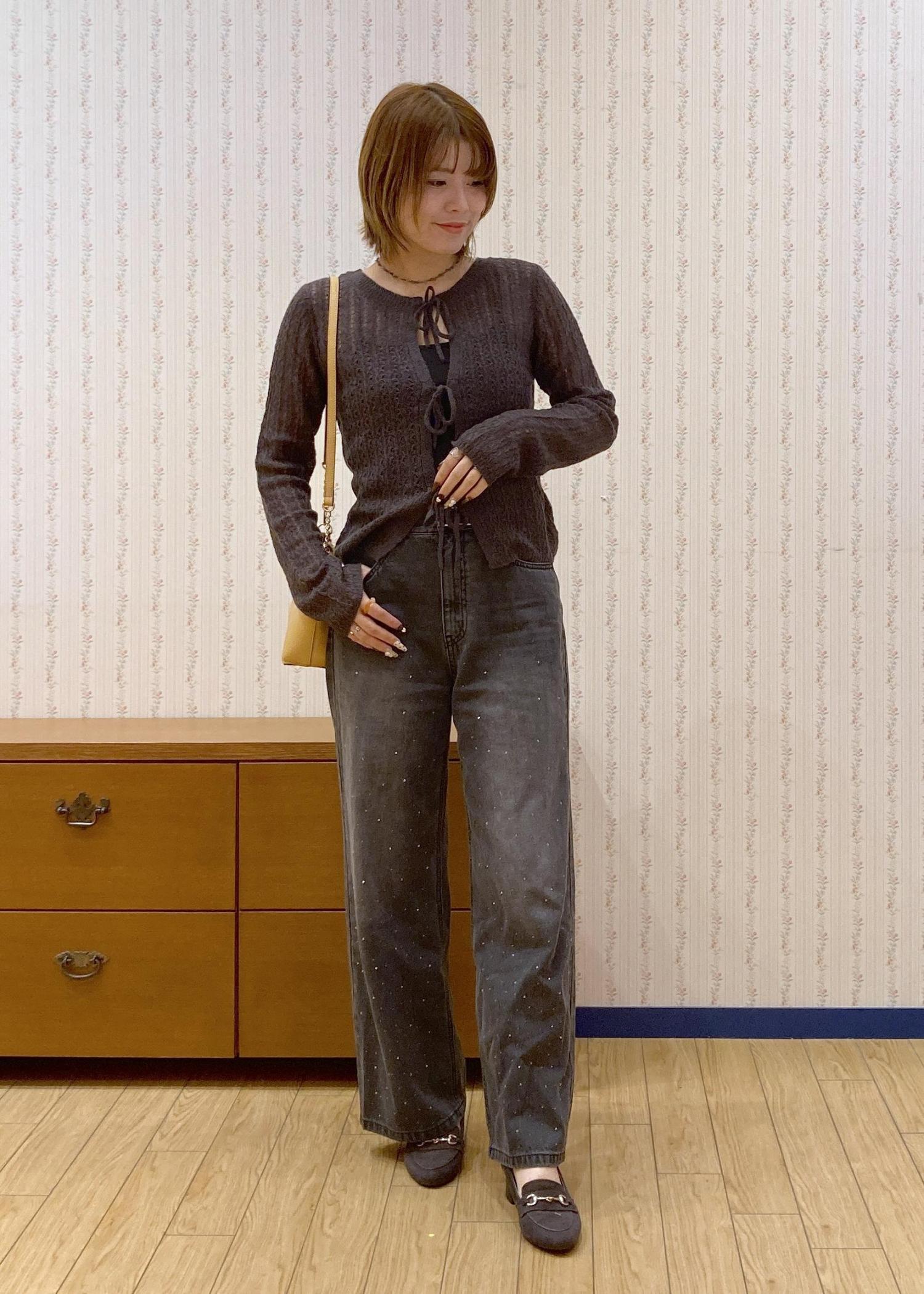 透かし編みのカーディガンにビジューデニムを合わせたシンプルカジュアルなコーディネートです。