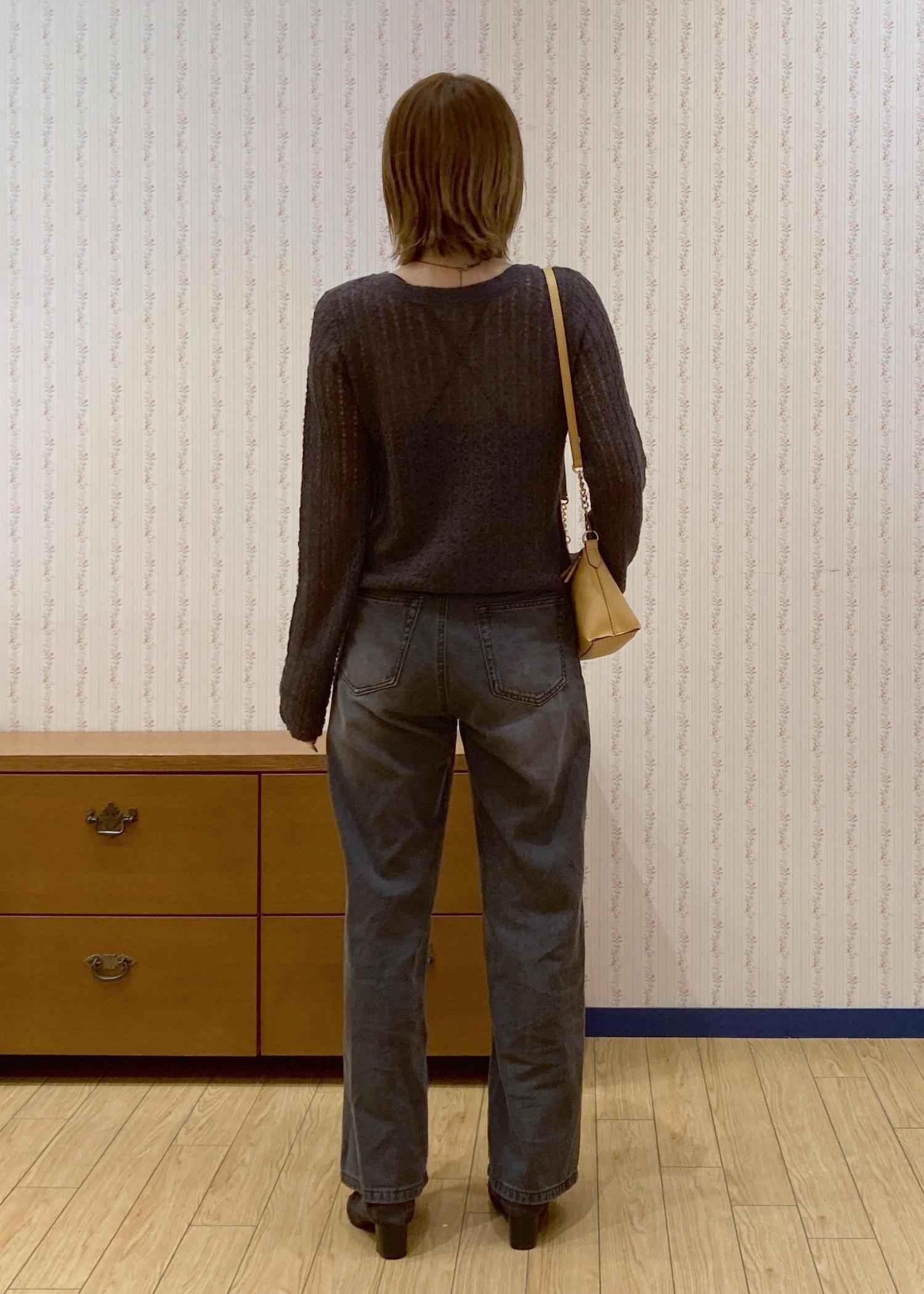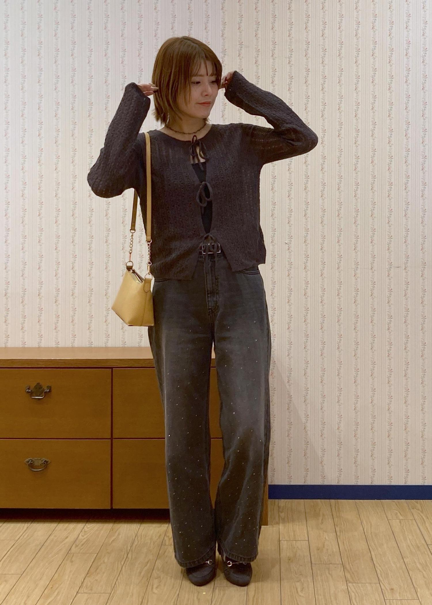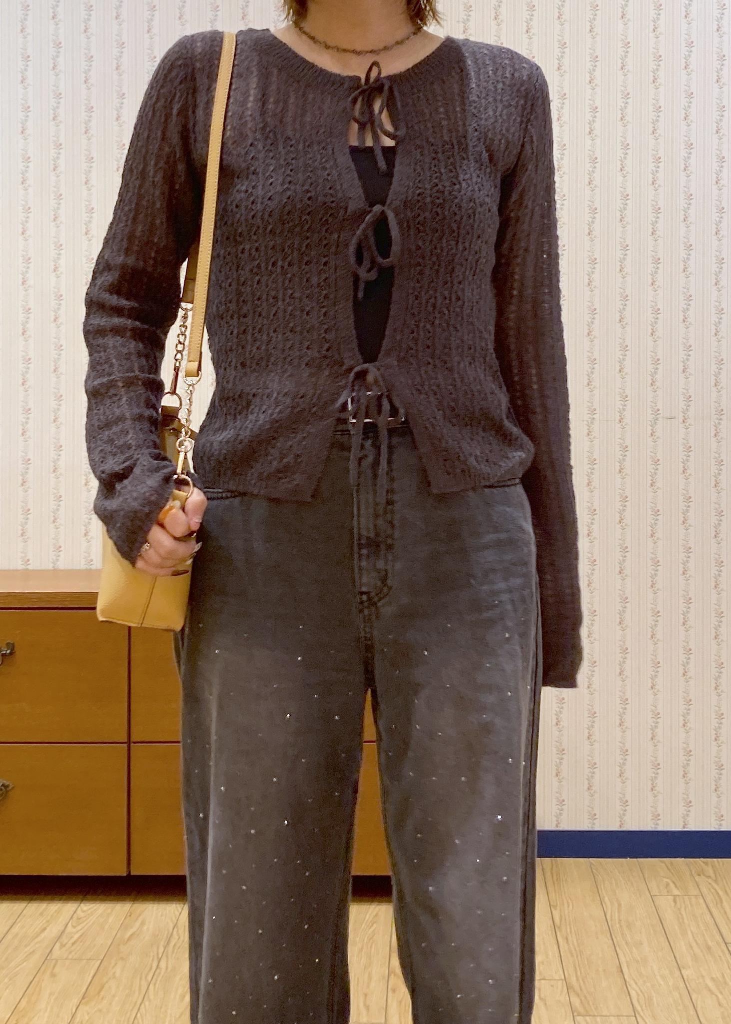 透かし編みのカーディガンにビジューデニムを合わせたシンプルカジュアルなコーディネートです。