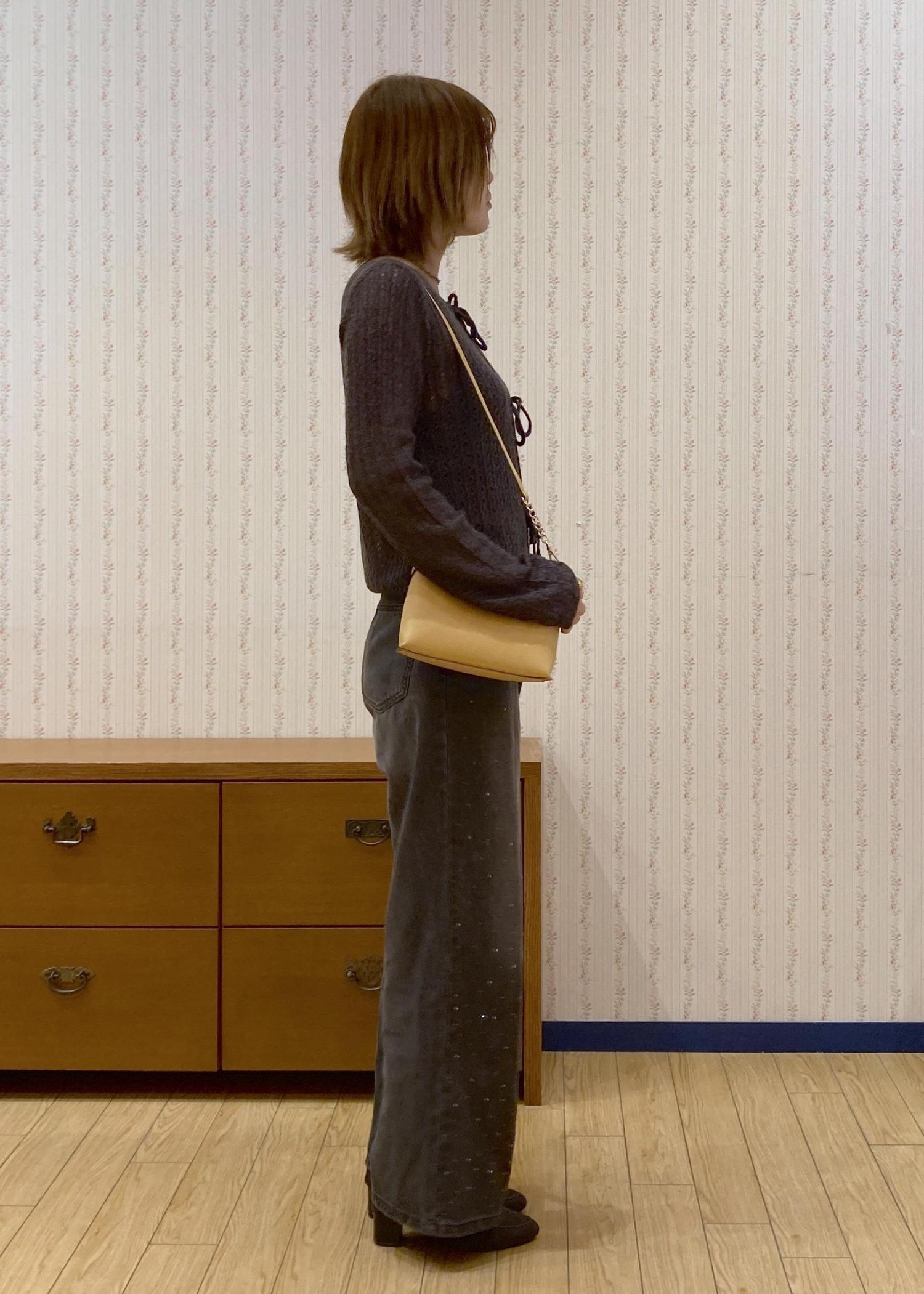 コーディネートが暗くなりすぎないようにバッグで差し色をいれたのがポイントです。