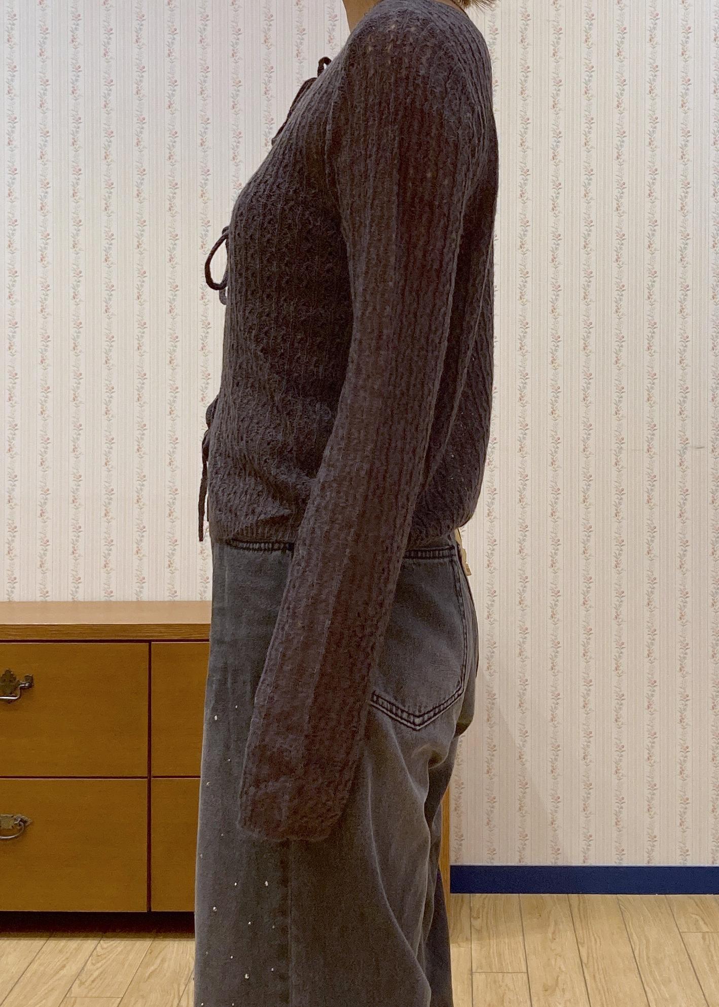 フロント部分には3つのリボンがあり、閉めても開けても着れる万能カーディガンです!
