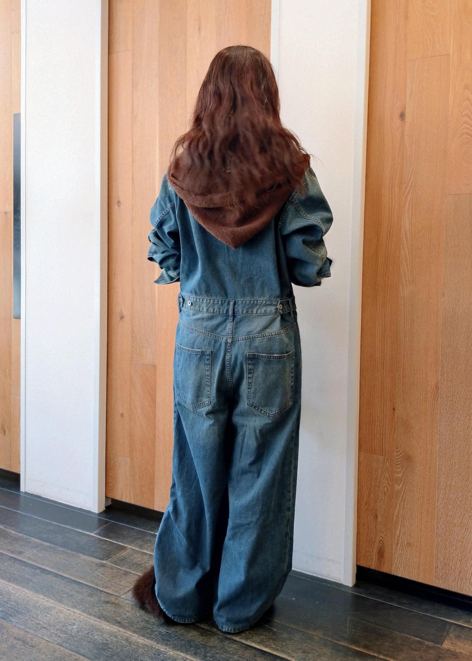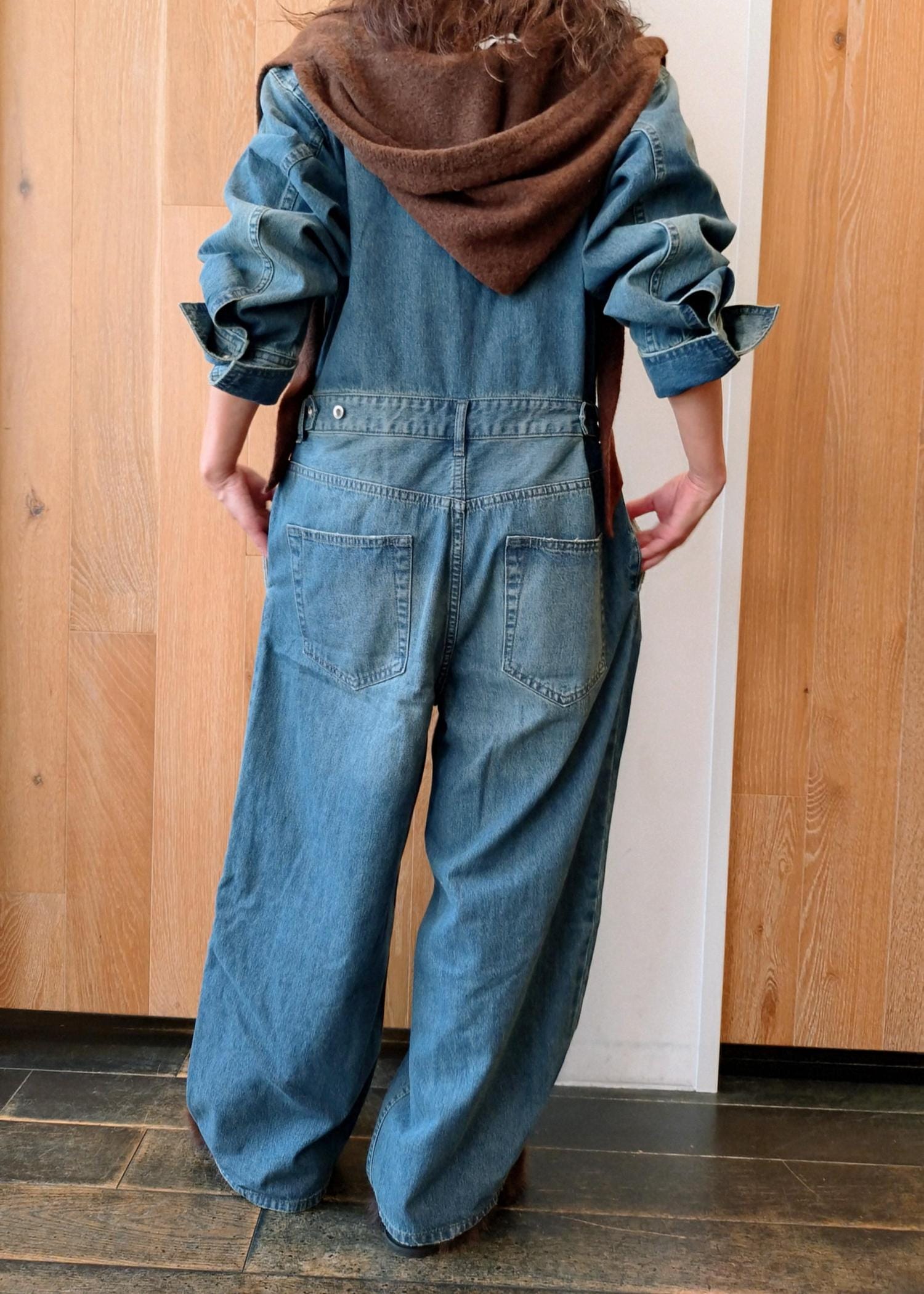 ウォッシュ加工で柔らかく着心地の良いデニムのジャンプスーツ。