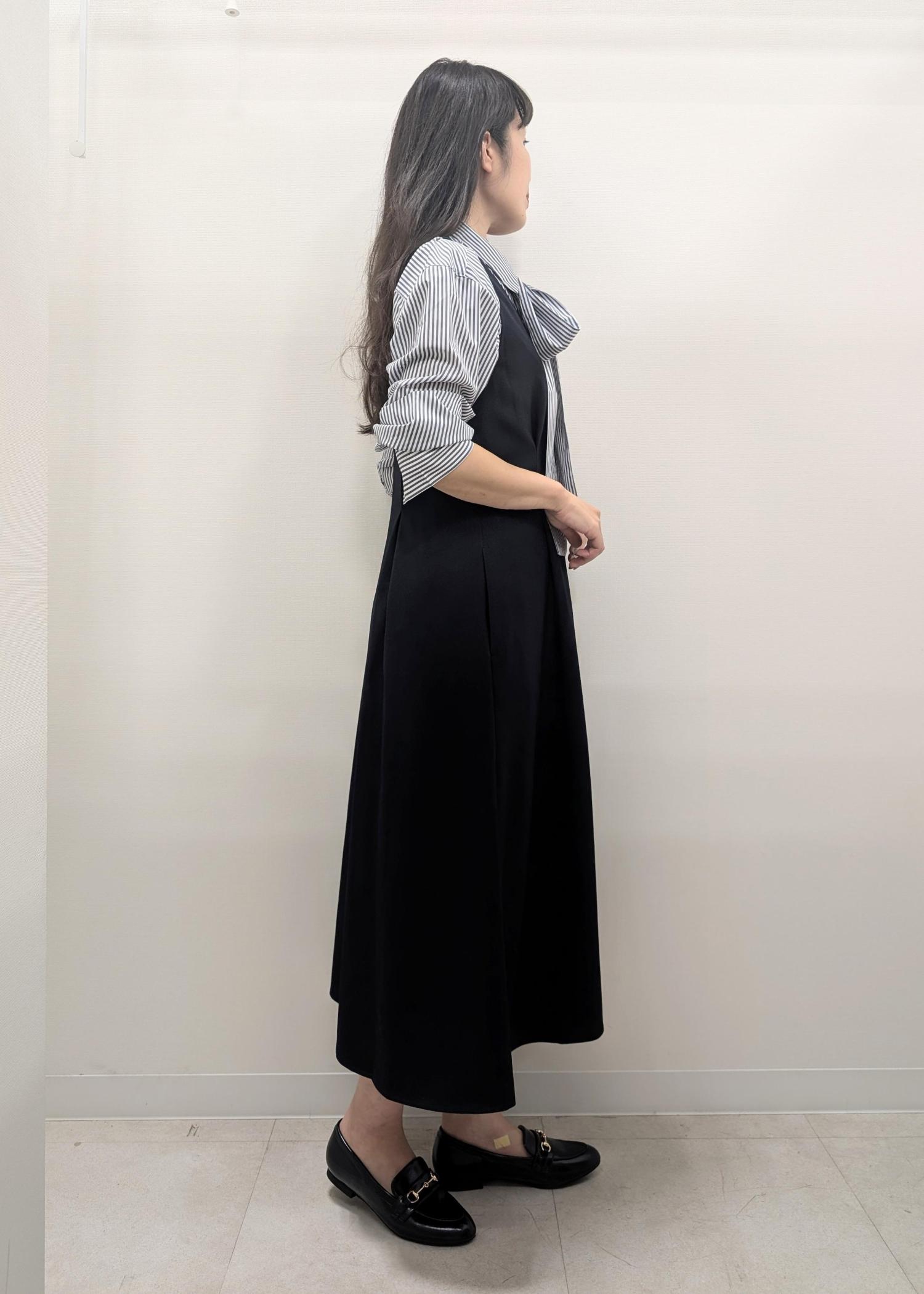 私は骨格ウェーブで、ゆったりめのシャツをそのまま着ると膨張するので、ビスチェやジャンパースカートのインナーにしてボリュームを抑えるようにコーディネートしています。 -