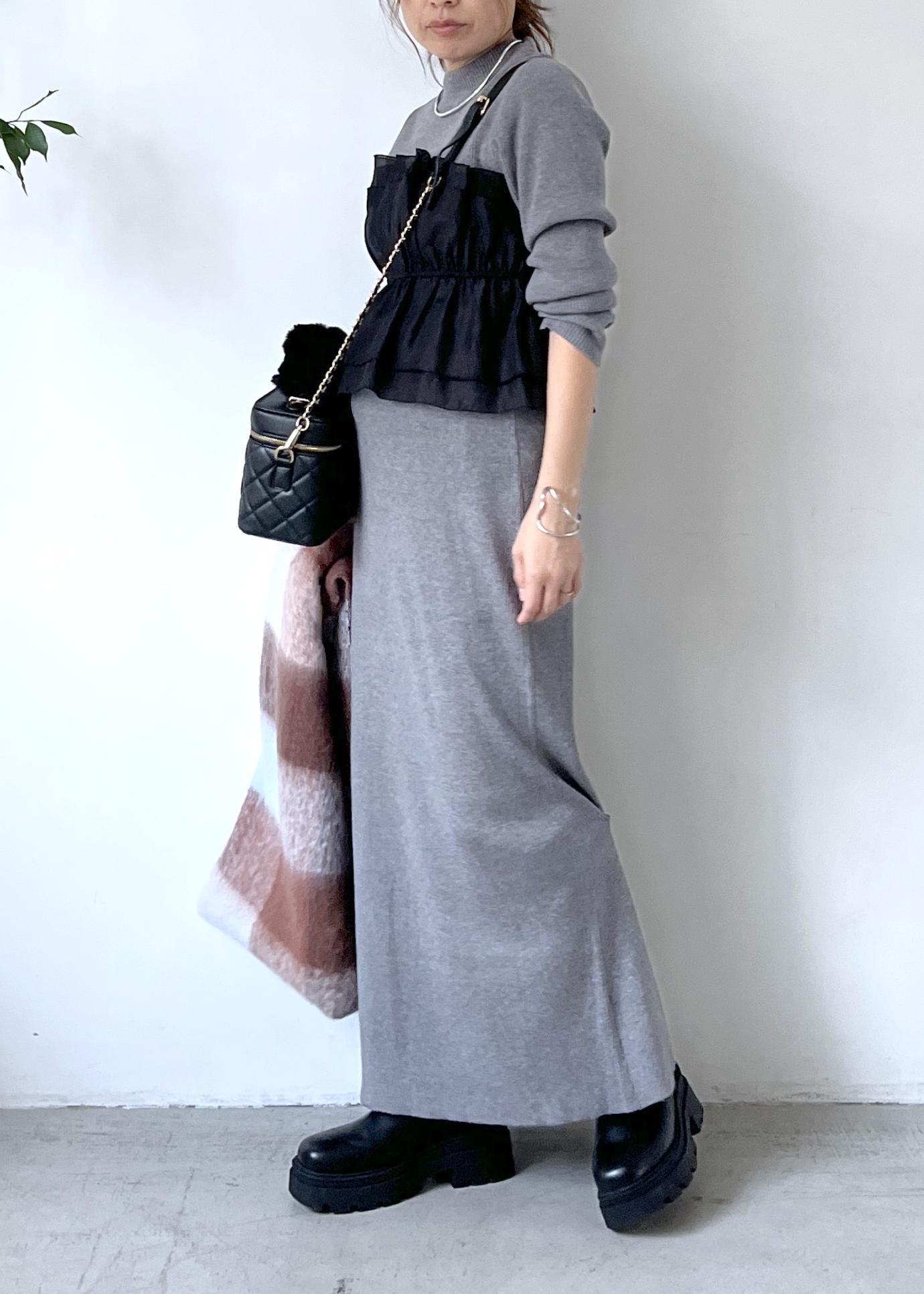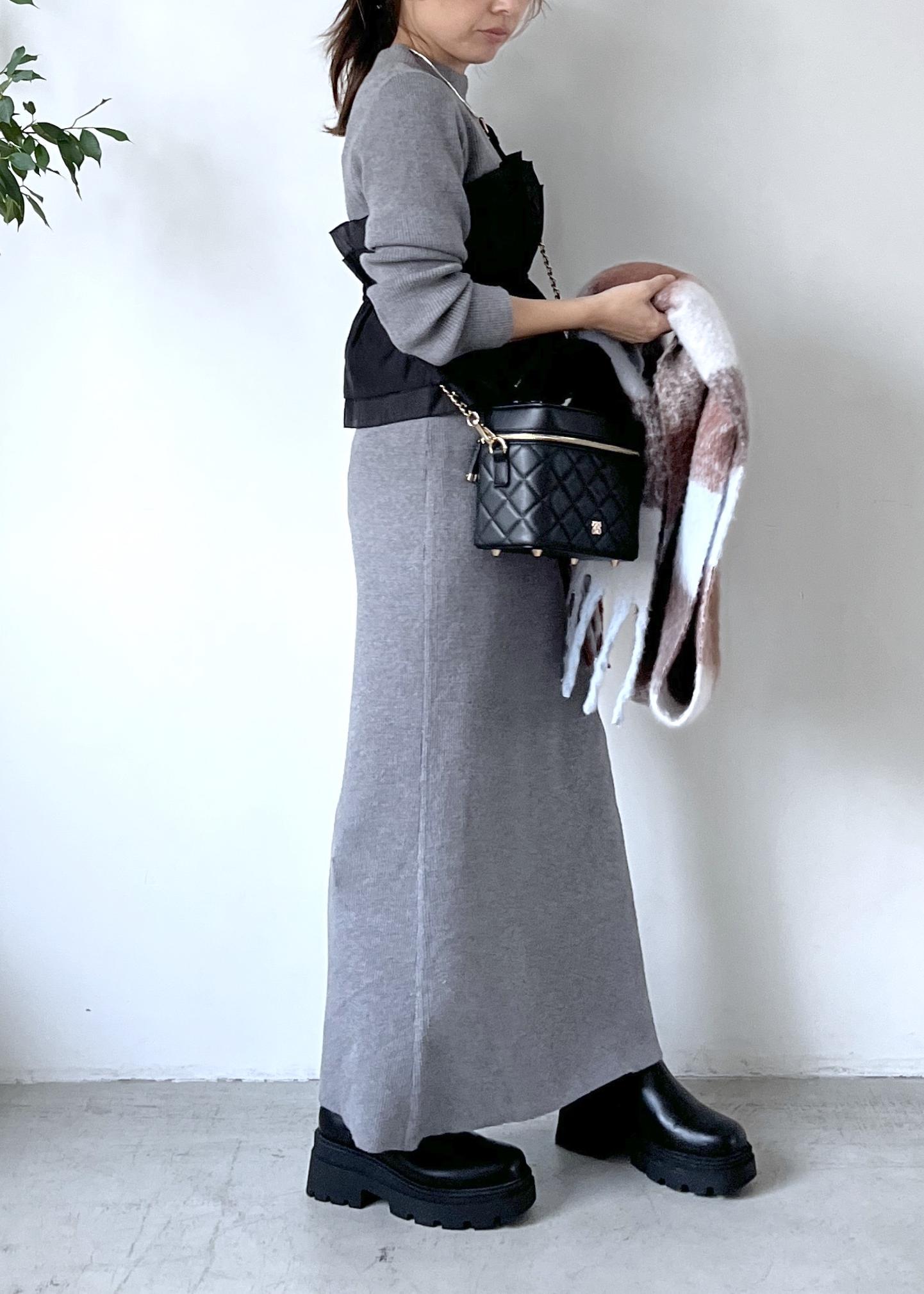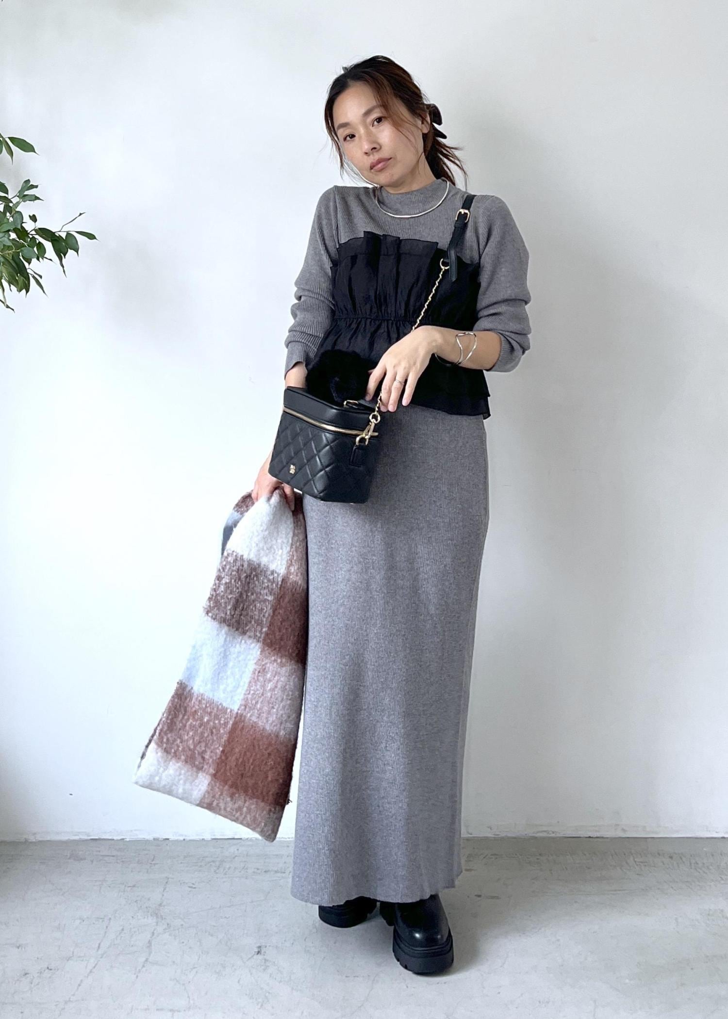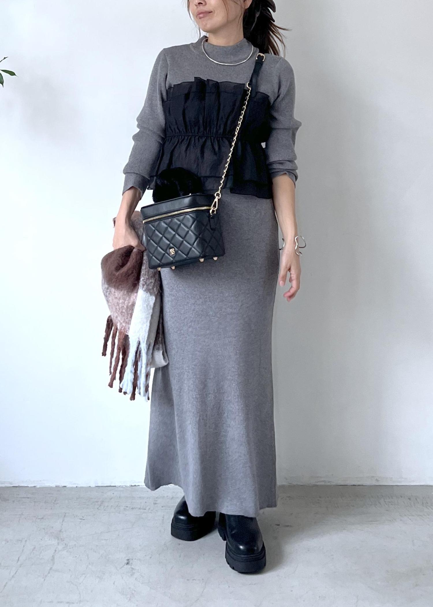 毎回大人気のドッキングニットを、グレーのトップスとスカートのセットアップでシックに着こなし。