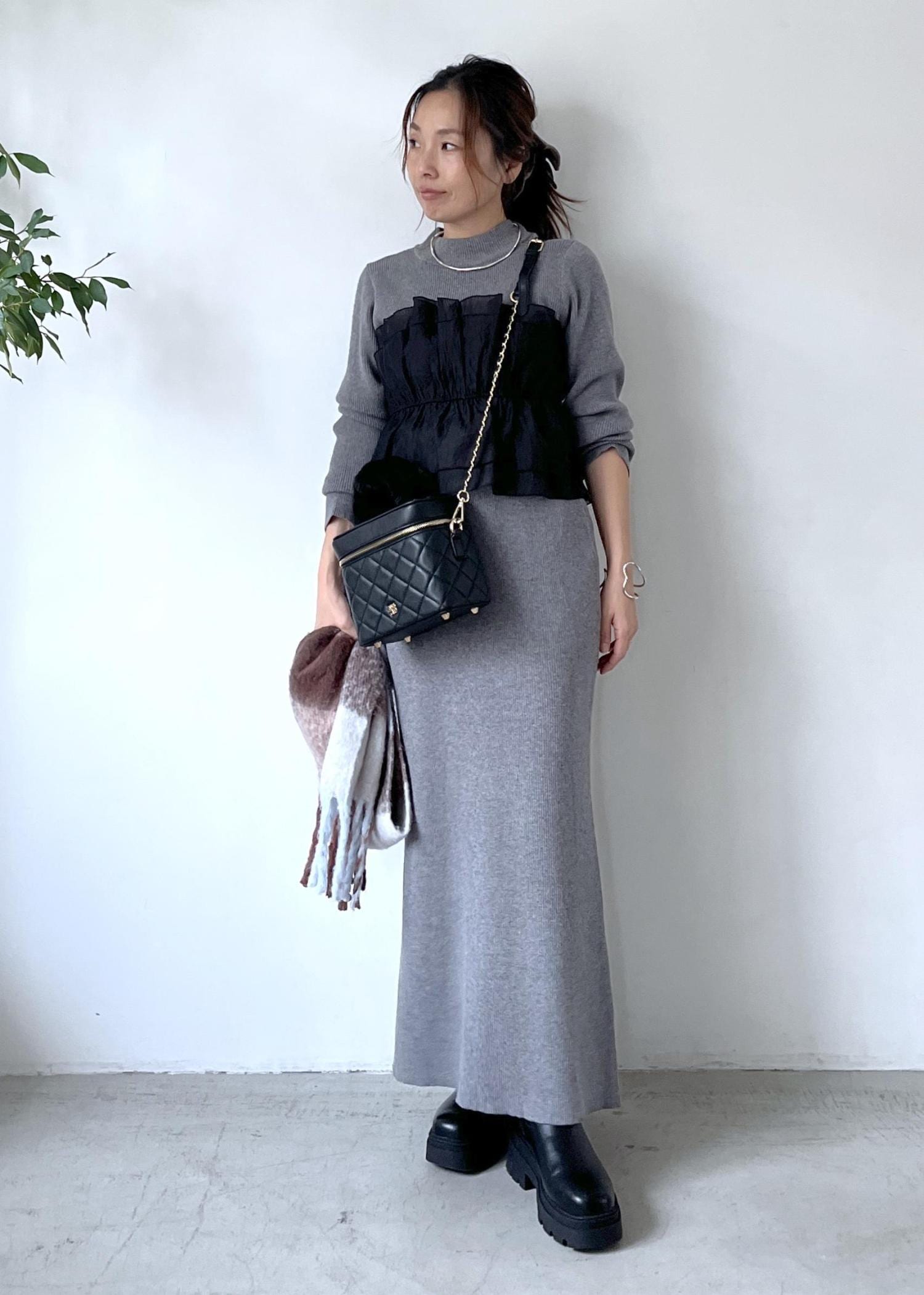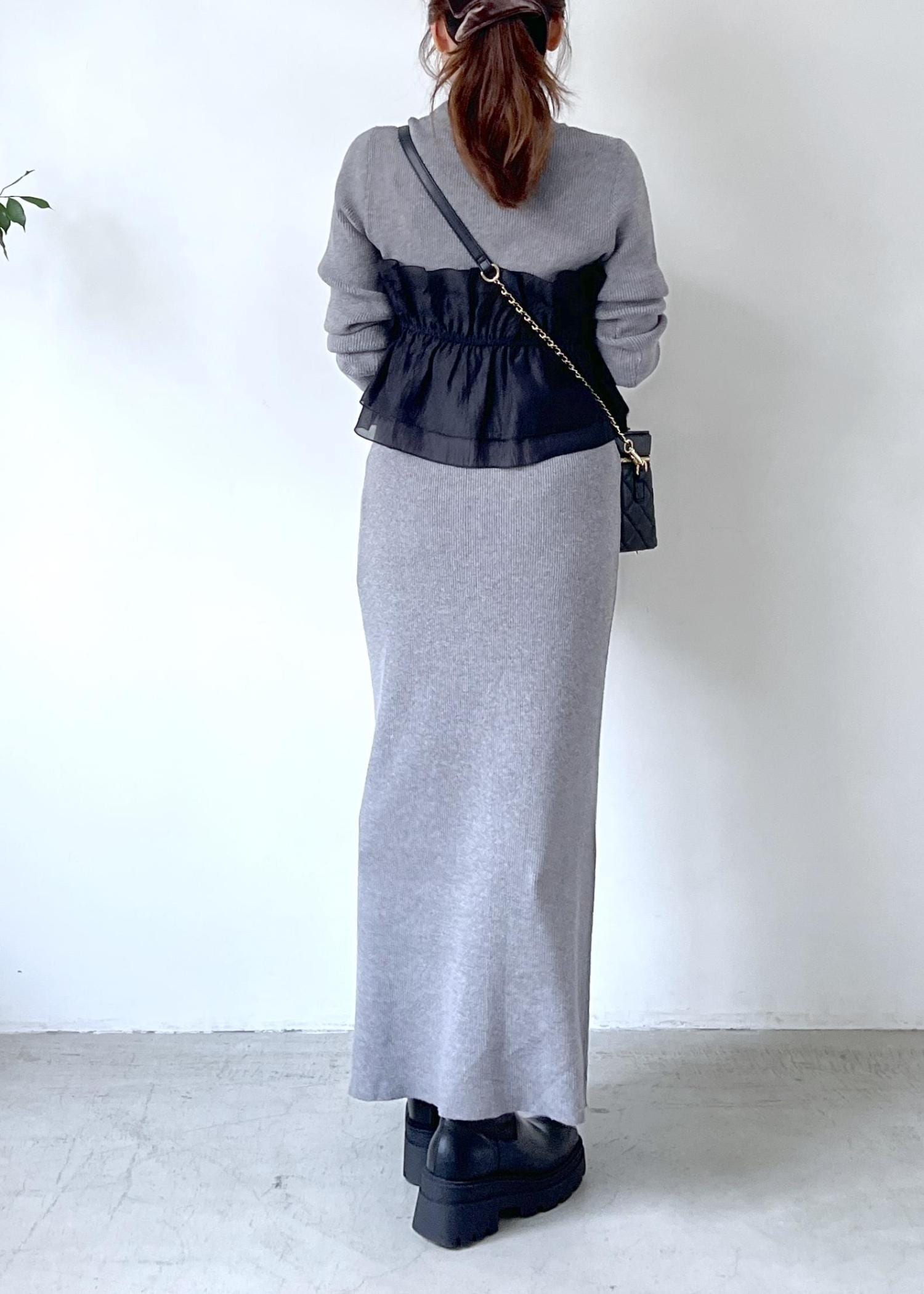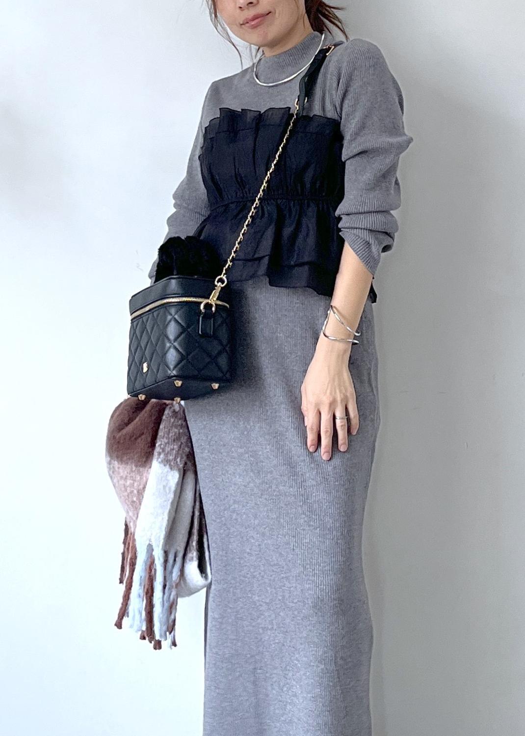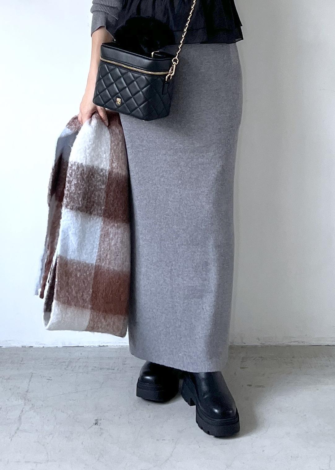 毎回大人気のドッキングニットを、グレーのトップスとスカートのセットアップでシックに着こなし。