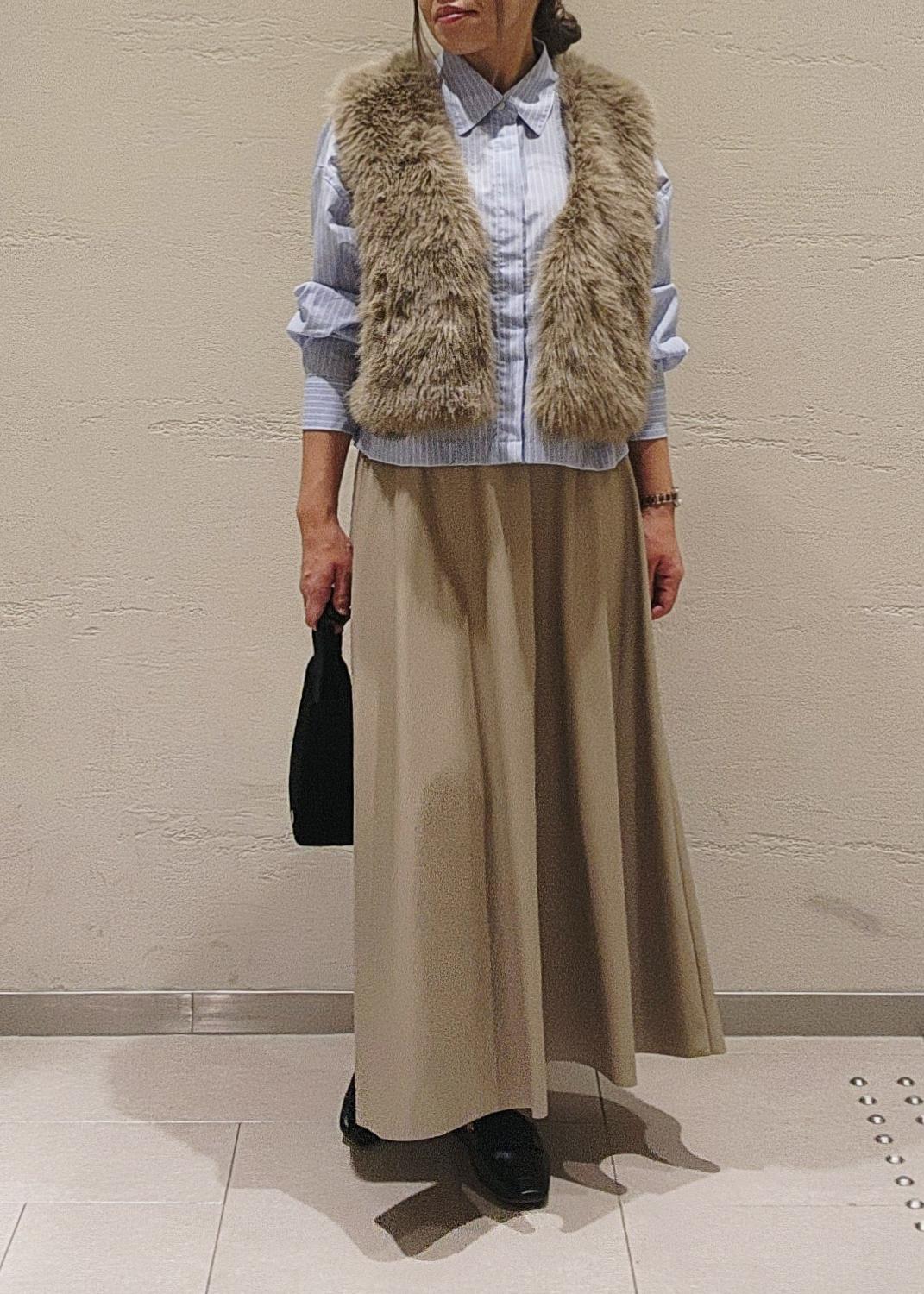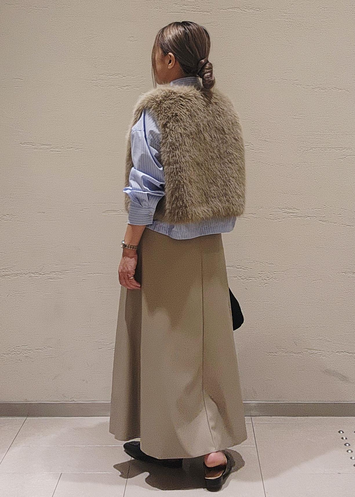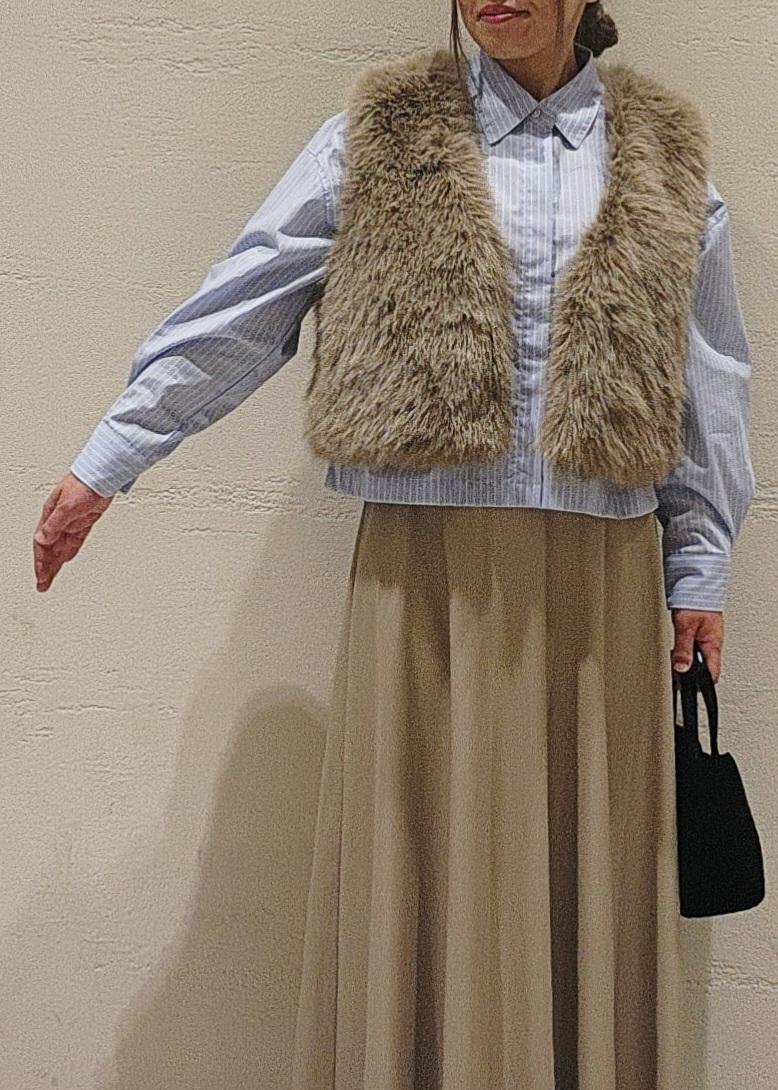 いつものコーデにサッと羽織るだけで、華やかさと季節感の出るファーベストは、季節の端境期にお勧め◎