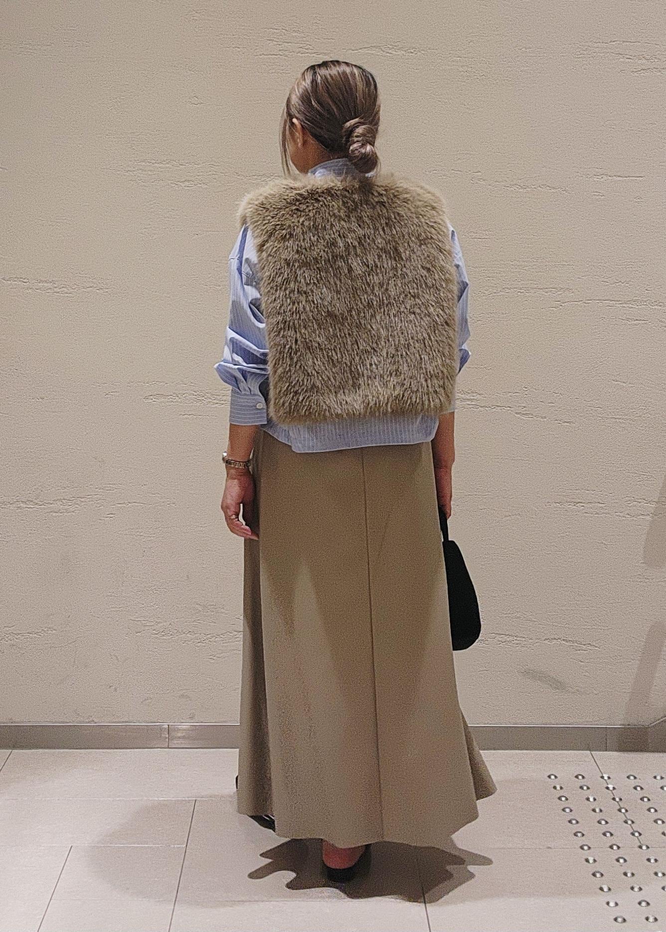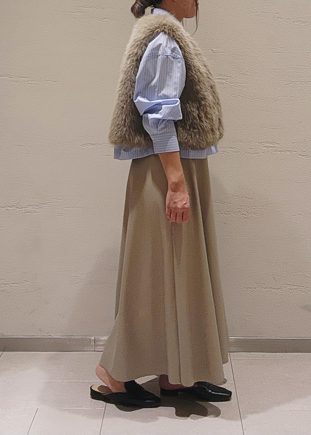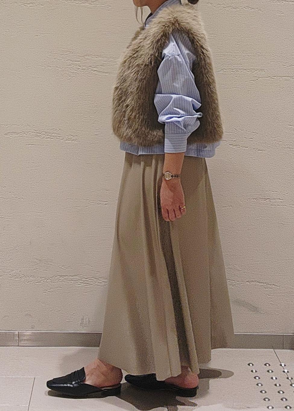 いつものコーデにサッと羽織るだけで、華やかさと季節感の出るファーベストは、季節の端境期にお勧め◎