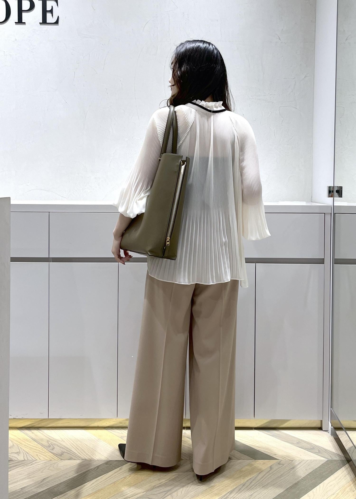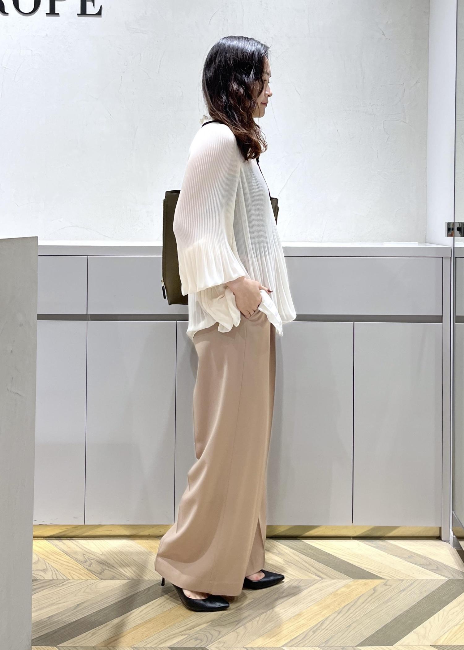シアー素材で透け感はあるので、オフホワイトのカラーはベージュや白のインナーだと綺麗に着用いただけます。 -