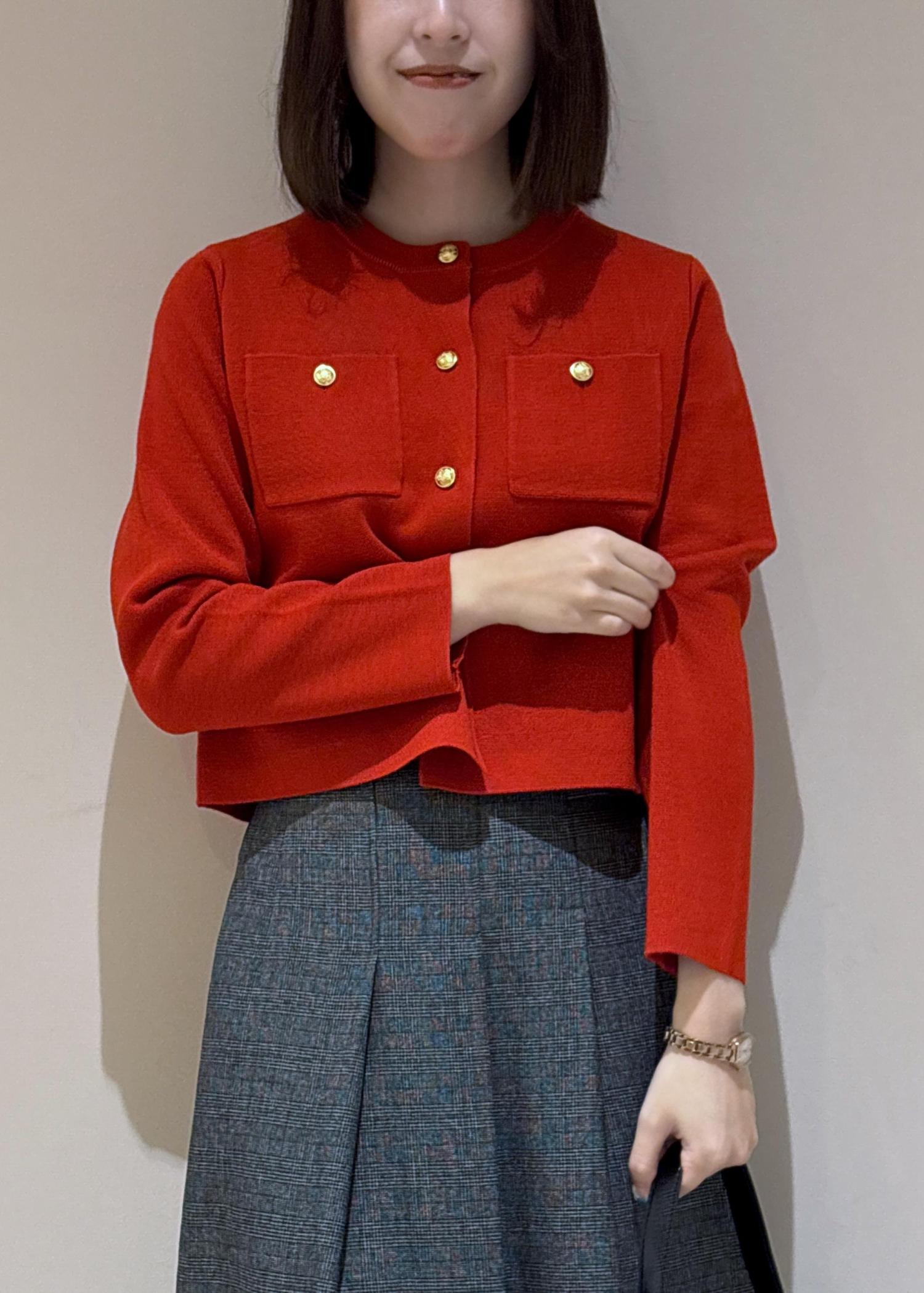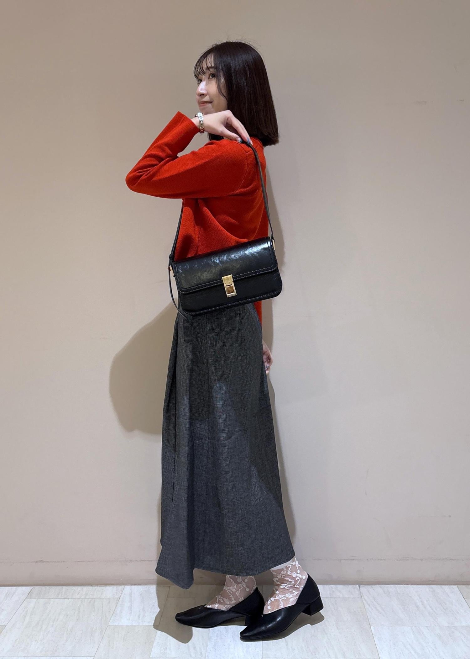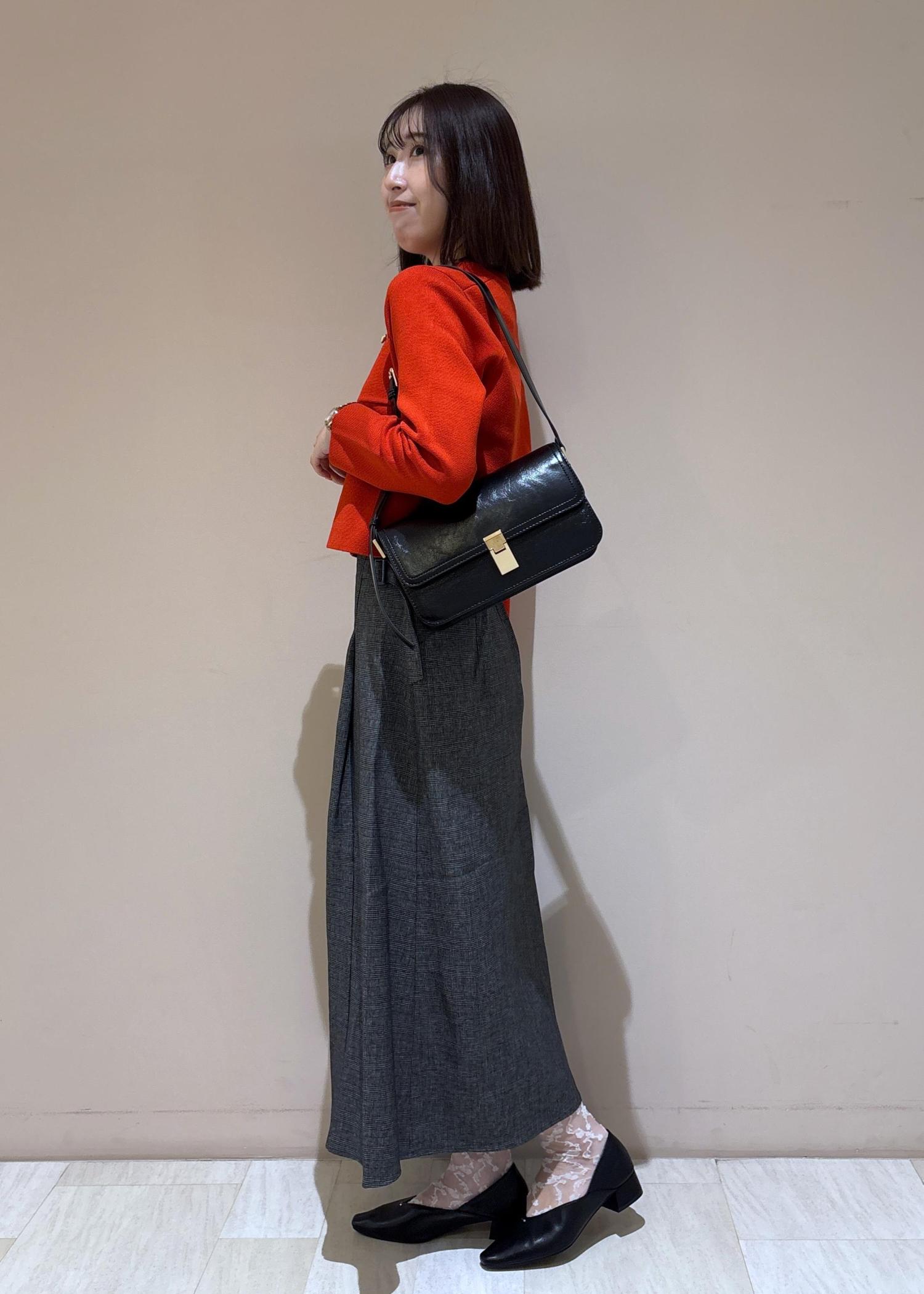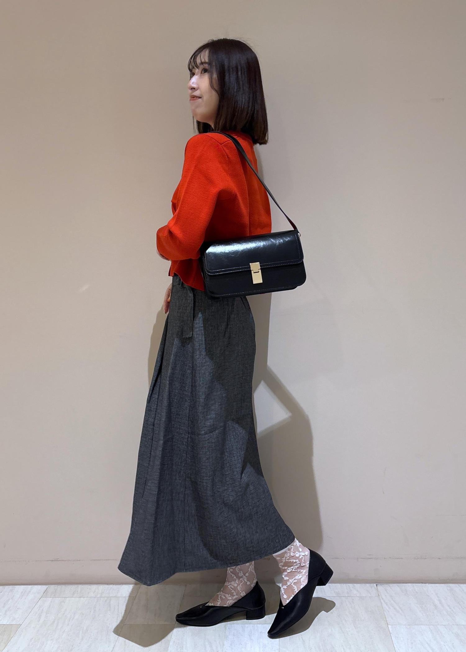 秋らしいレッドをアクセントにして使ったスカートコーデ。