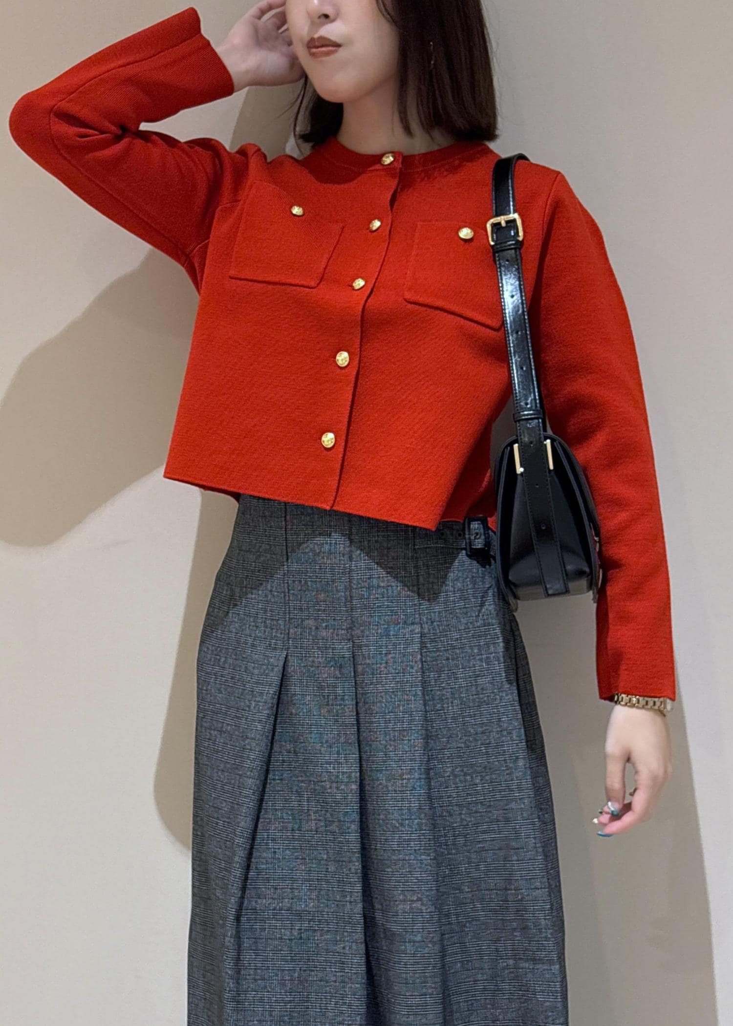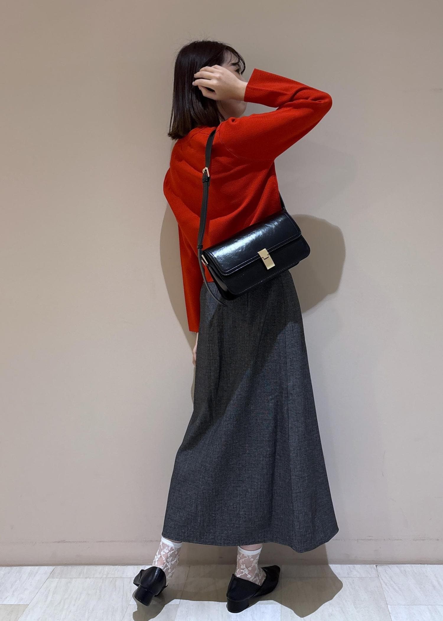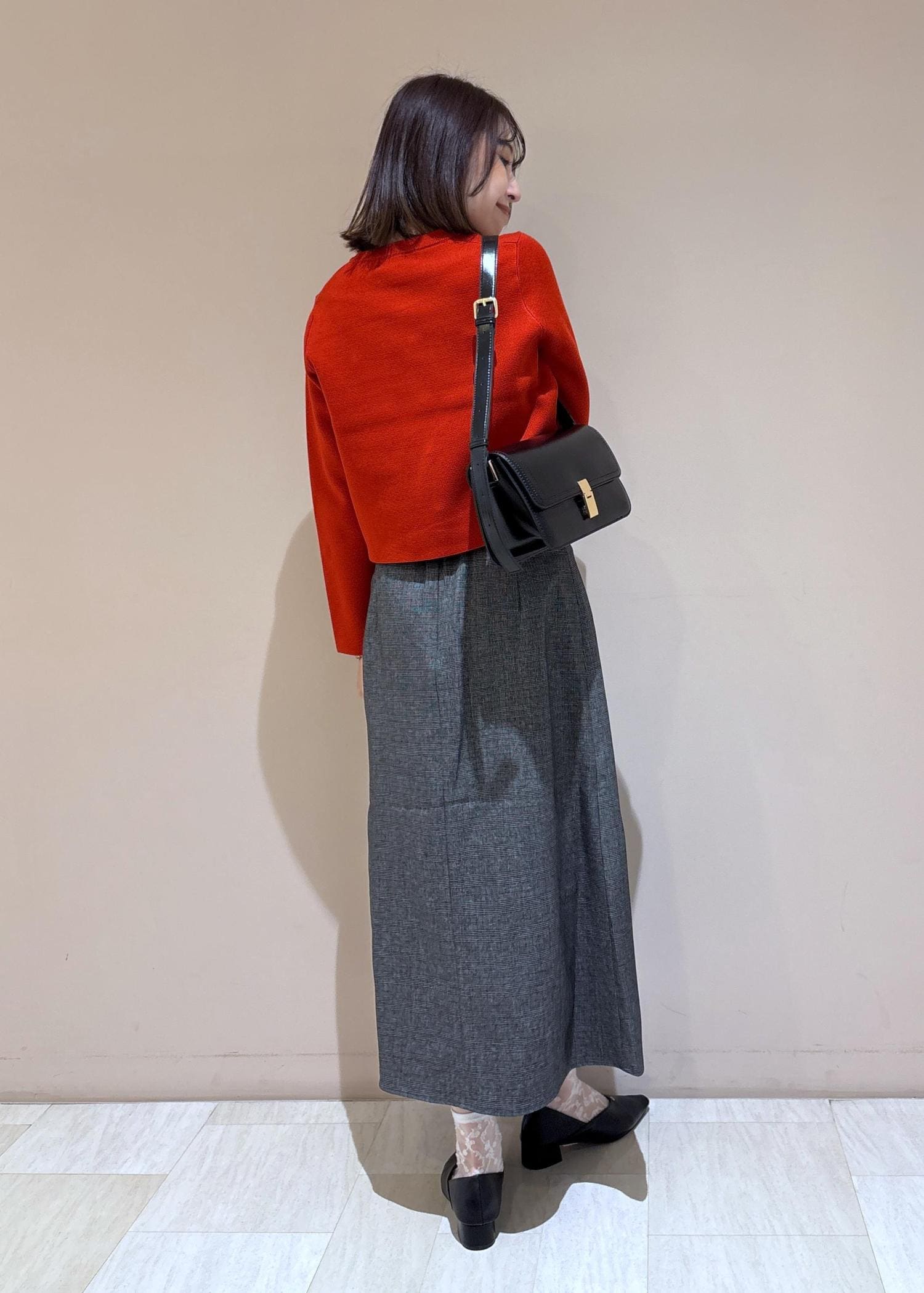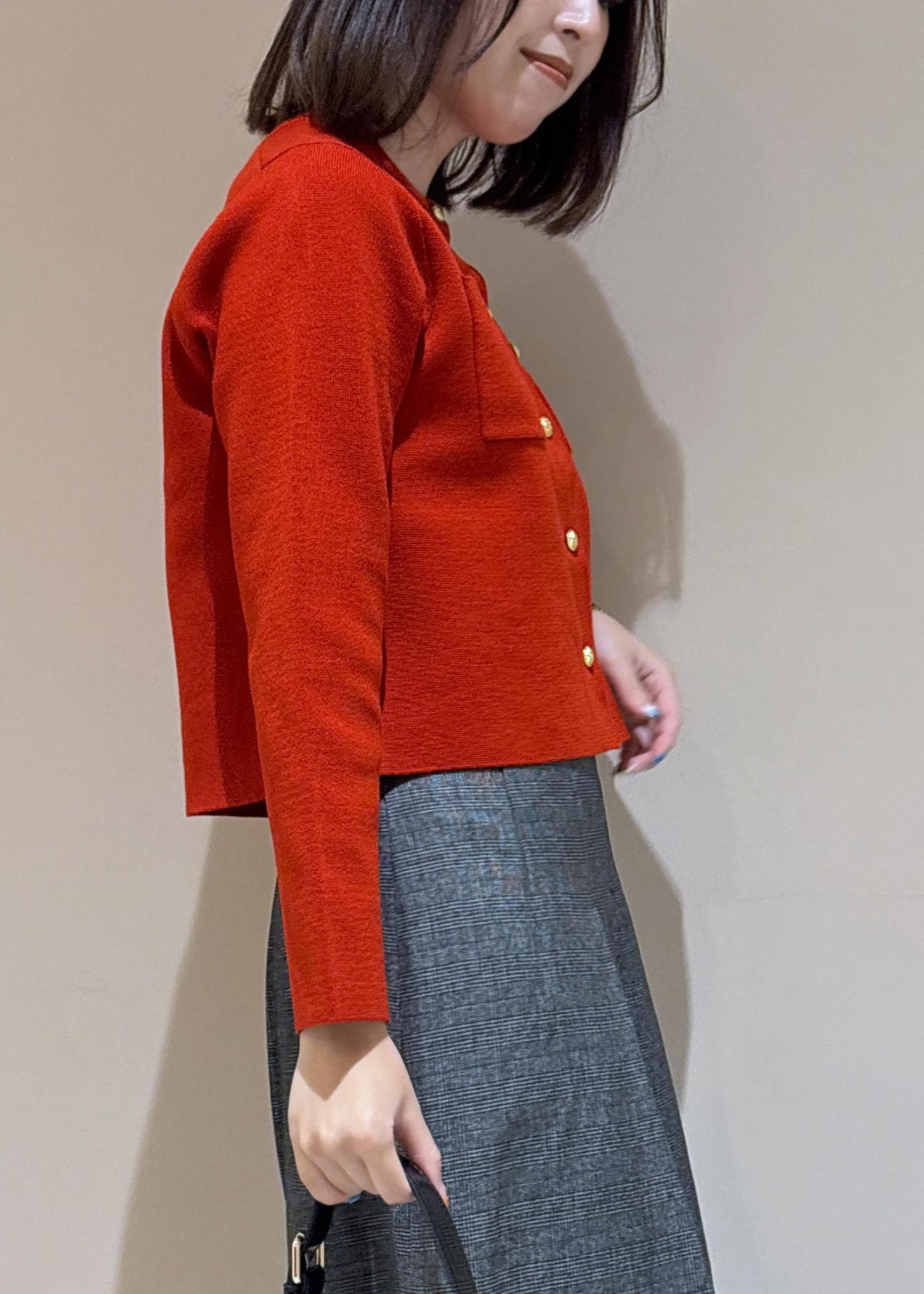 秋らしいレッドをアクセントにして使ったスカートコーデ。
