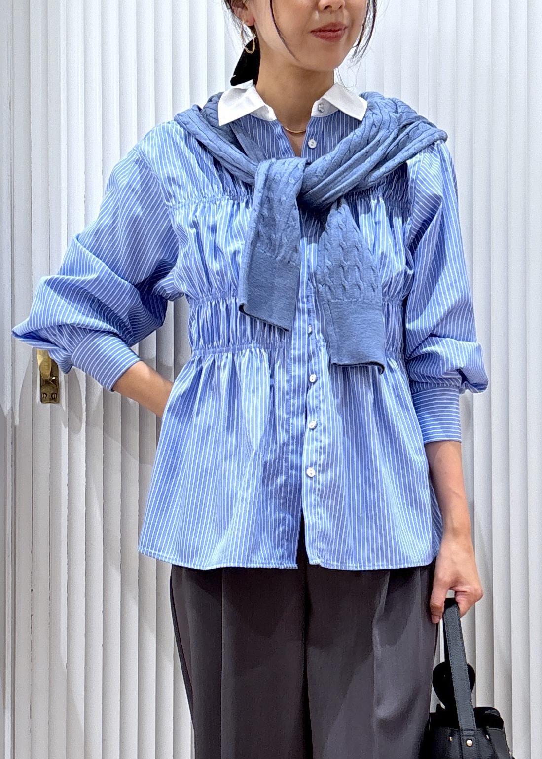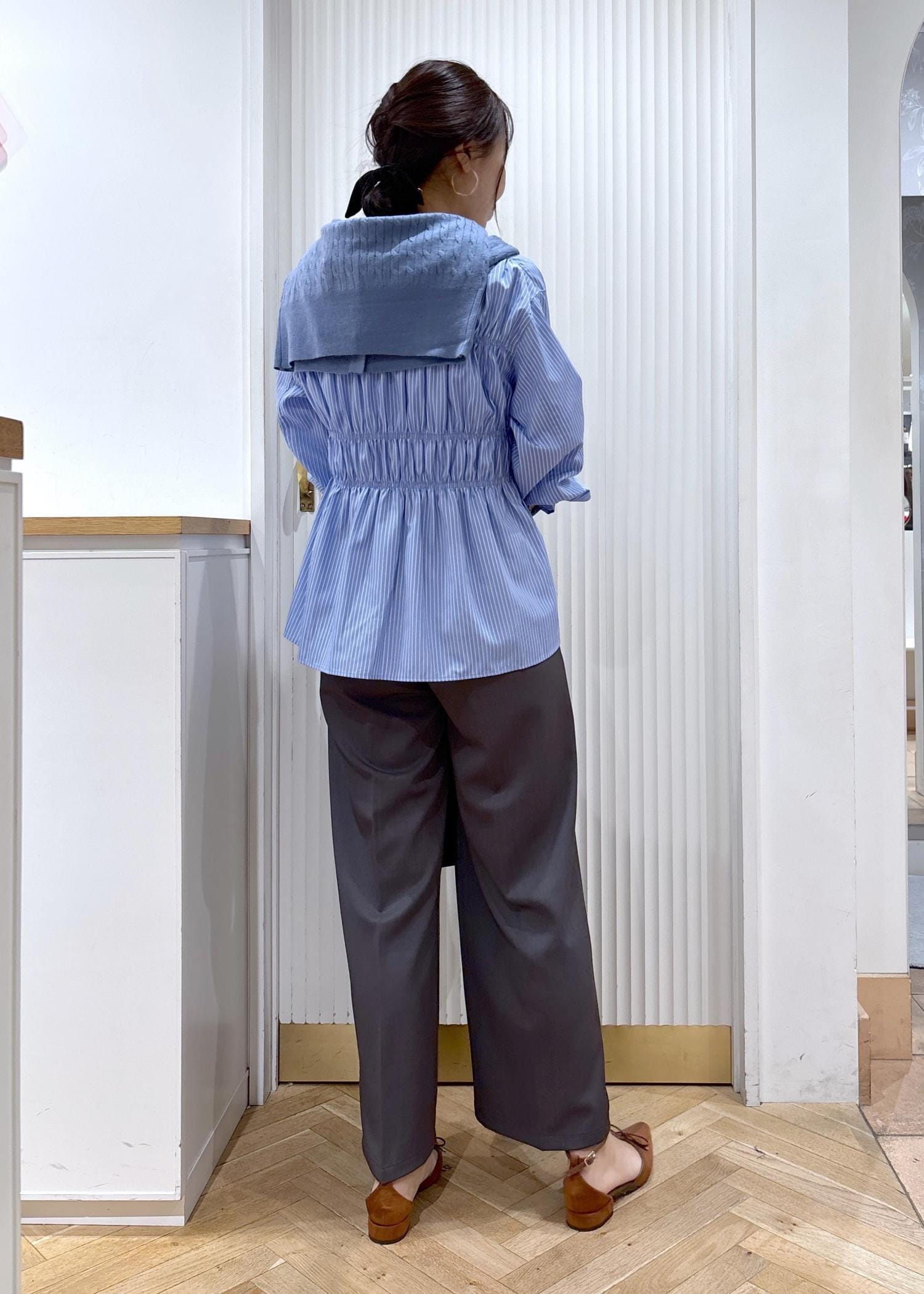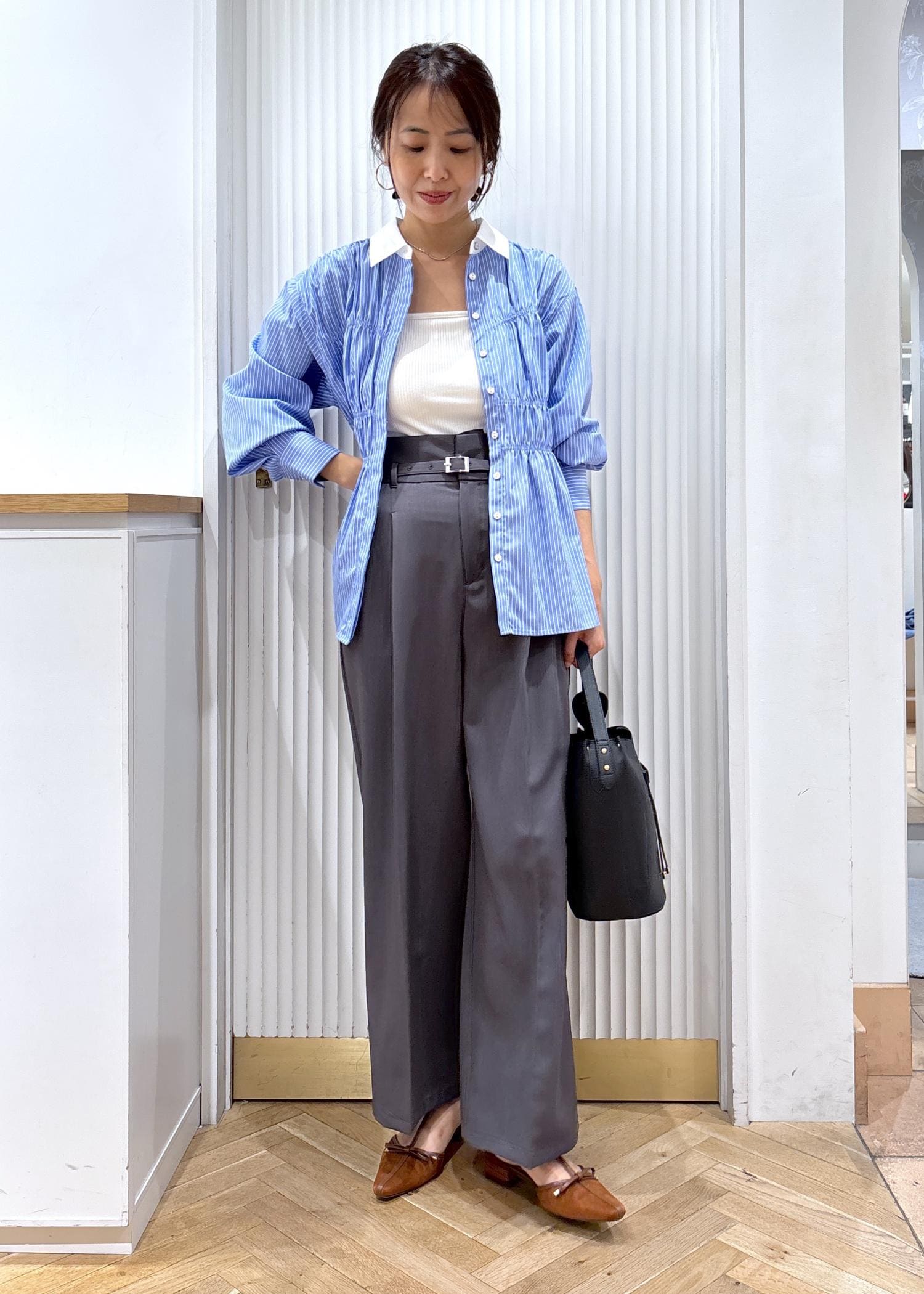 シャーリングが可愛いシャツにハイウエストボトムを合わせたスタイリングです。