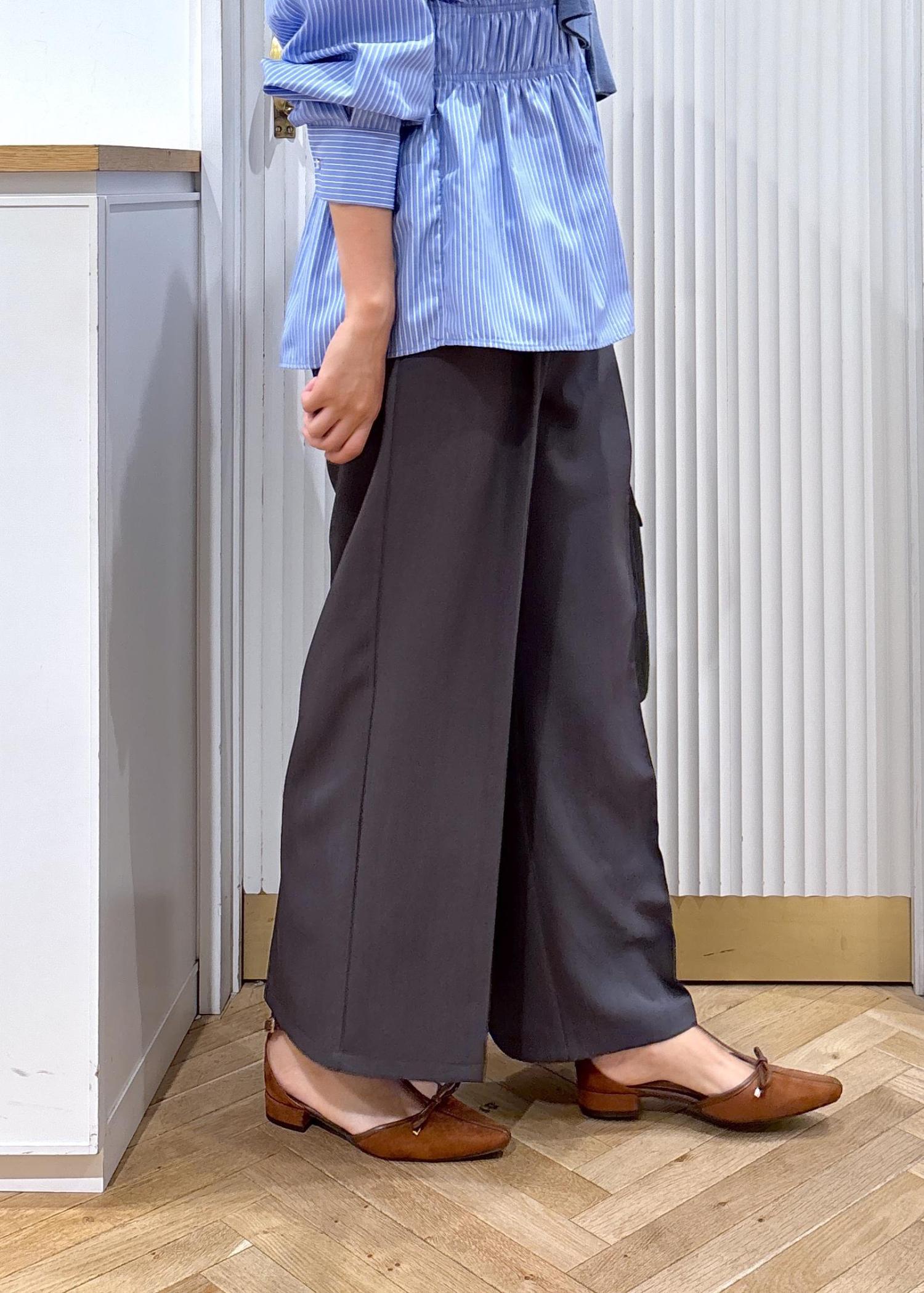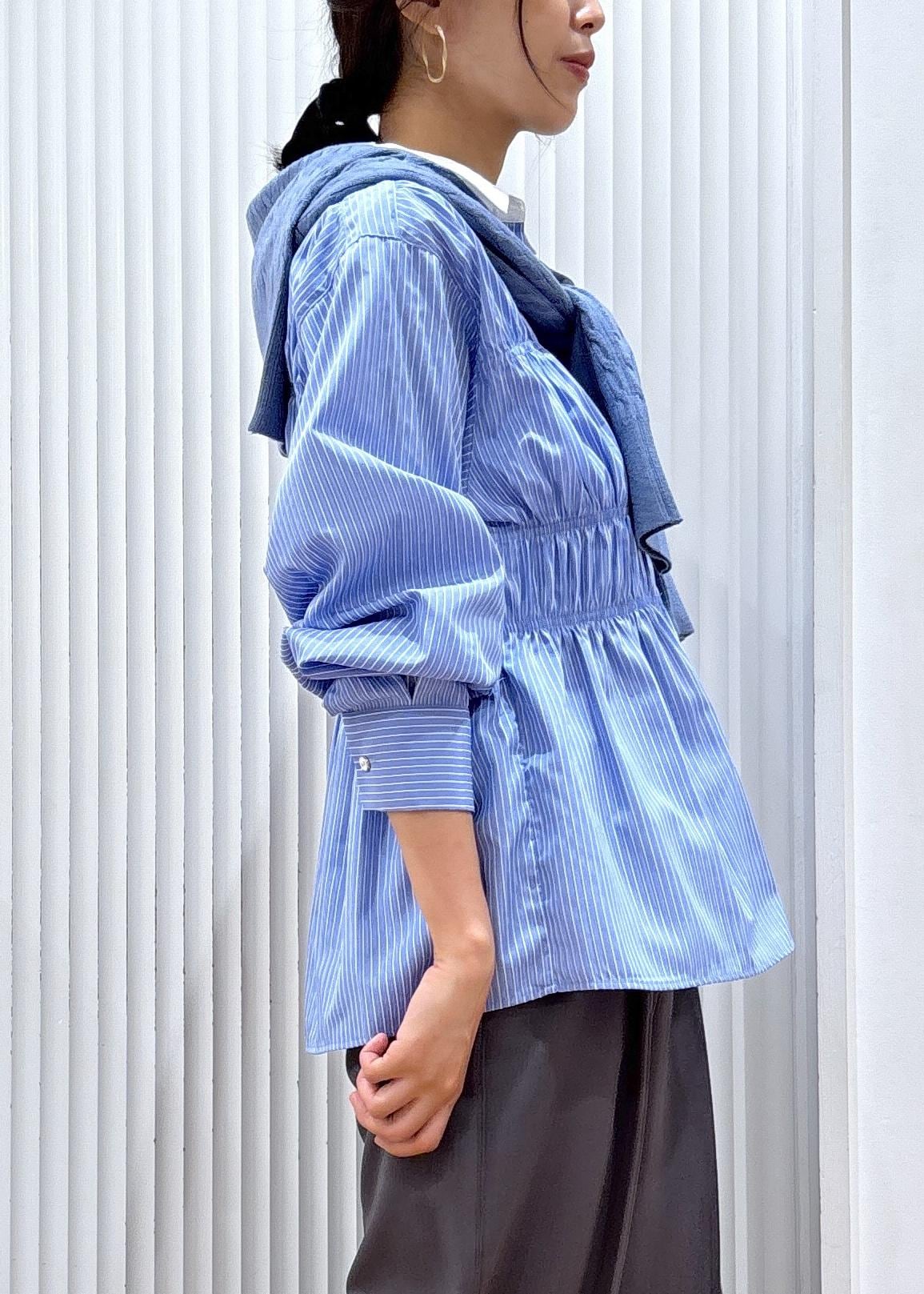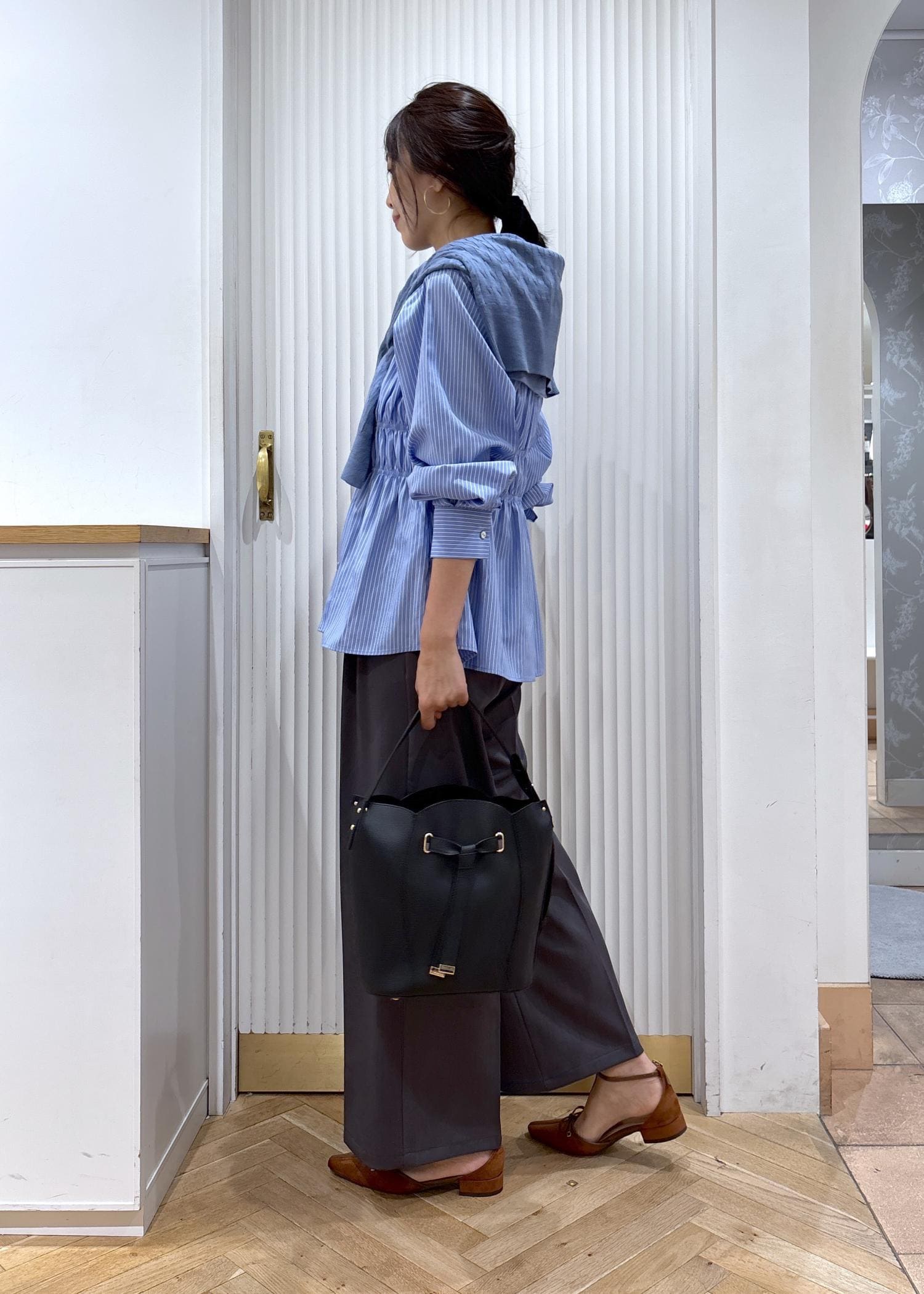 シャーリングが可愛いシャツにハイウエストボトムを合わせたスタイリングです。