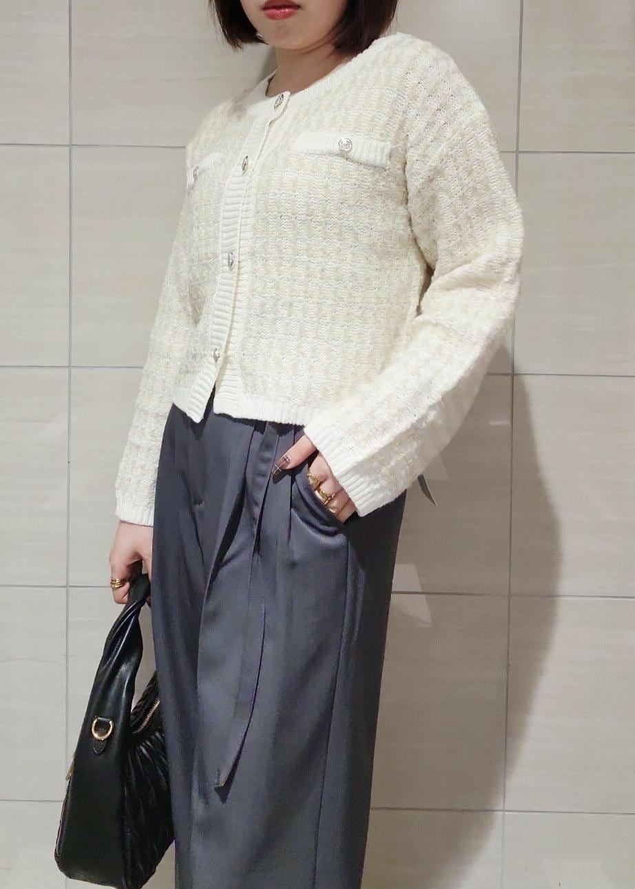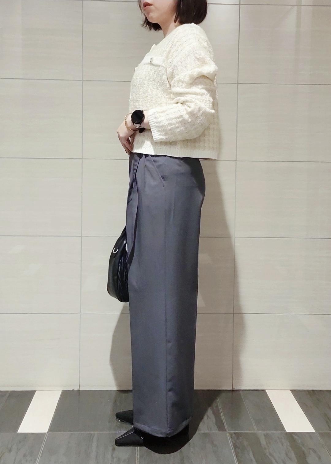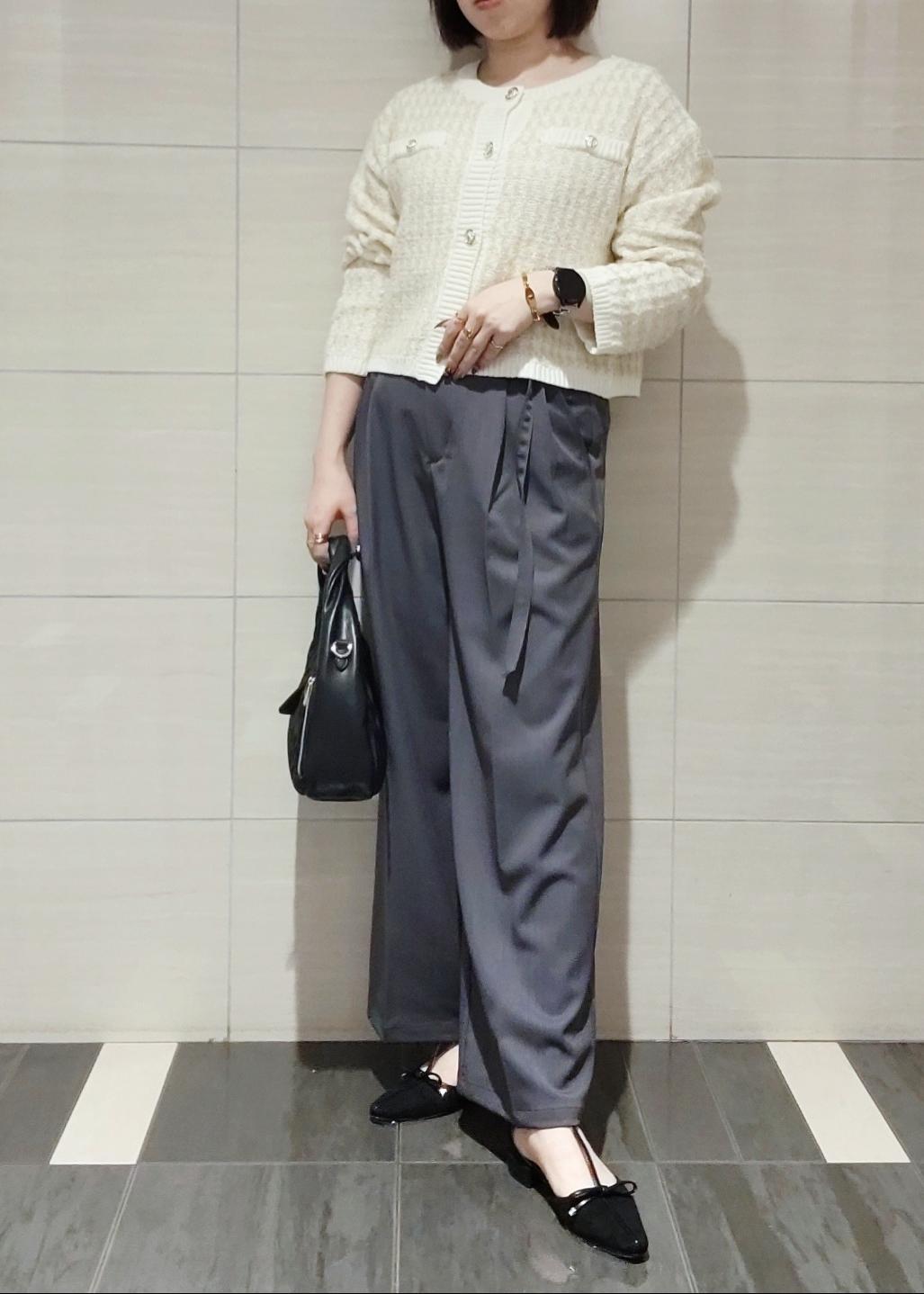 ツィードのカーディガンにきれいめなワイドパンツを合わせてオフィスカジュアルなスタイリングにしました。