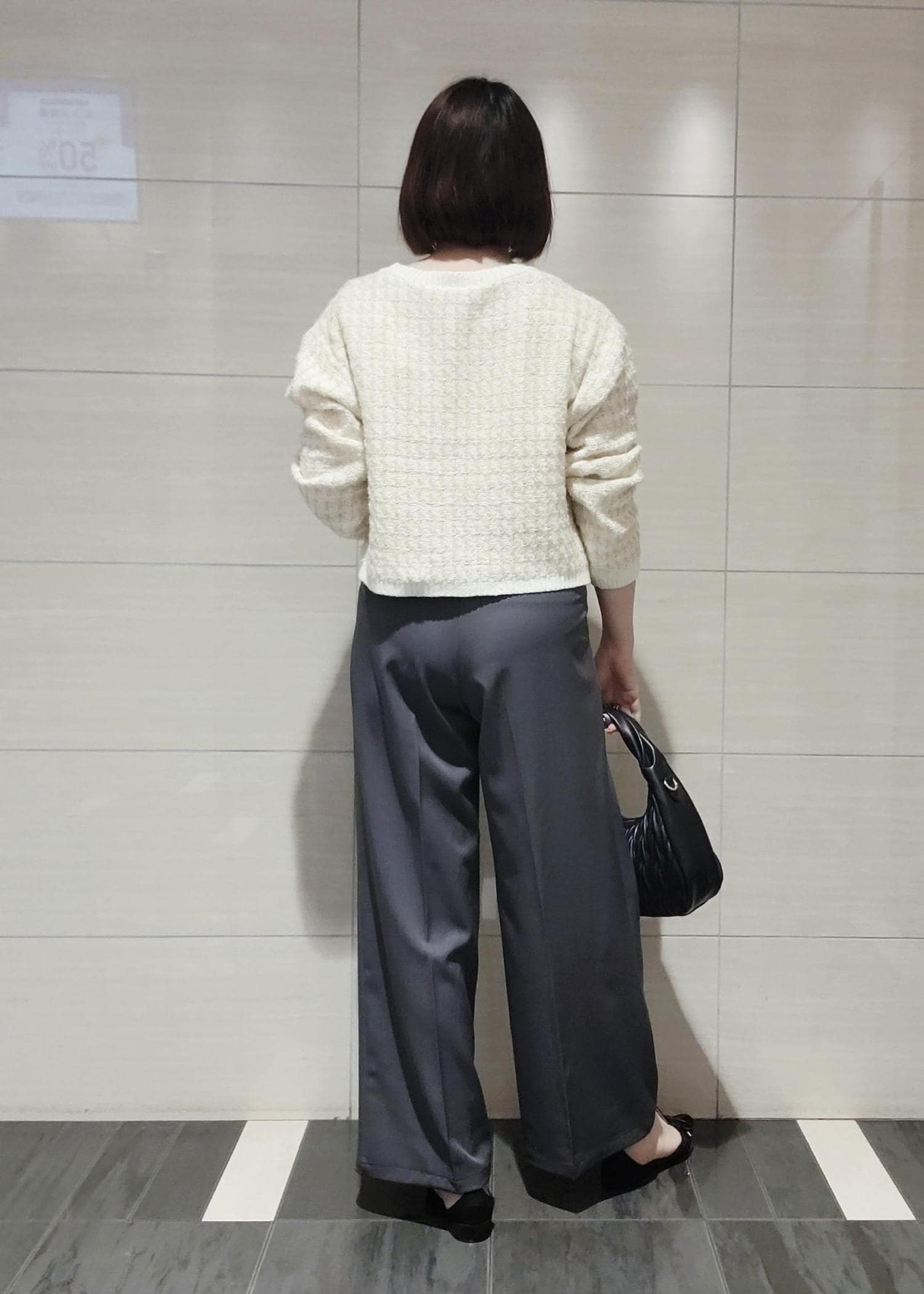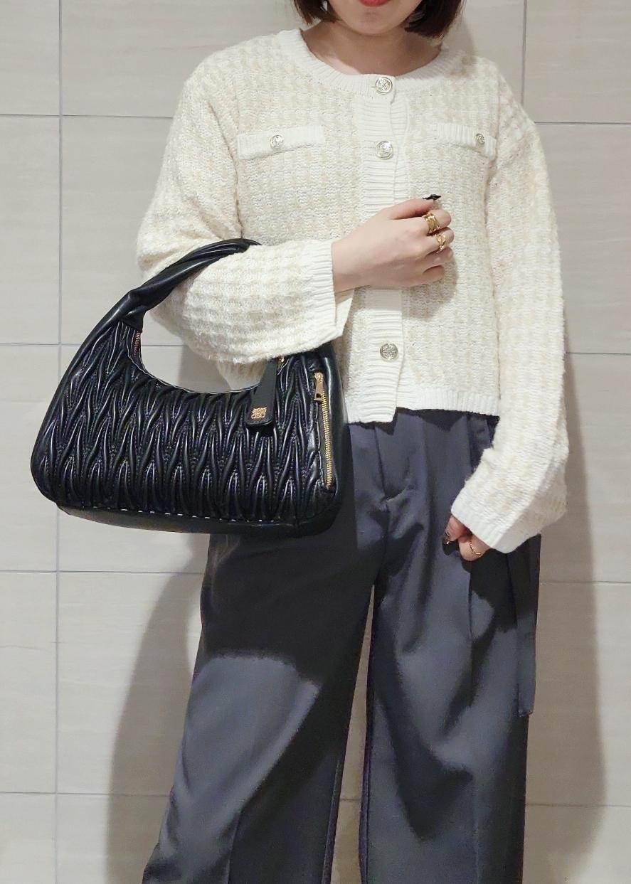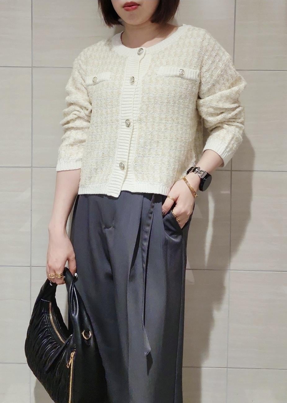 ツィードのカーディガンにきれいめなワイドパンツを合わせてオフィスカジュアルなスタイリングにしました。