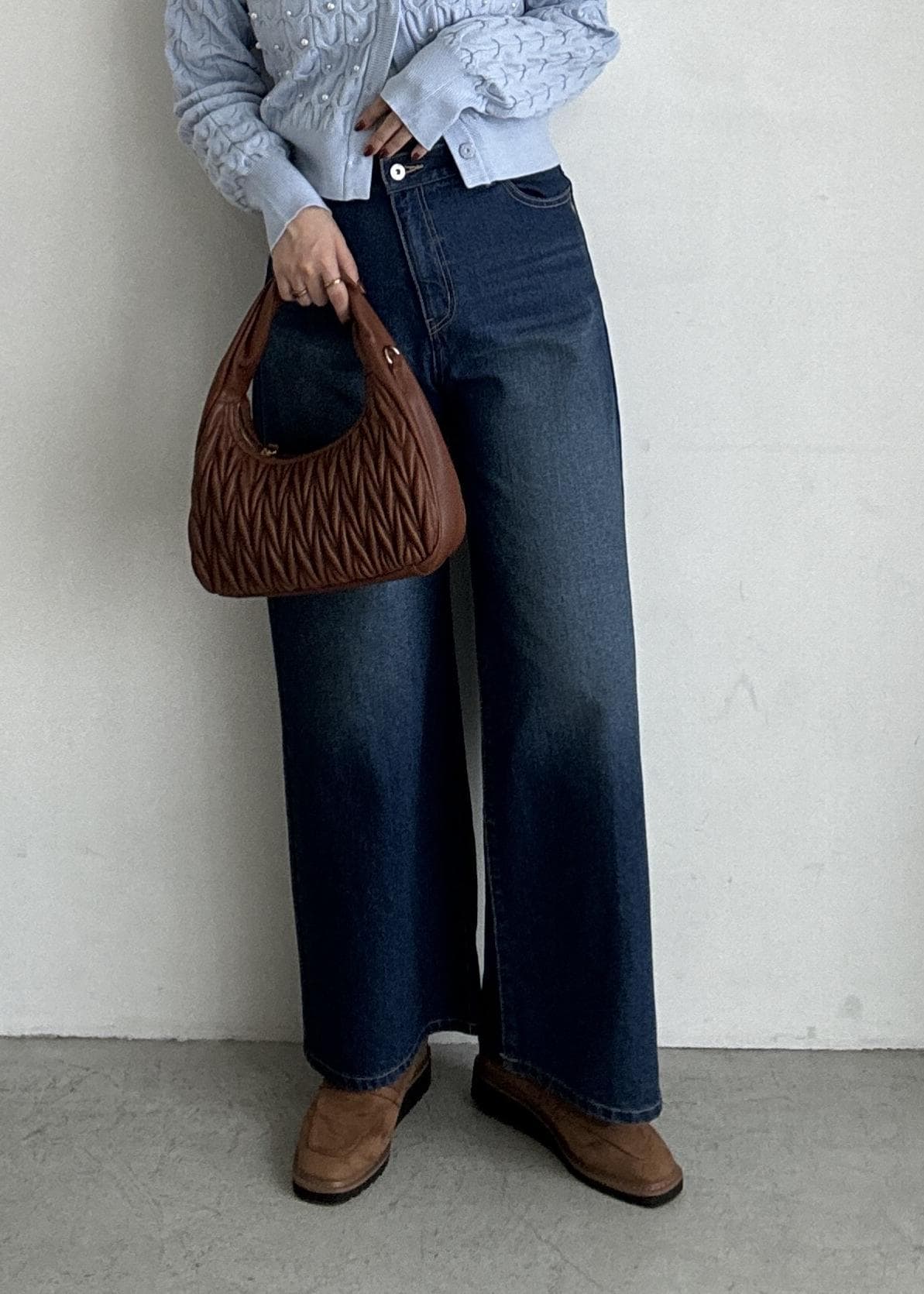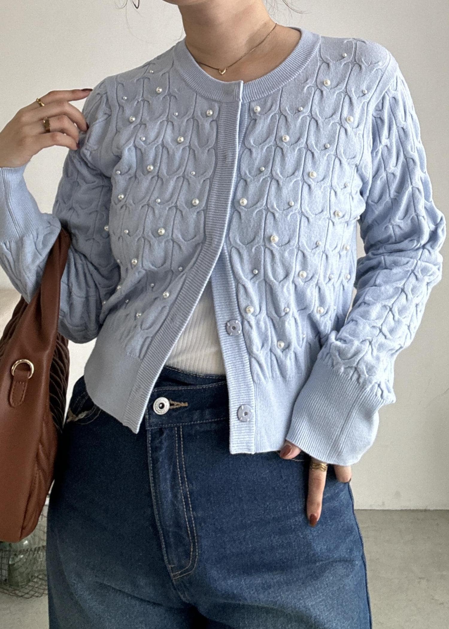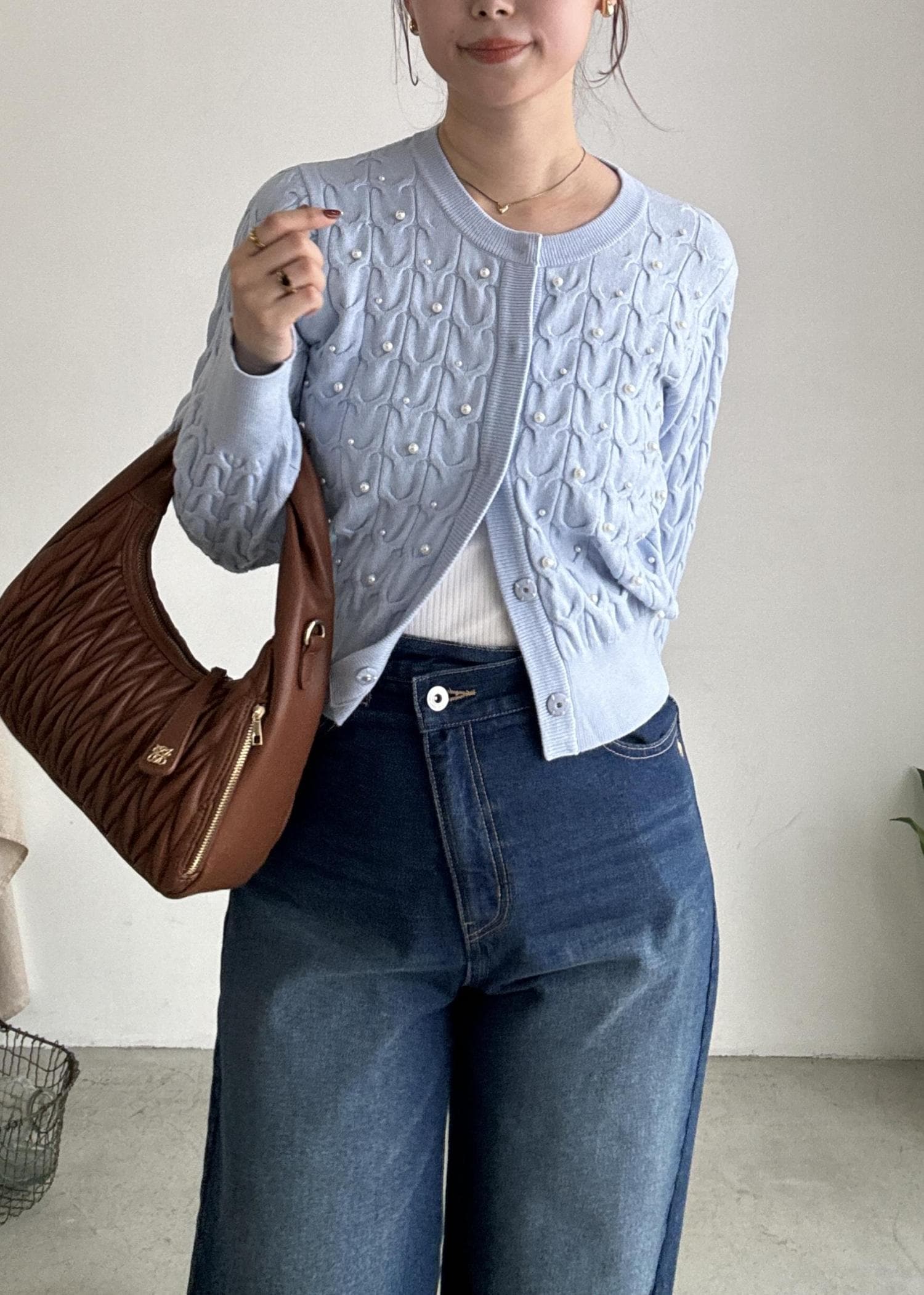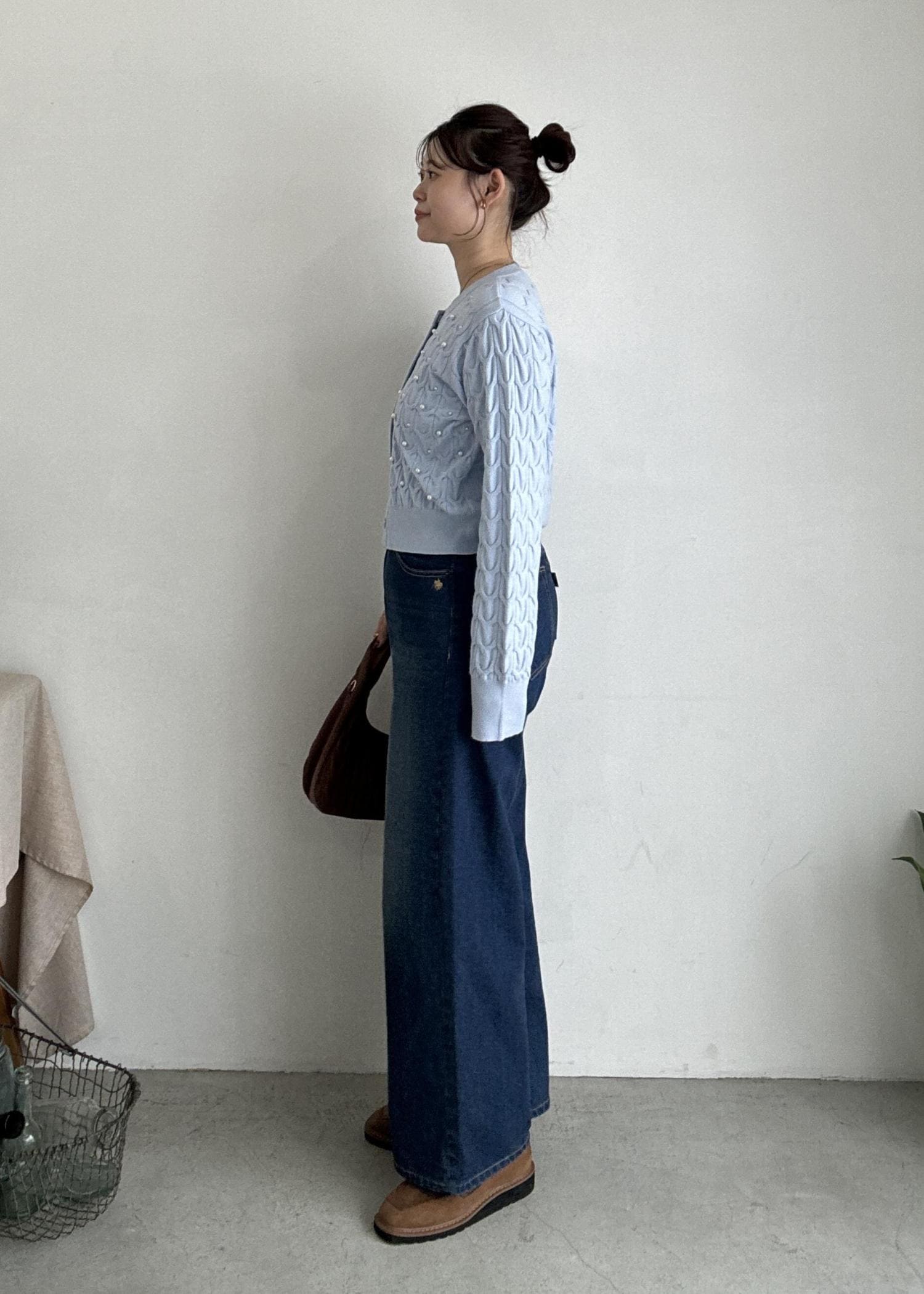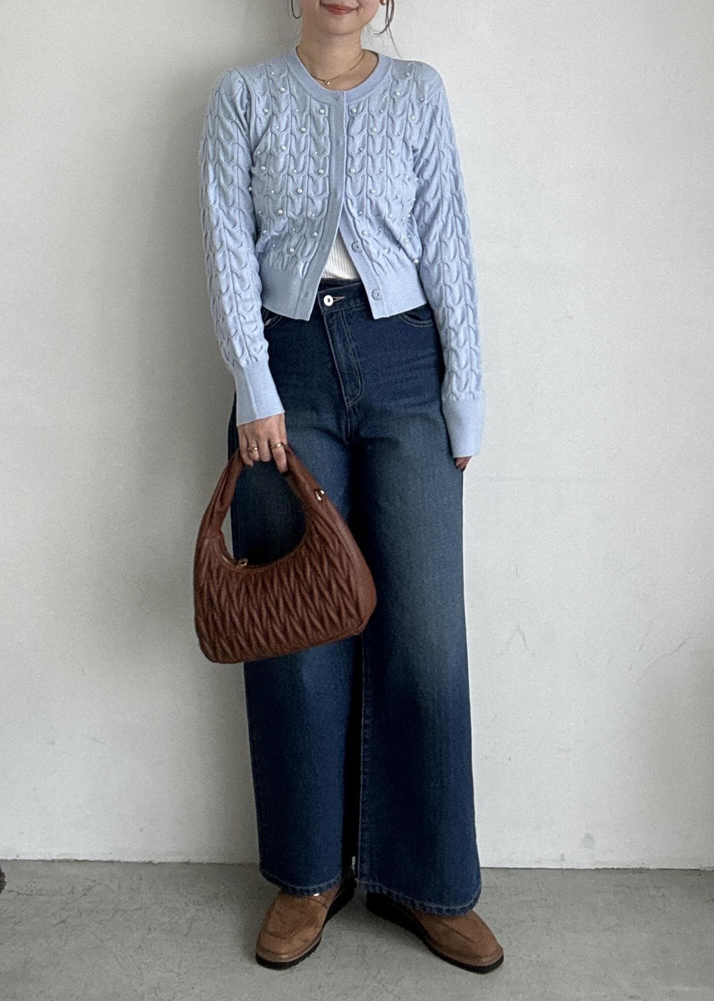 主役級なパールカーディガンは華やかにブルーカラー、デニムを合わせ小物はブラウントーンで涼しすぎない秋っぽさを加えたスタイルにしてみました!