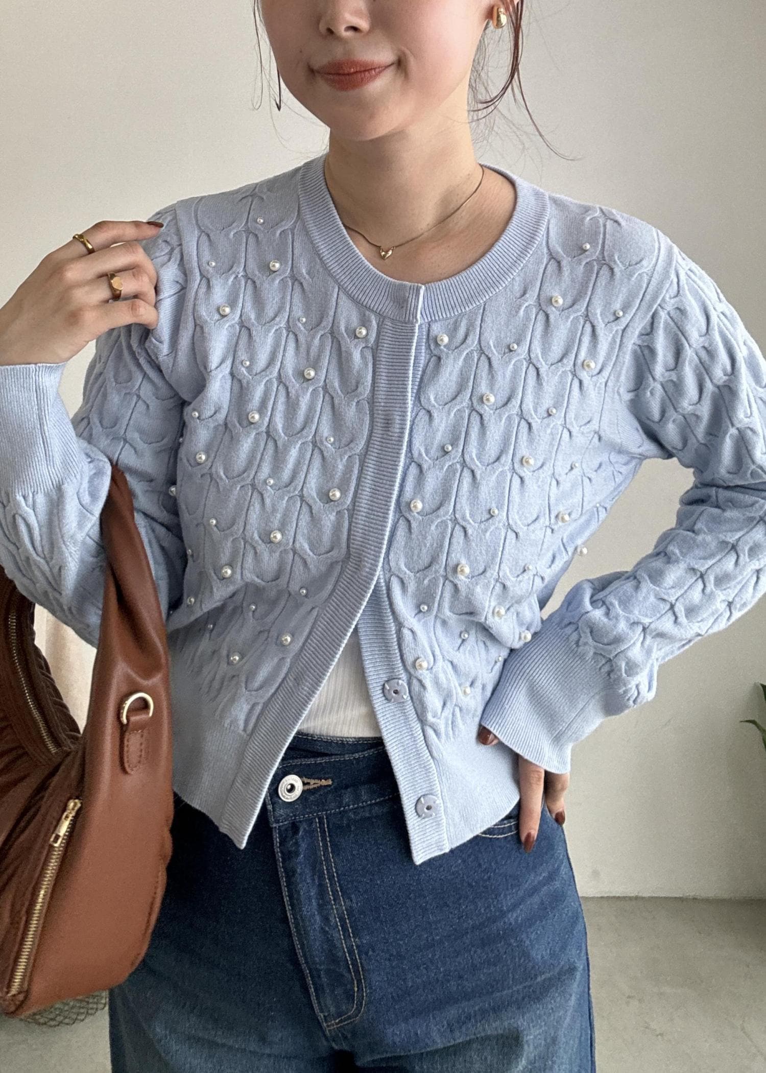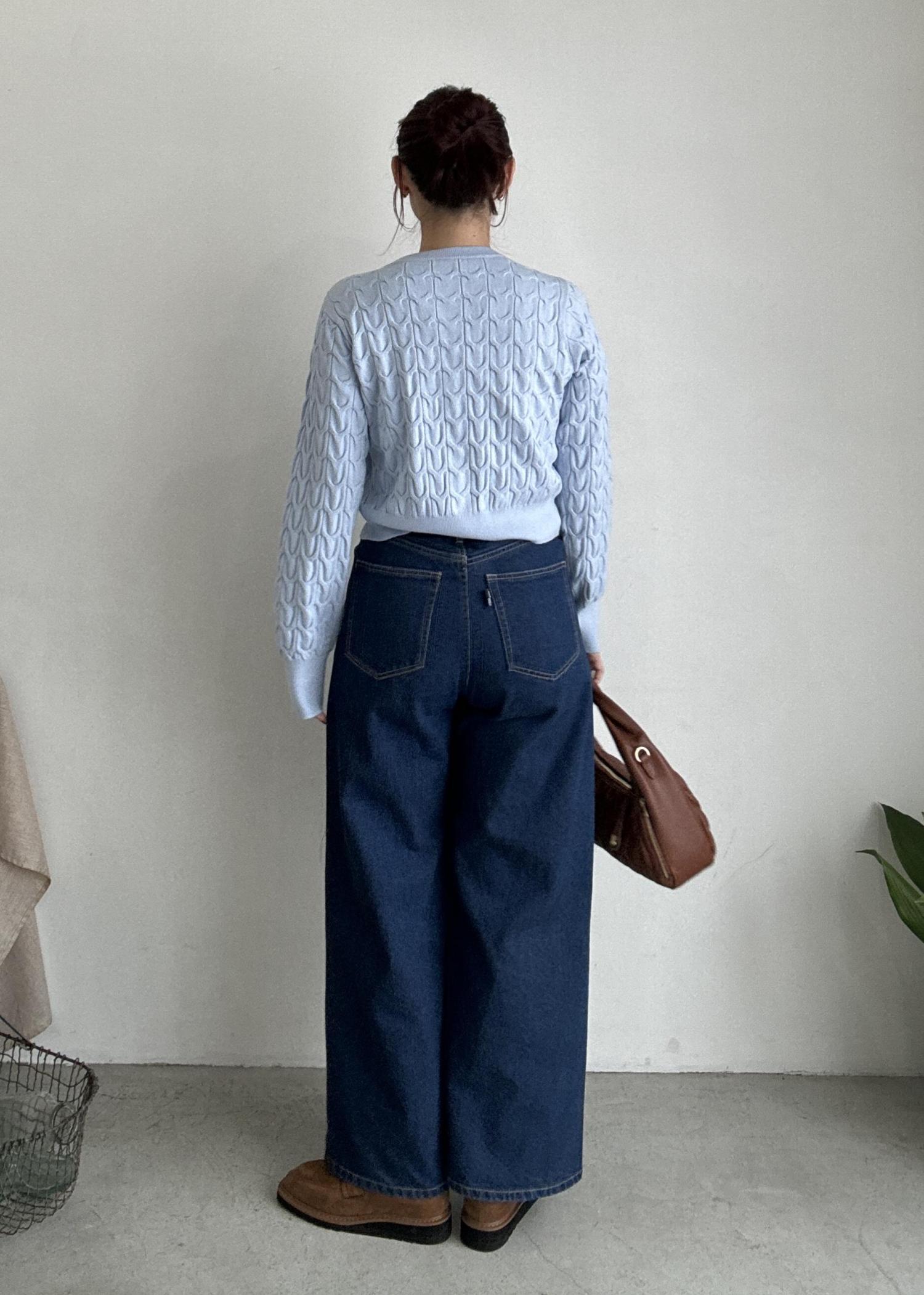 VISパールケーブルカーディガンサックス / F¥6,589レビューリブとケーブルデザインは着心地が柔らかく、生地感は分厚すぎないので、ジャケットやアウターのインナーにも合わせられます!